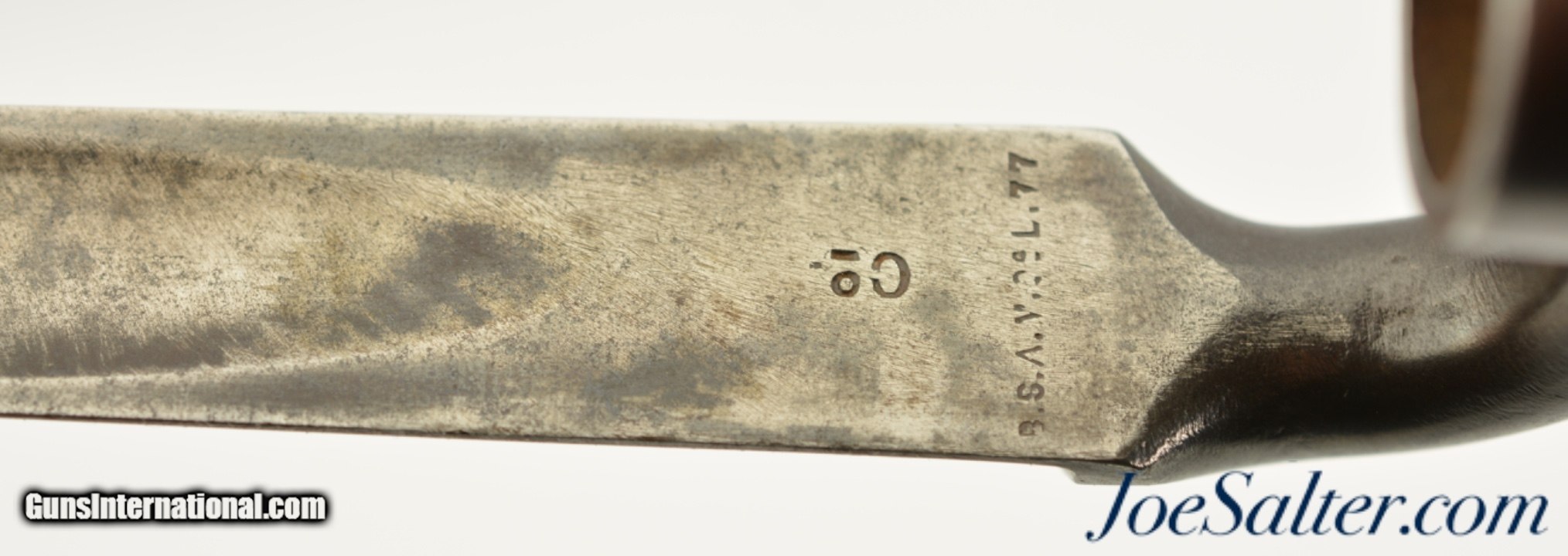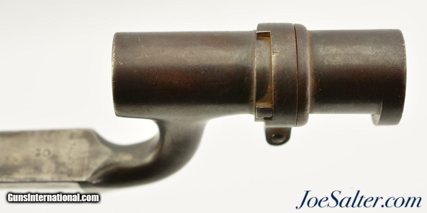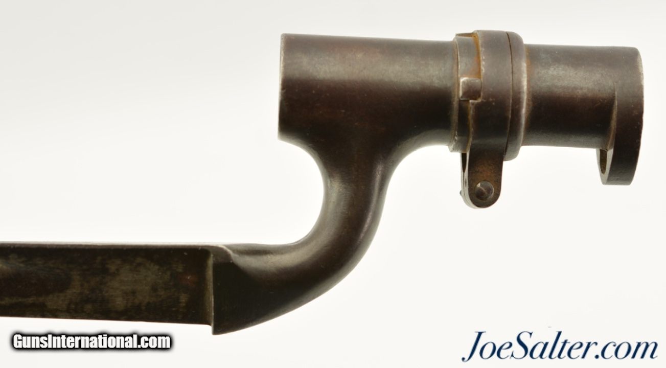 Description: This is a pattern 1876 socket bayonet made for the Martini-Henry, also known as the common long 1876. This bayonet is in very good condition with a socket that has browned to a nice patina and a blade that has some age soiling and a mottled pattern on the surface with a good deal of the blade left in the white. It is marked B.S.A. with an over-all length of 25 1/4" with a 21 5/8" blade, .71" socket. According to Skennertons book, British & Commonwealth Bayonets, of the approximately 500k 1876's that were made, about 10k made by B.S.A were rejected for "water reins" a minor flaw. Later some of these rejects were sold to the colonial governments and the rest scrapped. That being known this bayonet is mark as a B.S.A., year 1877 manufactured bayonet but has no proofs or British military acceptance marks and the only other mark is a 2 on the rifle side of the socket. SOLD |