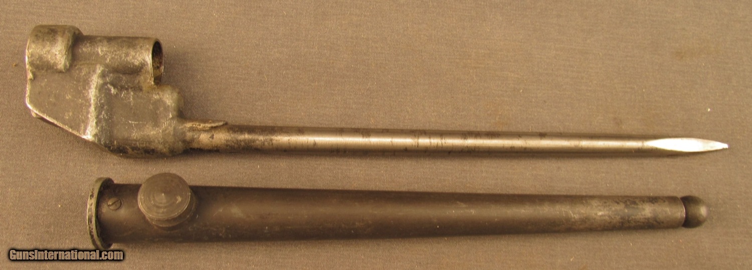 Description: This late war spike bayonet has crude welds, brazed spike and rough finish. Socket shows 60% black paint. Spike has staining and light discoloration. These were built in 1944 and 1945 only at Joseph Lucas Ltd. This comes in a MK 1 scabbard with 80% blue finish. SOLD Manufacturer: Enfield Model: No.4 |