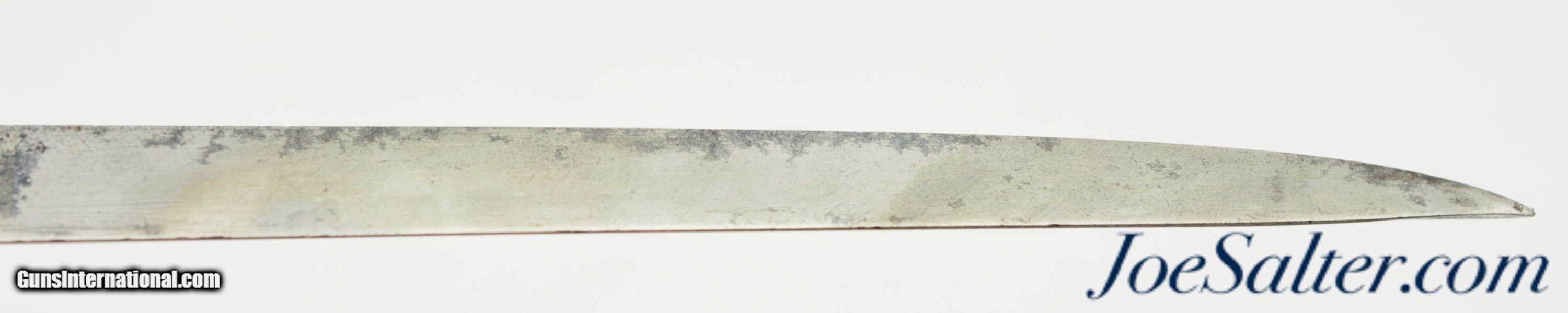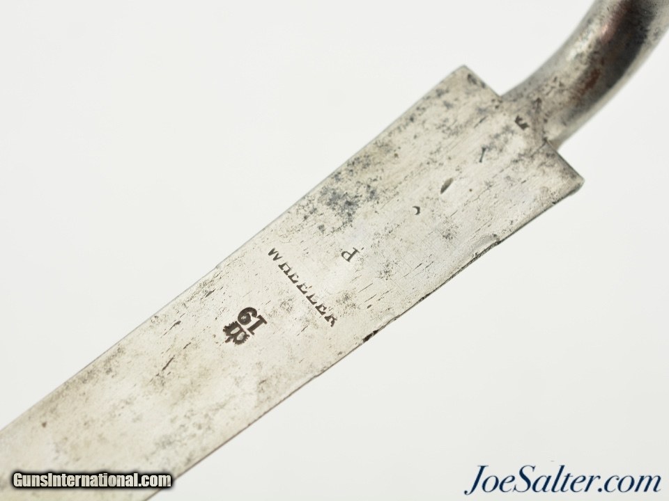 Description: This is a British P-1842 Socket Bayonet for use with Lovell Catch on the 1842 musket and 1851 Minie rifle. This bayonet is in very good original condition with bright finish 17" blade with many signs of use with a bit of mottling and nice tip. The ricasso carries many stamps and makers marks, WHEELER being the maker. The back of the 3" socket is also stamped. Over-all a very nice example. Please see photos for finer details. SOLD |
