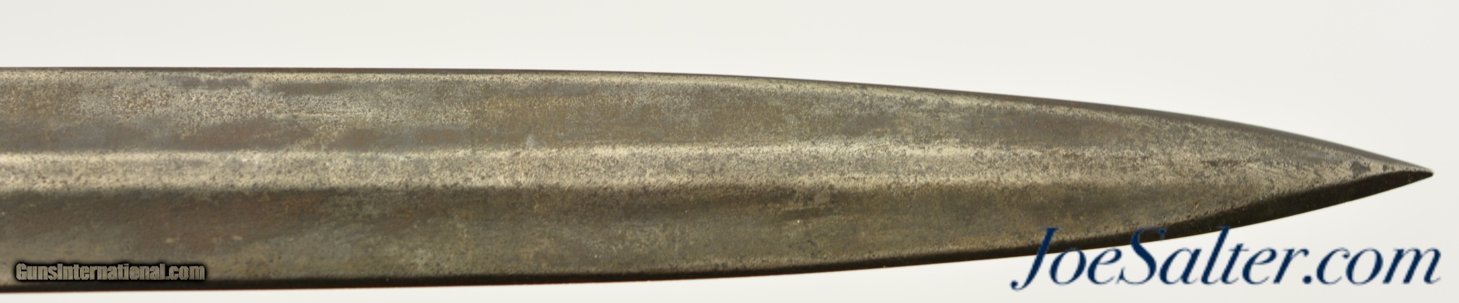 Description: This is a rare matching numbers Lee Metford Rifle, Pattern 1888 Bayonet. Dated February '01 (2'01), with Enfield - "EFD" and War Department broad arrow stamps on bayonet. It is an early pattern design Mk II with brass riveted handle with a drain hole drilled through pommel. The overall condition of this unsharpened bayonet is very good with only light corrosion on the ricasso and pommel. OA 16.6" Blade 12". SOLD |