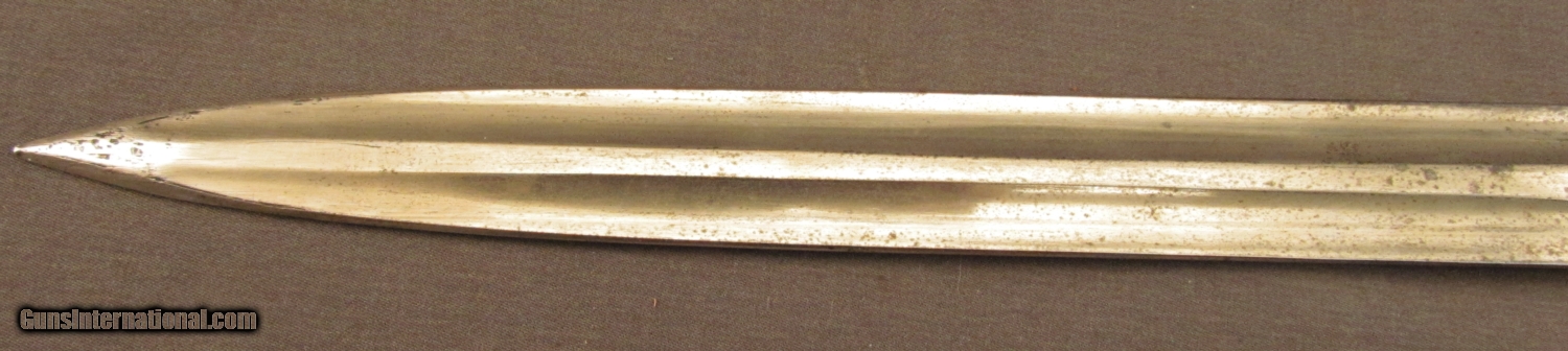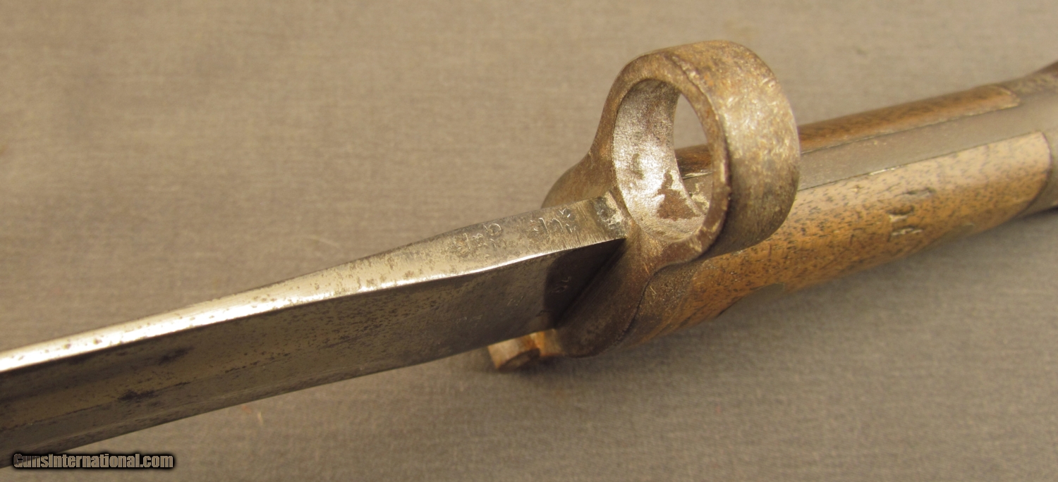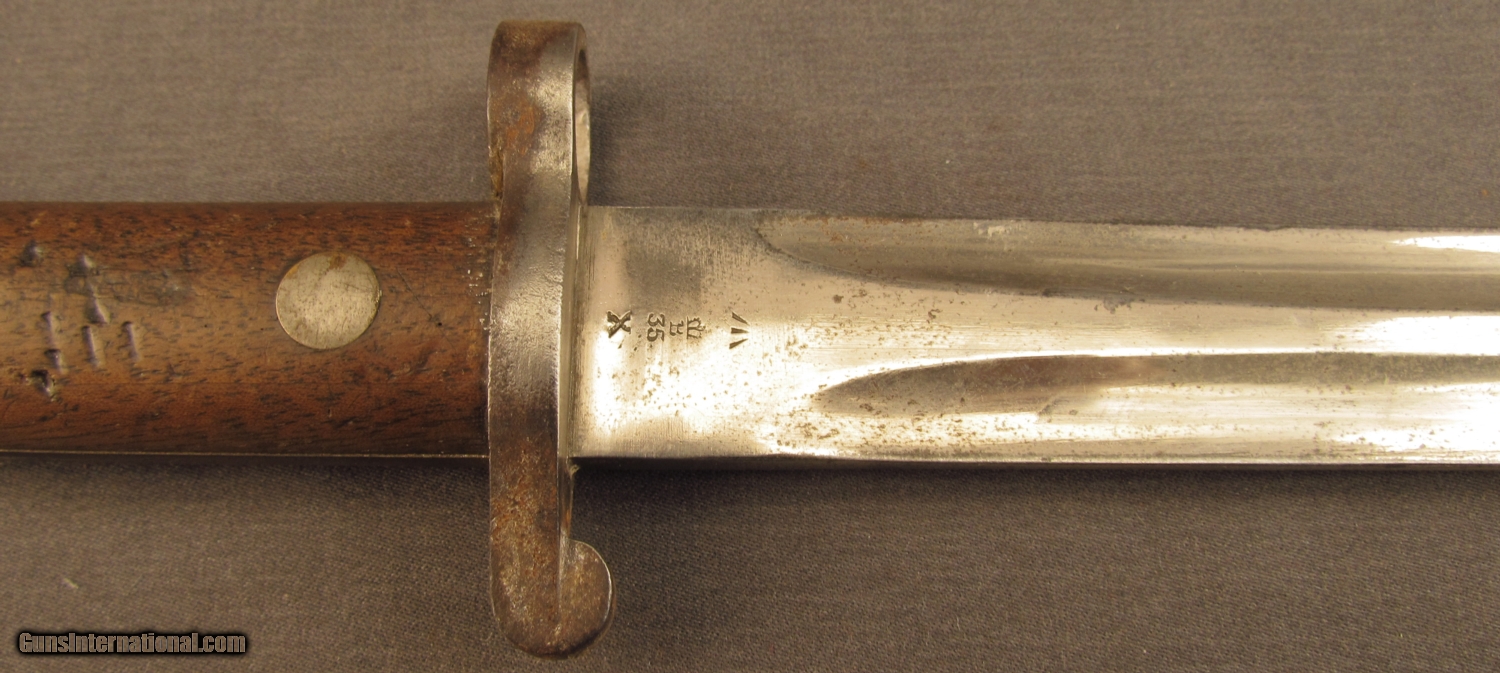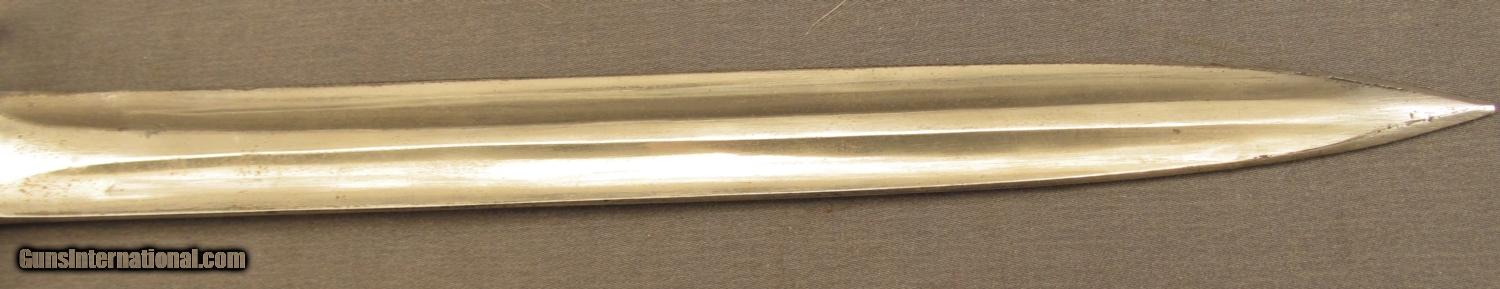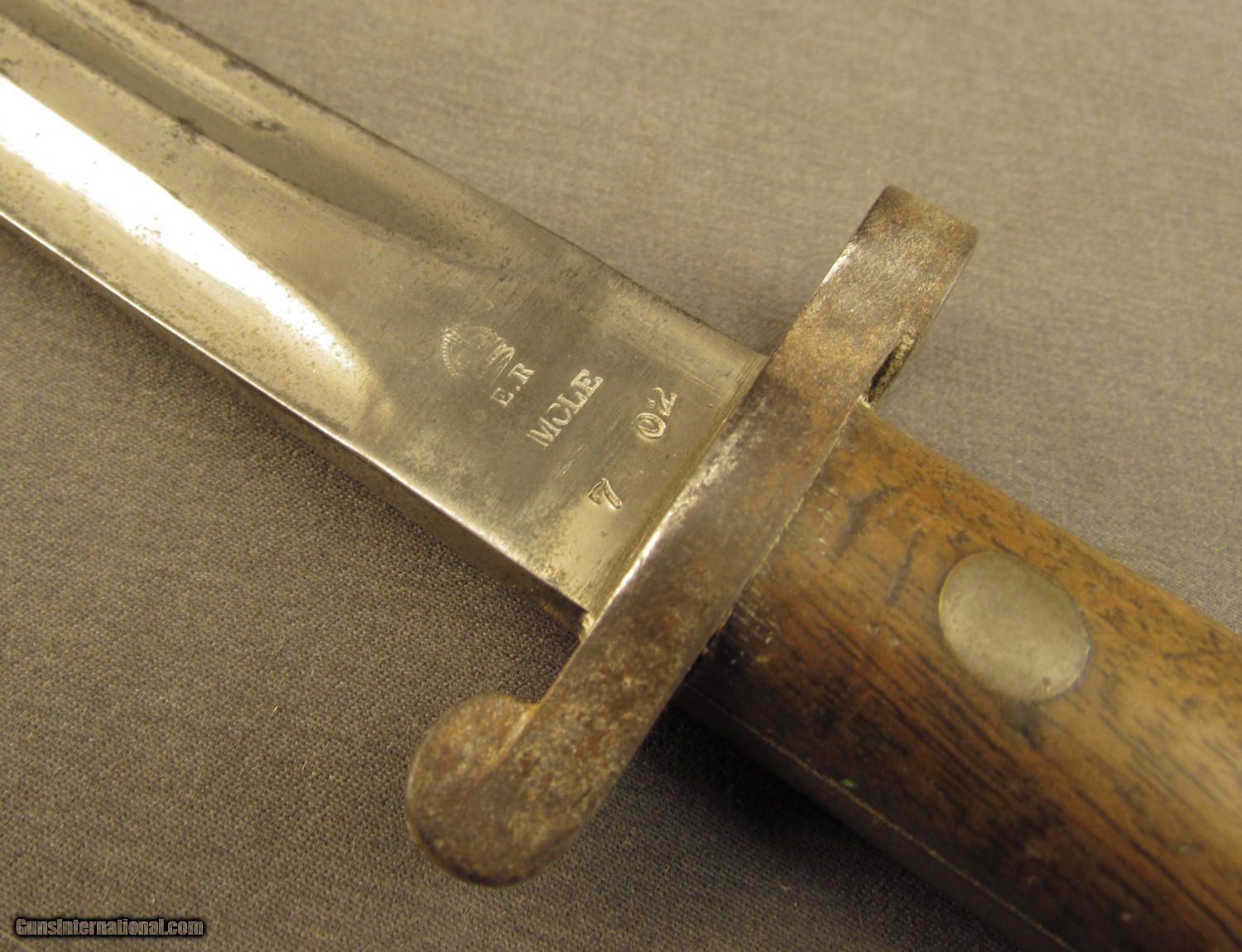 Description: Double edged bayonet 16 3/4” overall length with 11 /8” unsharpened blade. Ricasso marked “CROWN/ER/MOLE/7 02” Wooden grips secured by brass rivets. No scabbard. SOLD Manufacturer: British Model: Bayonet |
