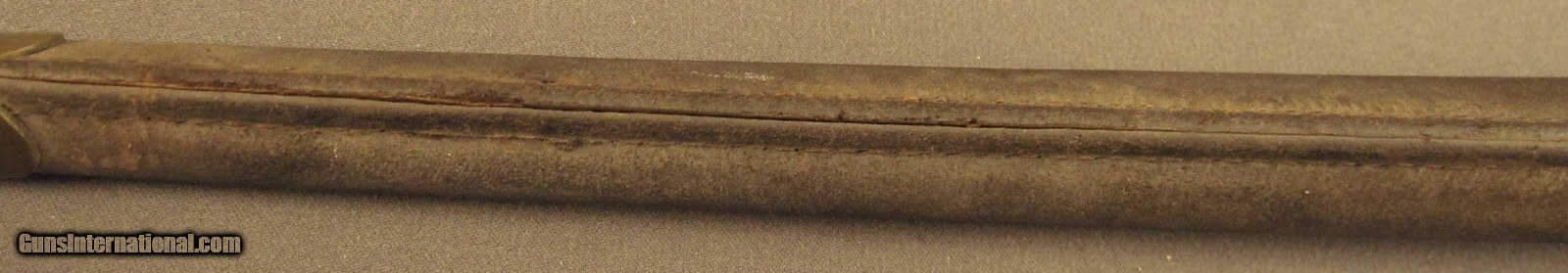Description: This bayonet was altered to P1853/72 configuration with socket reduced to fit Martini Henry Rifles at R.S.A.F. Enfield in the early 1870's. Blade is bright with minor stains and British military markings. Socket and ring retain 90% dark blue finish. Comes in correct brass and leather scabbard with wear to leather surface and nice patina on brass. A fine bayonet for the collector. SOLD Manufacturer: British Model: Bayonet |