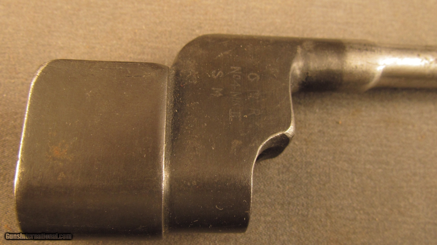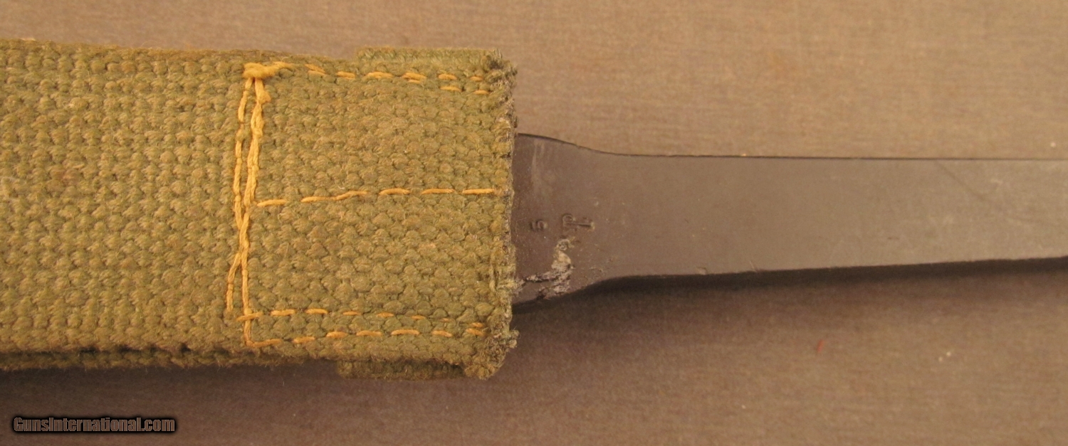Description: This bayonet remains in very good condition with 70% blue on socket and bright spike. Socket shows "SM" marking indicting Singer Manufacturing Co of Scotland as maker. This comes in a USM5 Victory Plastics scabbard with integral frog in very good condition. SOLD Manufacturer: Enfield Model: No.4 |