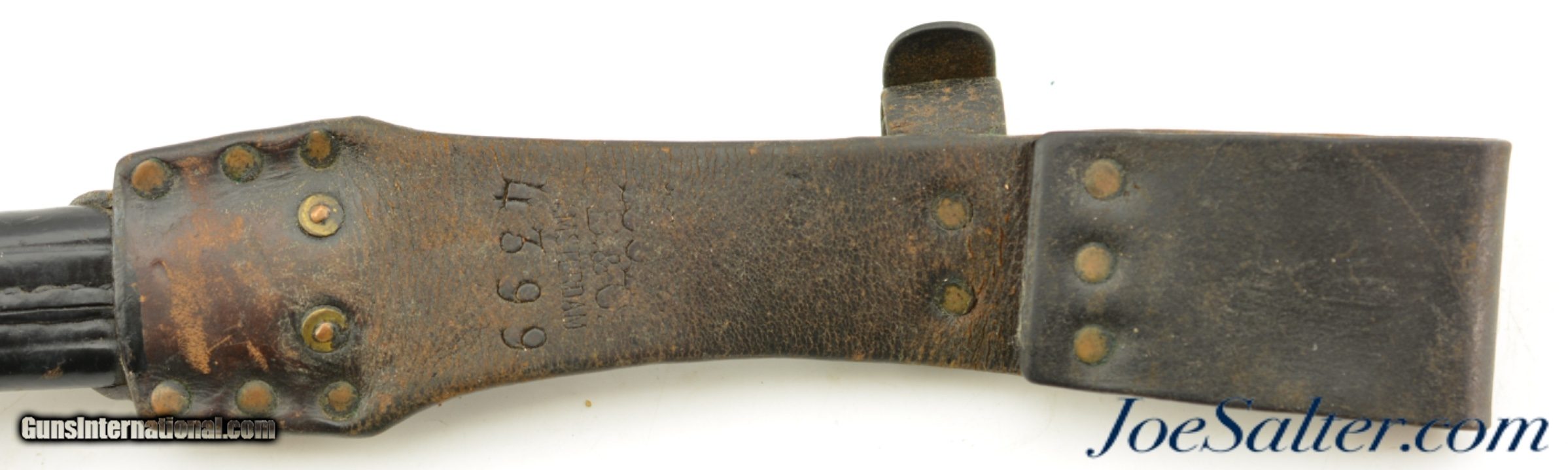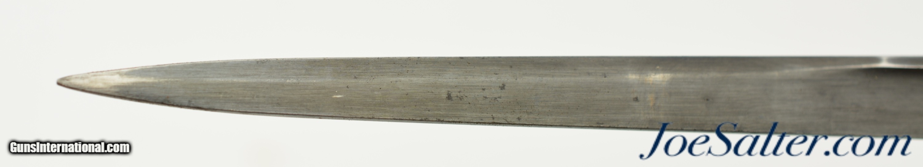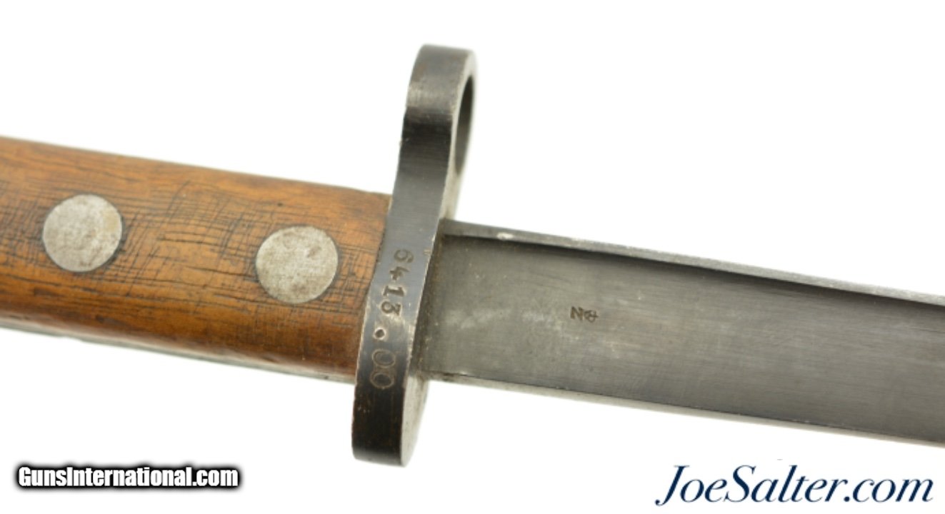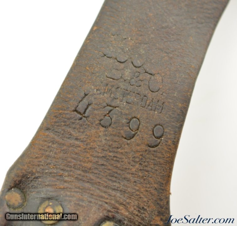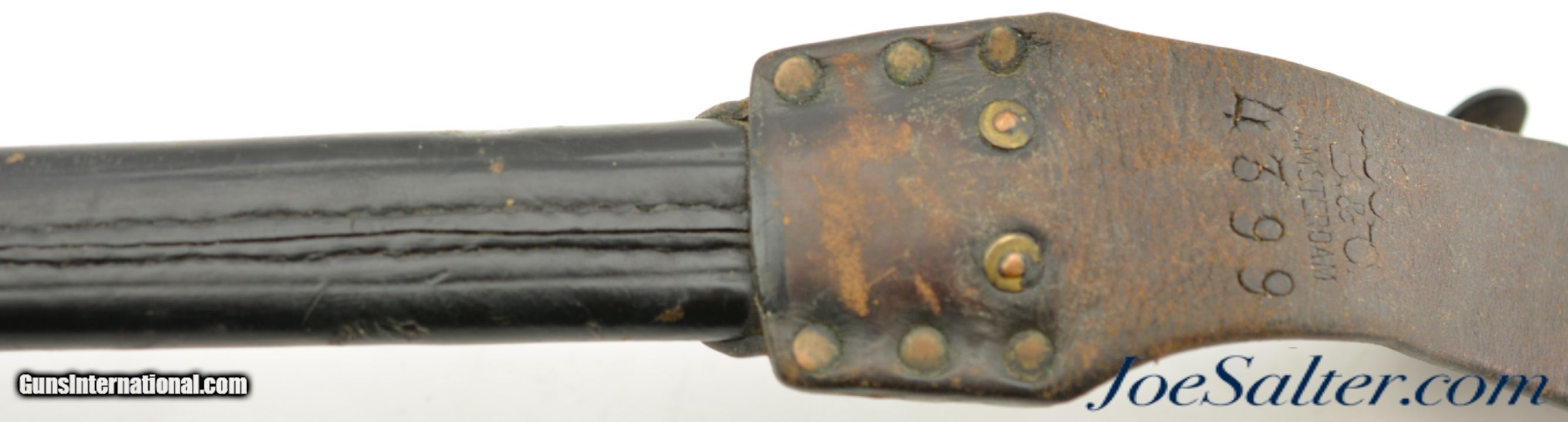 Description: This is an original 2cd model, Netherlands/Dutch 1895 Bayonet for the Dutch Mannlicher rifle, manufactured by Hembrug (Artillerie Inrichtingen Zaandam). The nearly 14 unsharpened blade is in excellent condition with almost all of the finish, no nicks and a nice tip. The ricasso is marked "HEMBRUG" and on the reverse is Crown over Z. The guard is excellent with "6413.00" stamped on one side. The pommel is also stamped with the Crown over Z and in fine condition. The correct and original scabbard with attached frog is in excellent condition with tight stitching, brass rivets, has a loose internal chape. This is marked on the back "4399" "B&C AMSTEDAM" and I believe the date of 1897. SOLD |