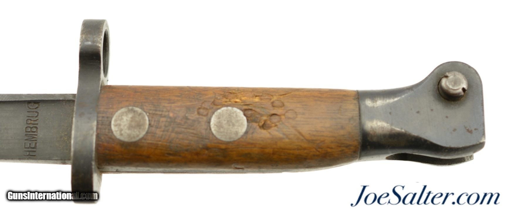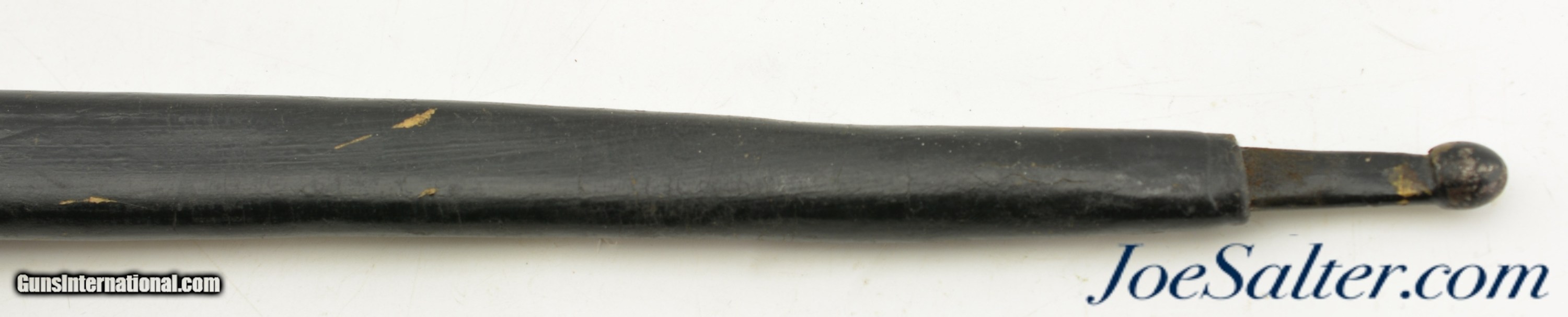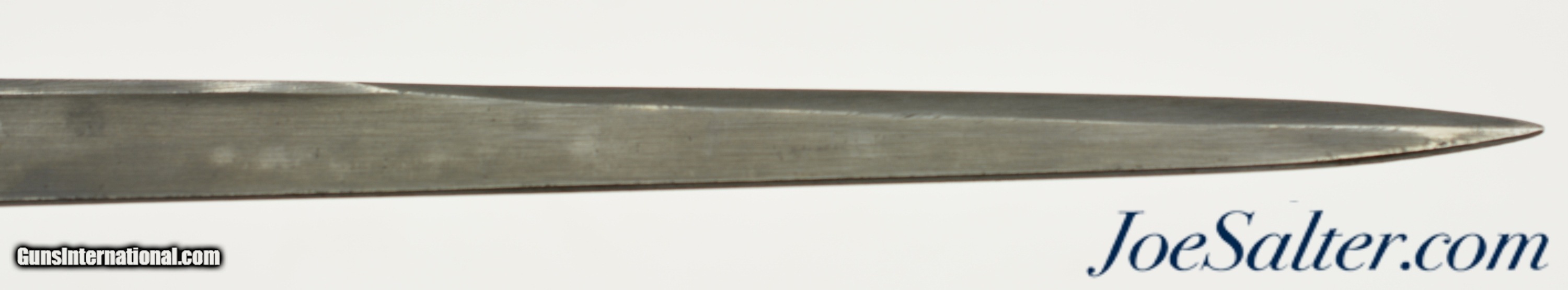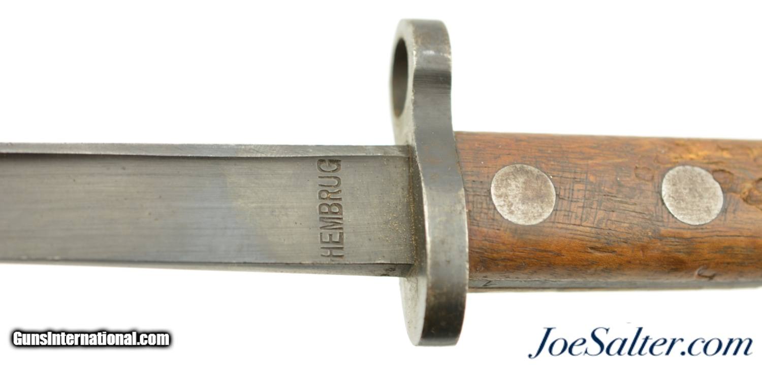 Description: This is an original 2cd model, Netherlands/Dutch 1895 Bayonet for the Dutch Mannlicher rifle, manufactured by Hembrug (Artillerie Inrichtingen Zaandam). The nearly 14 unsharpened blade is in excellent condition with almost all of the finish, no nicks and a nice tip. The ricasso is marked "HEMBRUG" and on the reverse is Crown over Z. The guard is excellent with "6413.00" stamped on one side. The pommel is also stamped with the Crown over Z and in fine condition. The correct and original scabbard with attached frog is in excellent condition with tight stitching, brass rivets, has a loose internal chape. This is marked on the back "4399" "B&C AMSTEDAM" and I believe the date of 1897. SOLD |