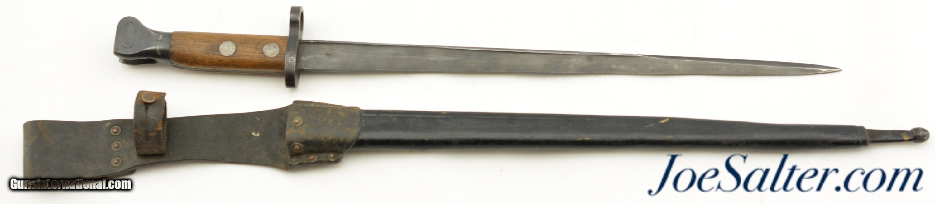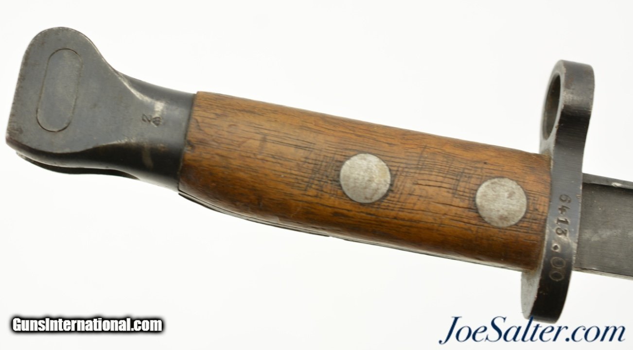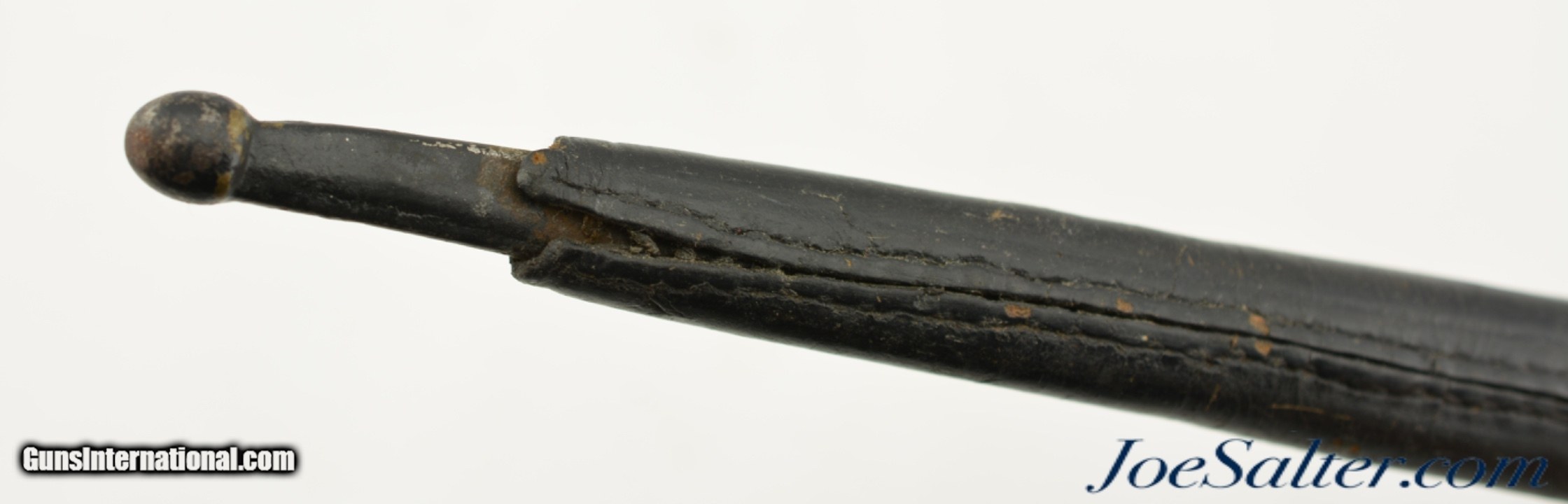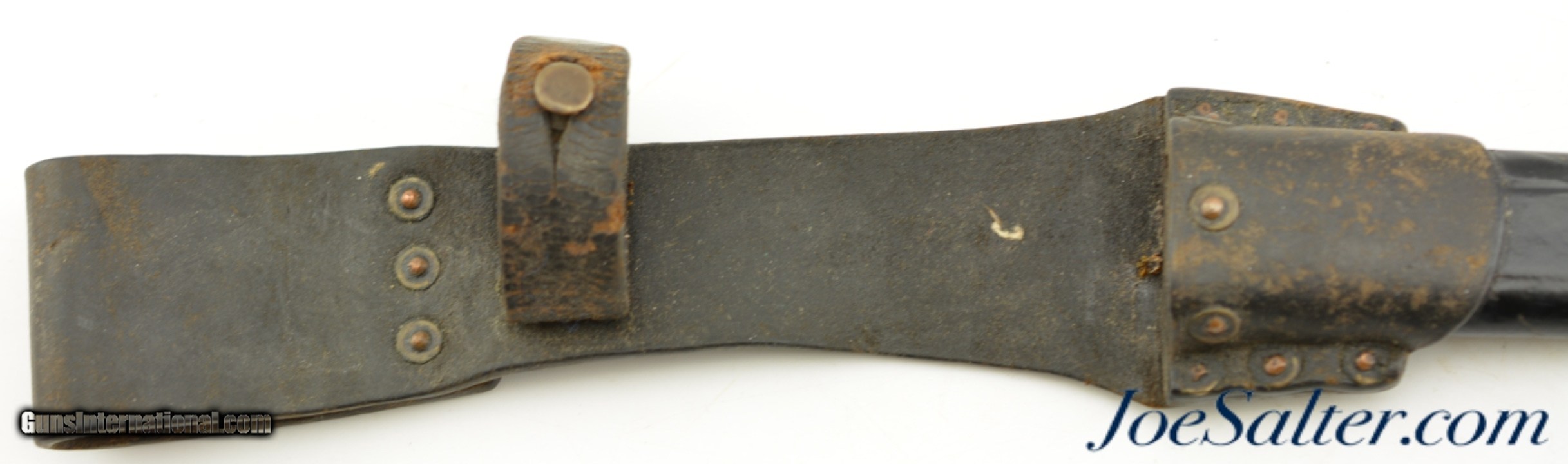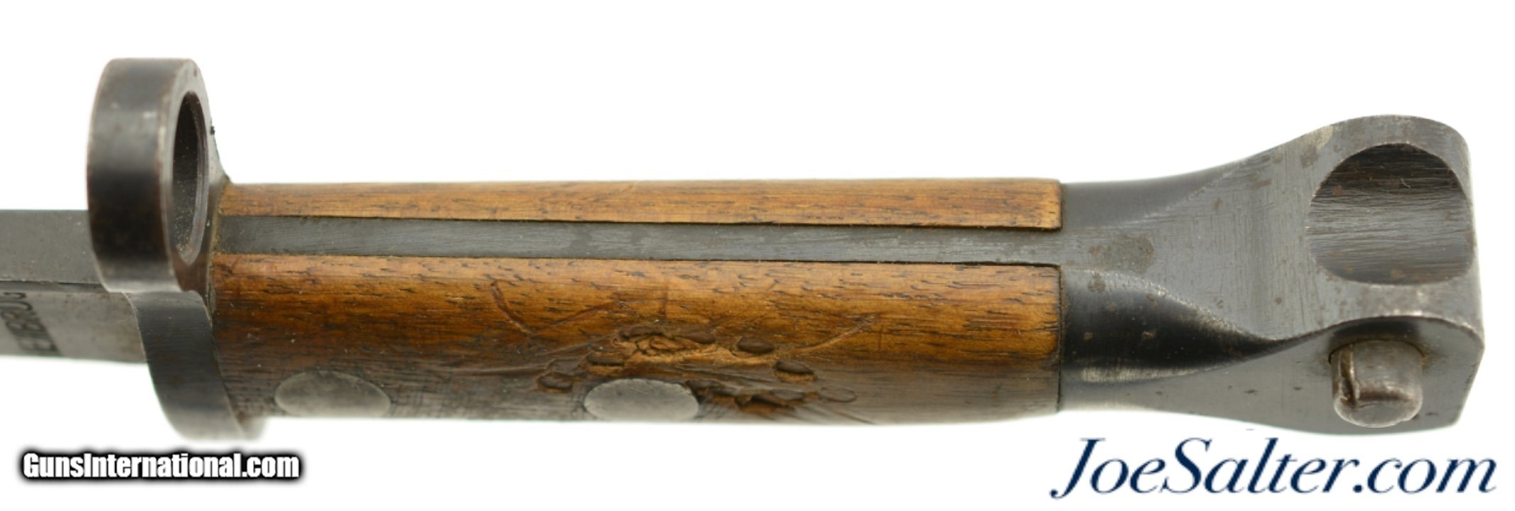Description: This is an original 2cd model, Netherlands/Dutch 1895 Bayonet for the Dutch Mannlicher rifle, manufactured by Hembrug (Artillerie Inrichtingen Zaandam). The nearly 14 unsharpened blade is in excellent condition with almost all of the finish, no nicks and a nice tip. The ricasso is marked "HEMBRUG" and on the reverse is Crown over Z. The guard is excellent with "6413.00" stamped on one side. The pommel is also stamped with the Crown over Z and in fine condition. The correct and original scabbard with attached frog is in excellent condition with tight stitching, brass rivets, has a loose internal chape. This is marked on the back "4399" "B&C AMSTEDAM" and I believe the date of 1897. SOLD |