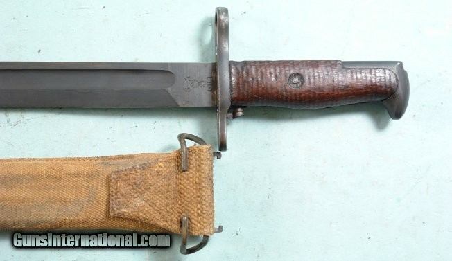 EARLY STYLE WW1 OR WWI U.S. MODEL 1905 "1918" RIFLE BAYONET WITH ORIGINAL CANVAS COVERED M1910 SCABBARD.