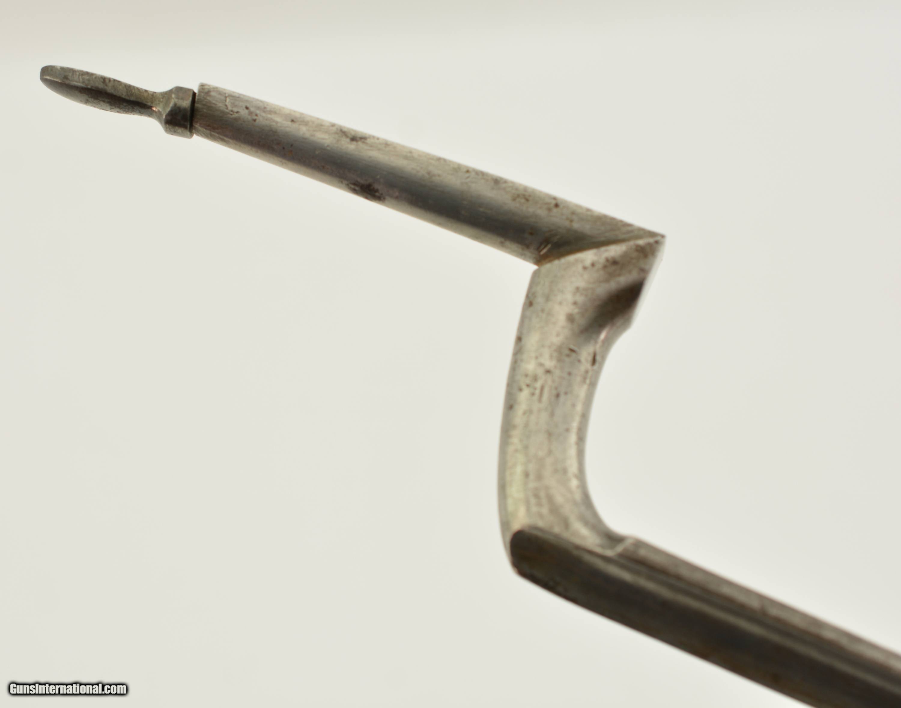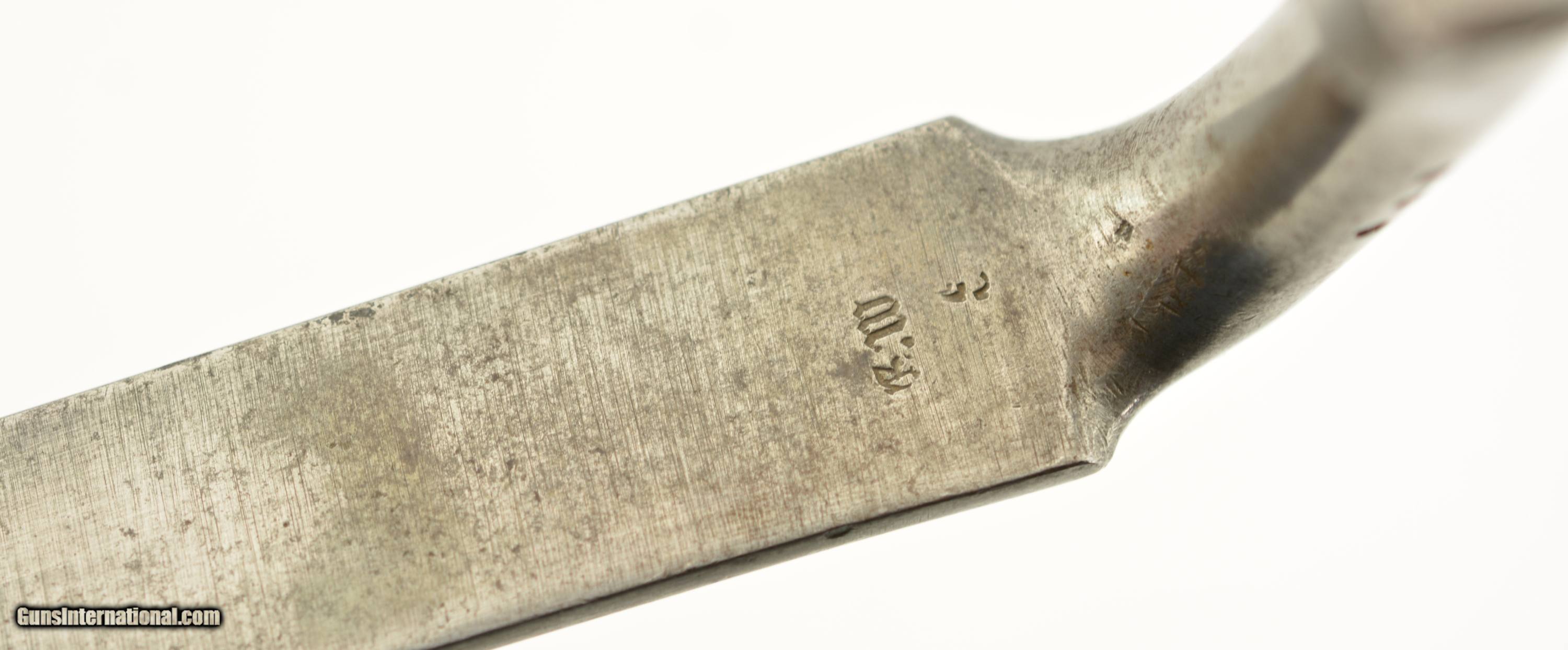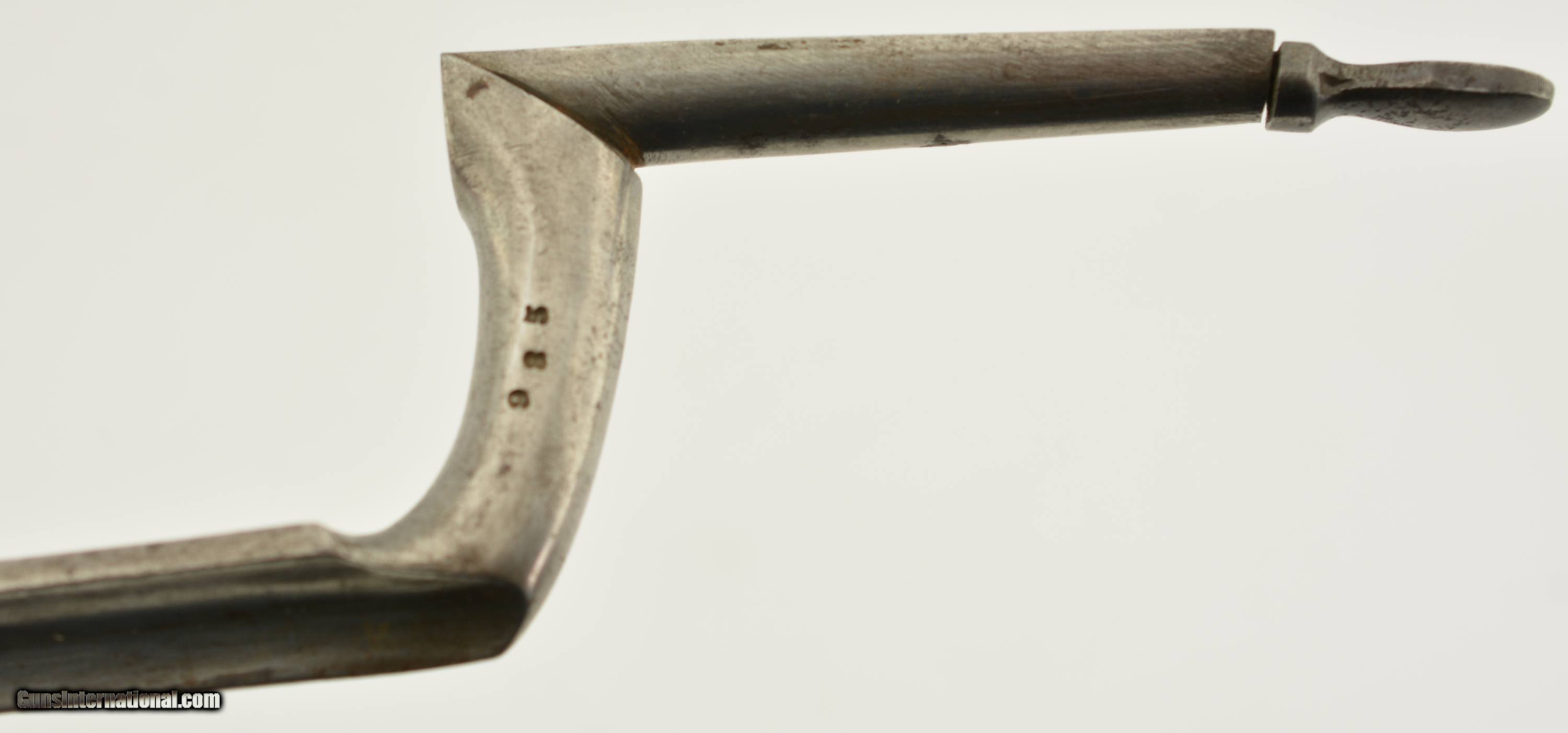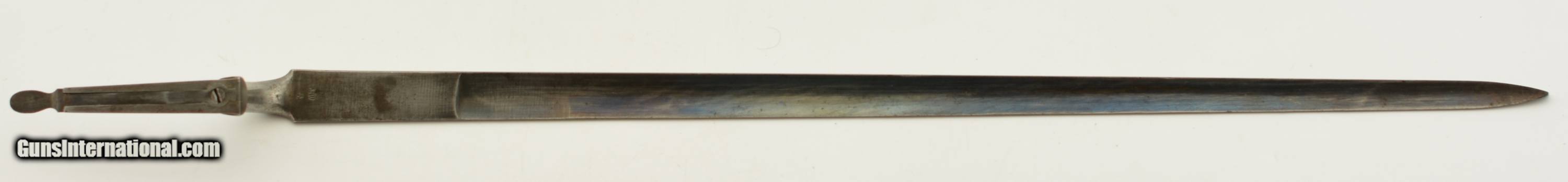 Description: This is an excellent Swiss M1851 Federal Rifle Feldstutzer Bayonet. The 20.5" fullered blade is in excellent condition with 50%+ of the original fire bluing still intact with only light use marks and an unaltered tip. The ricasso is stamped with what appears to be a BW over S with just a hint of age soiling. The elbow is strongly marked 985 and has a very light scattering of oxidation. The shaft and spring are in excellent condition with the spring working as intended with the stamp of O on the end. Amazing condition for a bayonet nearly 175 years old. Please see pictures for further details. SOLD Manufacturer: Swiss Model: Bayonet |