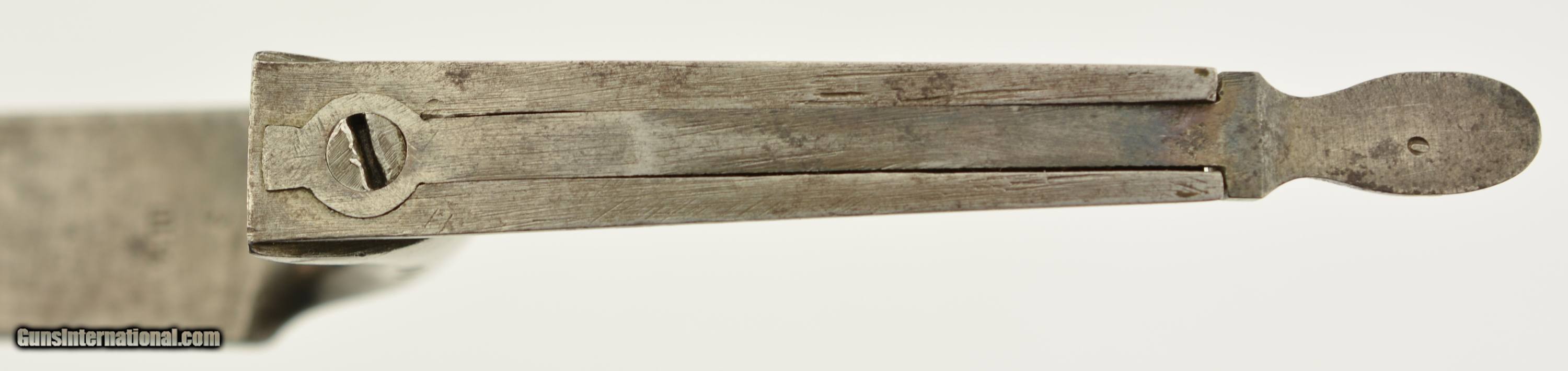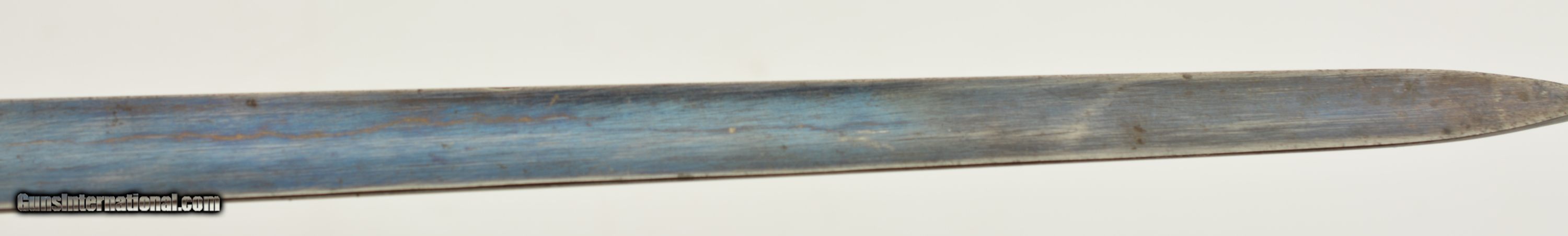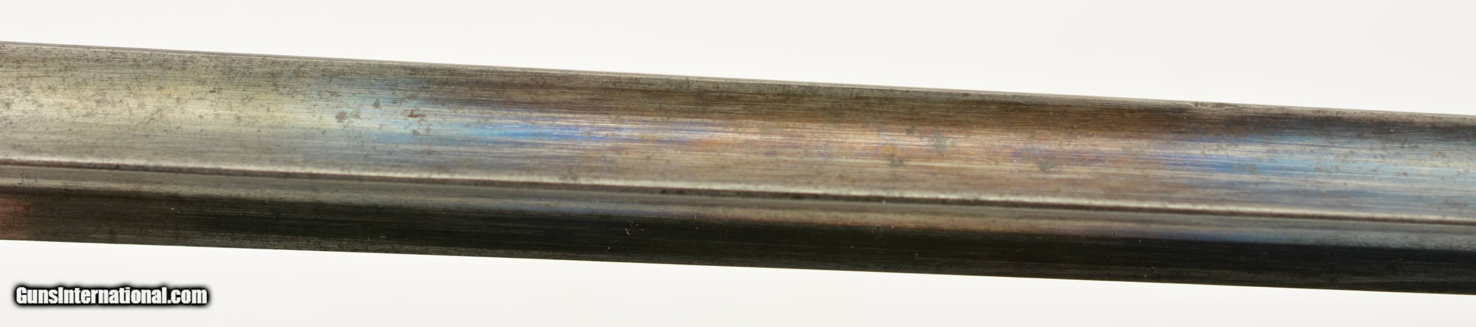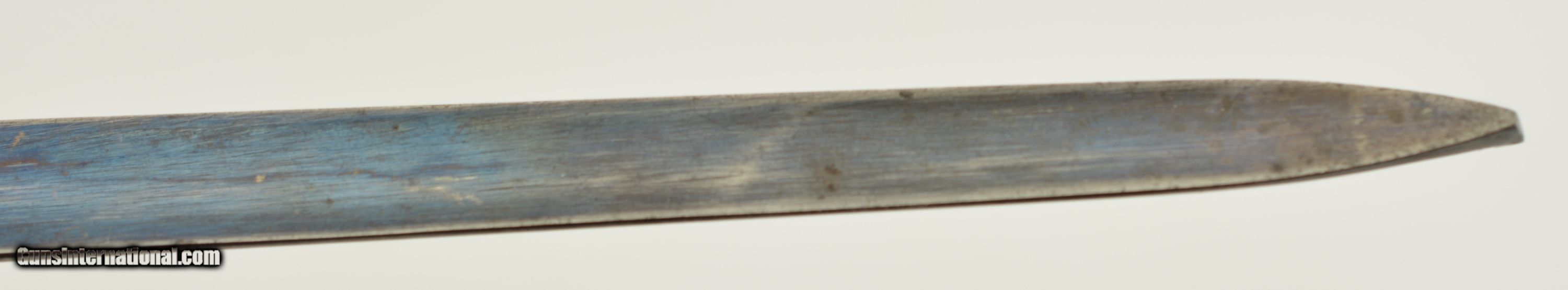 Description: This is an excellent Swiss M1851 Federal Rifle Feldstutzer Bayonet. The 20.5" fullered blade is in excellent condition with 50%+ of the original fire bluing still intact with only light use marks and an unaltered tip. The ricasso is stamped with what appears to be a BW over S with just a hint of age soiling. The elbow is strongly marked 985 and has a very light scattering of oxidation. The shaft and spring are in excellent condition with the spring working as intended with the stamp of O on the end. Amazing condition for a bayonet nearly 175 years old. Please see pictures for further details. SOLD Manufacturer: Swiss Model: Bayonet |