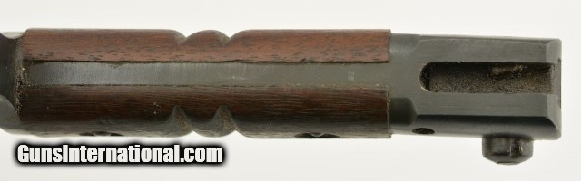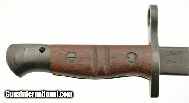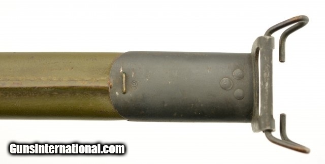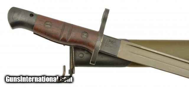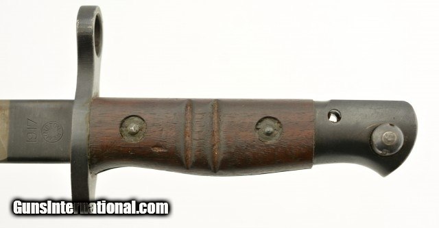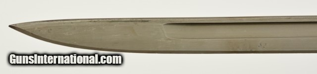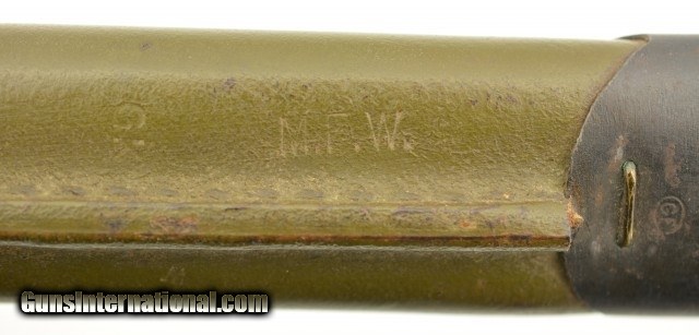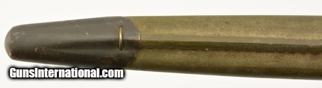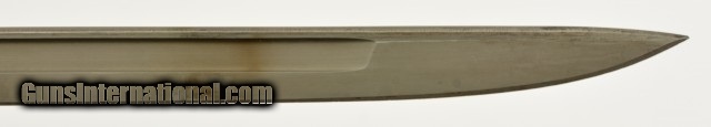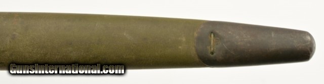 Description: This is an original WWI US M1917 Remington Bayonet with leather scabbard. The M1917 was produced by Remington and Winchester from 1917 to 1919 at approximate 2.5 million pieces. They fit the Model 1917 and US shotguns Winchester M97, M12, Ithaca M37 and Stevens M520-30, 620A. This M1917 is in excellent condition with an excellent unsharpened, correct length and unaltered tipped blade with the first 1" near perfect blued and the reaming parkerized portion looking unused with only scabbard marks. The ricasso is stamped with all of the correct markings including the US, Remington in circle, bomb, eagle and 21. The crossguard and pommel are in excellent condition with almost no signs of wear or oxidation. The wooden grips are in excellent condition with light wear and a dark brown patina. The correct type No.1 V2 scabbard has 95% original olive drab finish and is marked GK, M.F.W with tight stitching. All metal components are maker marked GF with very light scattered oxidation. Will make a fine addition to any collection and will rank #1 in most. SOLD |