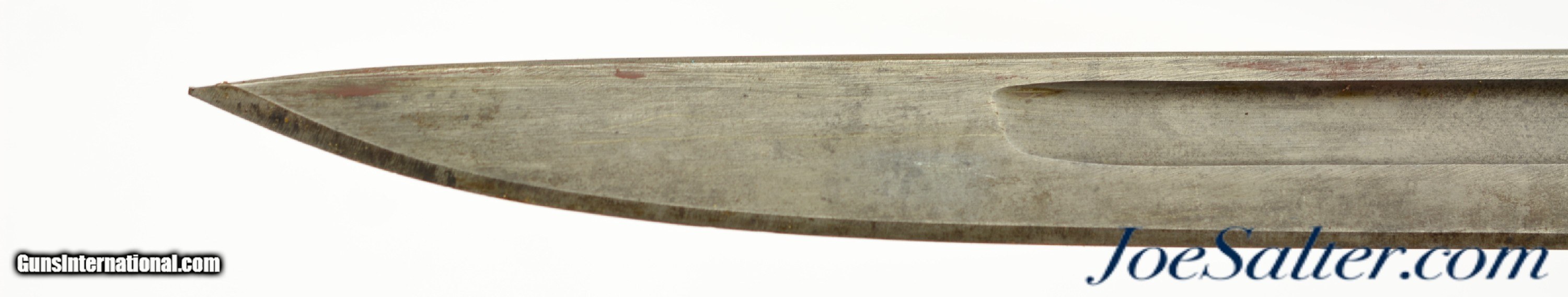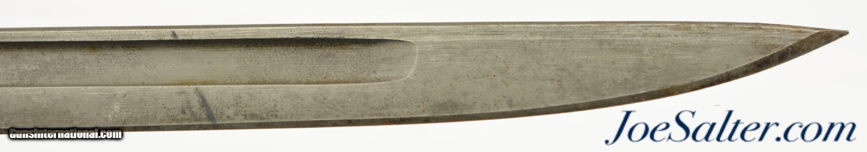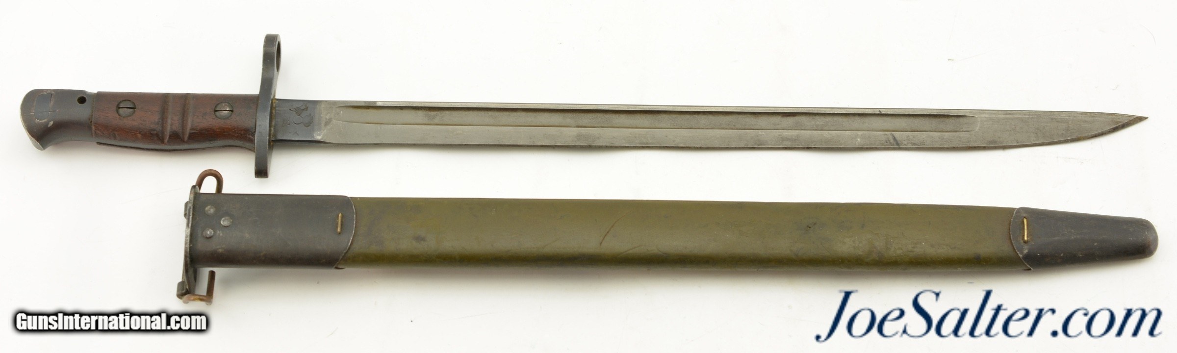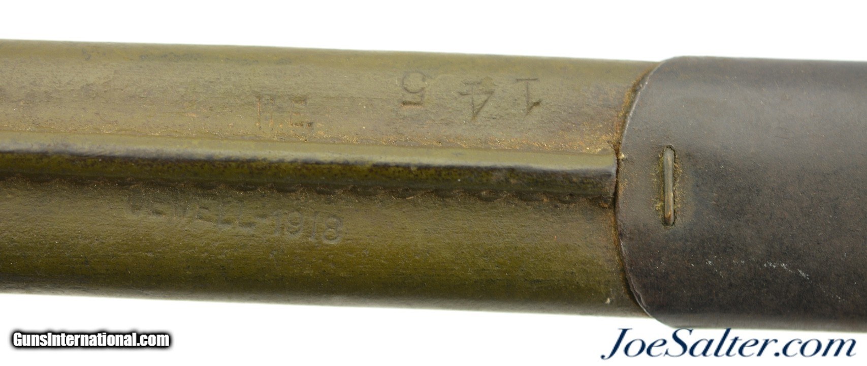 Description: This is an original WWI US M1917 Remington Bayonet with matching leather scabbard. The M1917 was produced by Remington and Winchester from 1917 to 1919 at approximate 2.5 million pieces. They fit the Model 1917 and US shotguns Winchester M97, M12, Ithaca M37 and Stevens M520-30, 620A. This M1917 is in excellent condition with an excellent unsharpened, correct length and unaltered tipped blade with the first 1" near perfect blued and the reaming parkerized portion looking nearly unused with only scabbard marks. The ricasso is stamped with all of the correct markings including the US, Remington in circle, bomb, eagle and 17. The crossguard and pommel are in excellent condition with almost no signs of wear or oxidation with the pommel being marked with the Canadian Broad Arrow. The wooden grips are in excellent condition with light wear and a dark brown patina marked "145". The correct second pattern scabbard with M10 hanger has 95%+ original olive drab finish and is marked HE, JEWELL-1918 and matching "145" with tight stitching and all metal components with very light scattered oxidation. Will make a fine addition to any collection and will rank #1 in many.; SOLD |