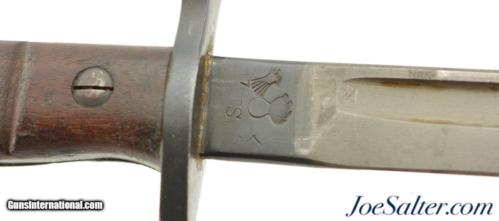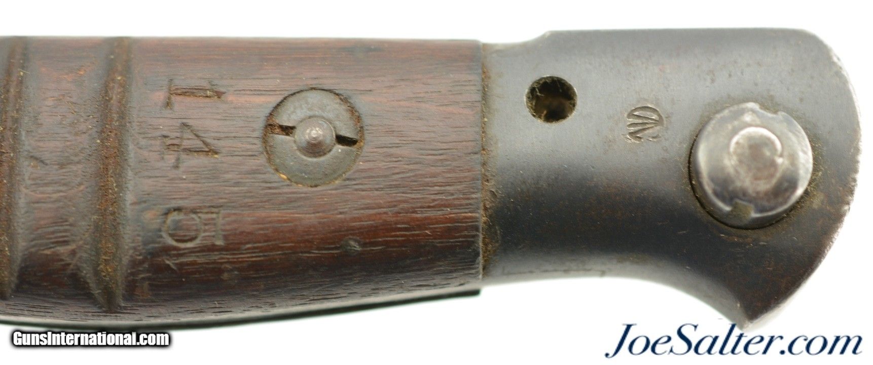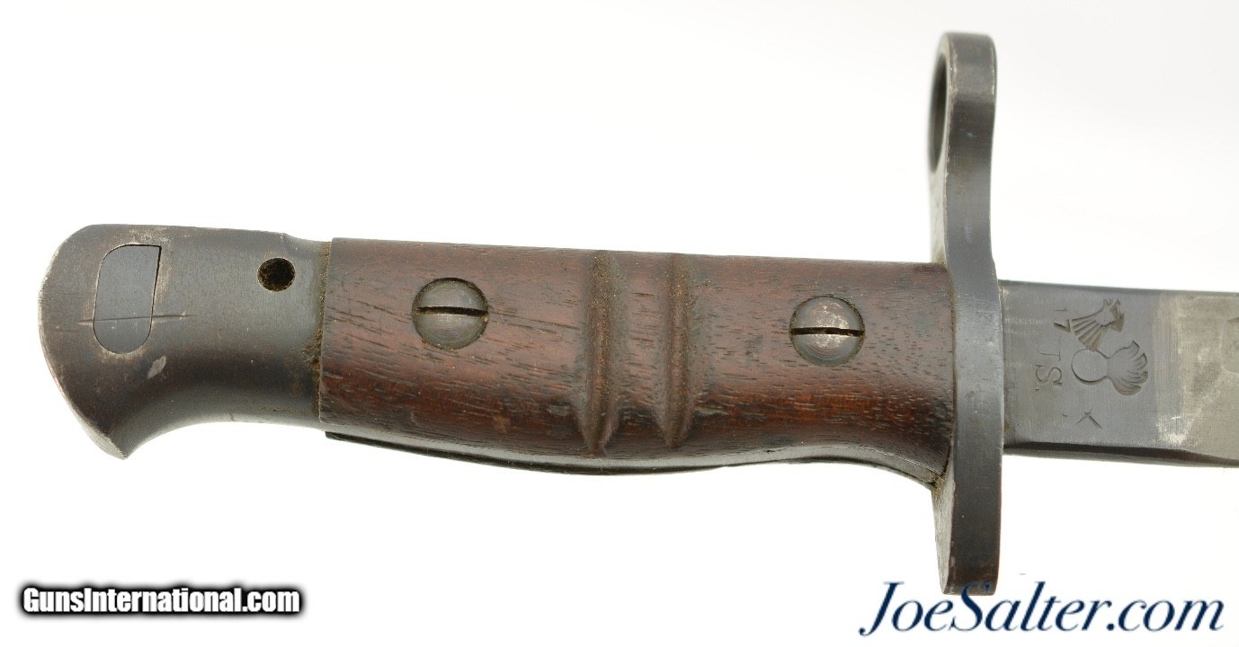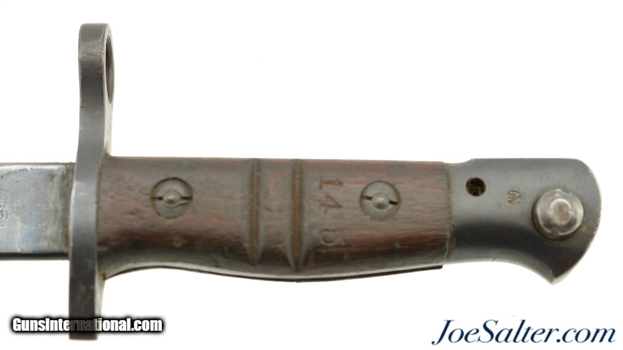 Description: This is an original WWI US M1917 Remington Bayonet with matching leather scabbard. The M1917 was produced by Remington and Winchester from 1917 to 1919 at approximate 2.5 million pieces. They fit the Model 1917 and US shotguns Winchester M97, M12, Ithaca M37 and Stevens M520-30, 620A. This M1917 is in excellent condition with an excellent unsharpened, correct length and unaltered tipped blade with the first 1" near perfect blued and the reaming parkerized portion looking nearly unused with only scabbard marks. The ricasso is stamped with all of the correct markings including the US, Remington in circle, bomb, eagle and 17. The crossguard and pommel are in excellent condition with almost no signs of wear or oxidation with the pommel being marked with the Canadian Broad Arrow. The wooden grips are in excellent condition with light wear and a dark brown patina marked "145". The correct second pattern scabbard with M10 hanger has 95%+ original olive drab finish and is marked HE, JEWELL-1918 and matching "145" with tight stitching and all metal components with very light scattered oxidation. Will make a fine addition to any collection and will rank #1 in many.; SOLD |