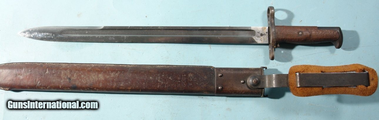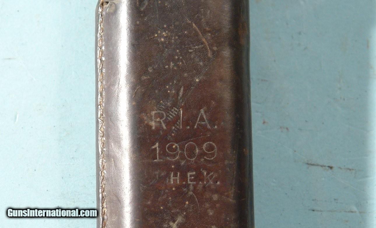 Description: EXCEPTIONAL SPRINGFIELD U.S. MODEL 1905 BAYONET DATED 1909 W/ORIG. SCABBARD. Near mint blade stamped “US/403329” and “S A/ORDNANCE BOMB/1909”. Has all the original polish. Hilt with the original finish and near mint scales. Excellent leather cover on scabbard and with intact rare leather washer still on belt hook. Scabbard stamped on reverse “R.I.A./1909/H.E.K.”. Best 1905 we have had and only one with the washer. SOLD |