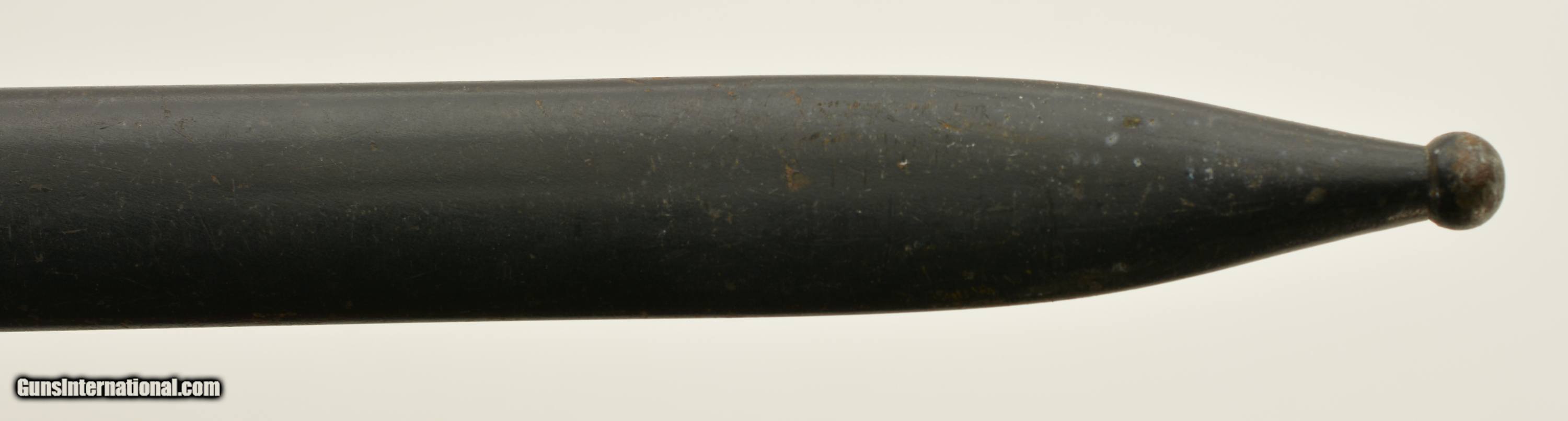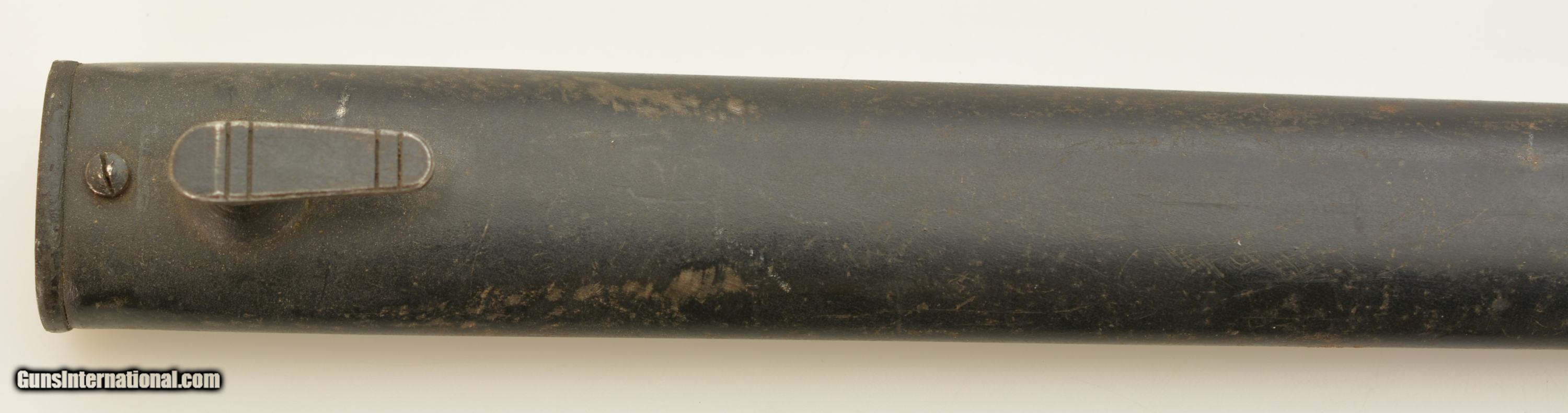 Description: This is the FN Model 98 Mauser long export pattern bayonet that fits the FN Mauser model 98, 1924, 24/30 and 34 along with the Yugoslavian Model 1924 Mauser. It measures 20 ½" with an unmarked 15 1/8" blade that is in excellent brightly polished condition with only minor carbon staining. The steel cross guard and pommel (numbered on the top) show light freckling and handling scratches with excellent wood grips that show light use marks. The black steel scabbard is very good with numerous scratches and overall freckling. SOLD Manufacturer: Mauser Model: Bayonet |