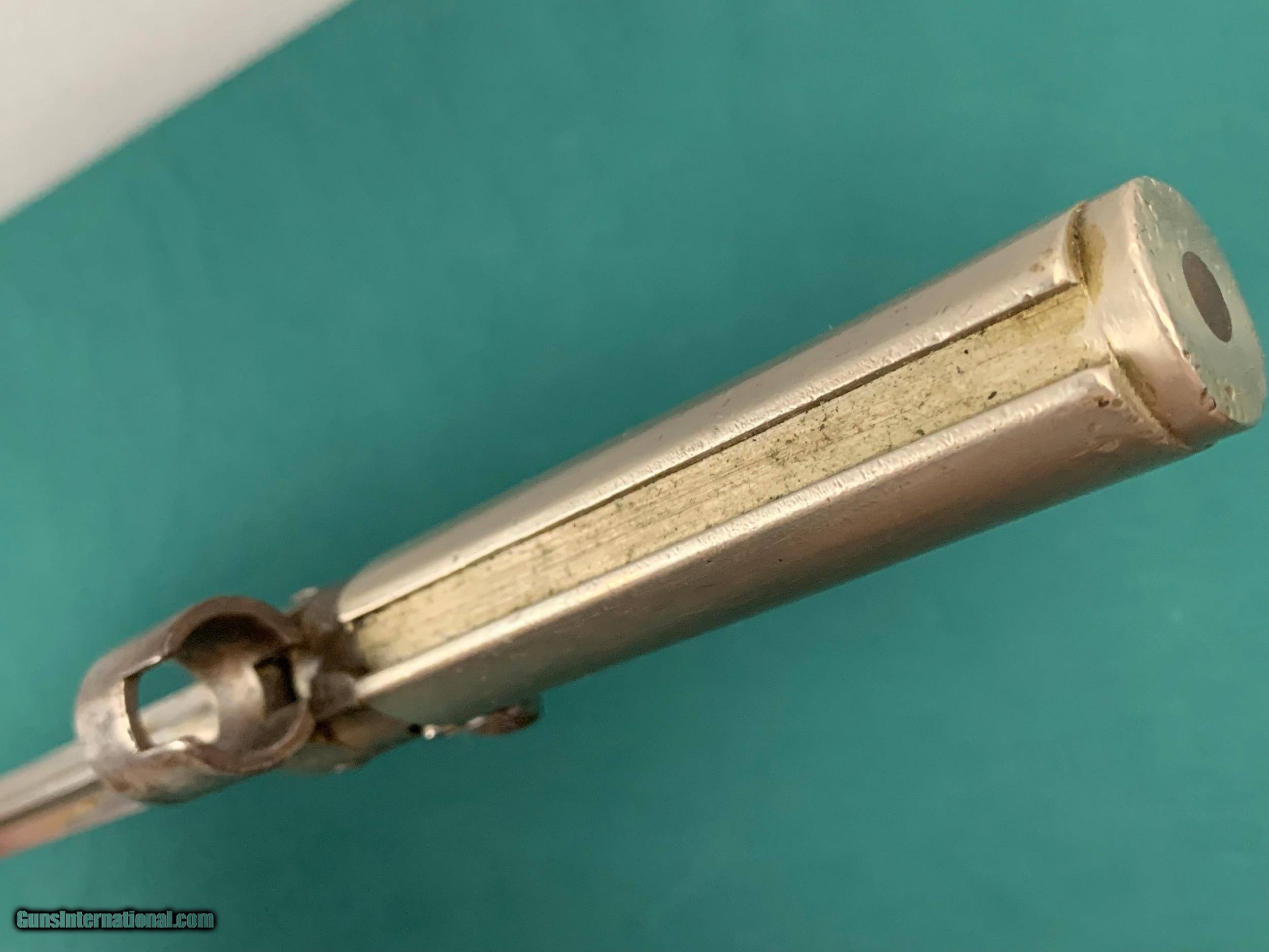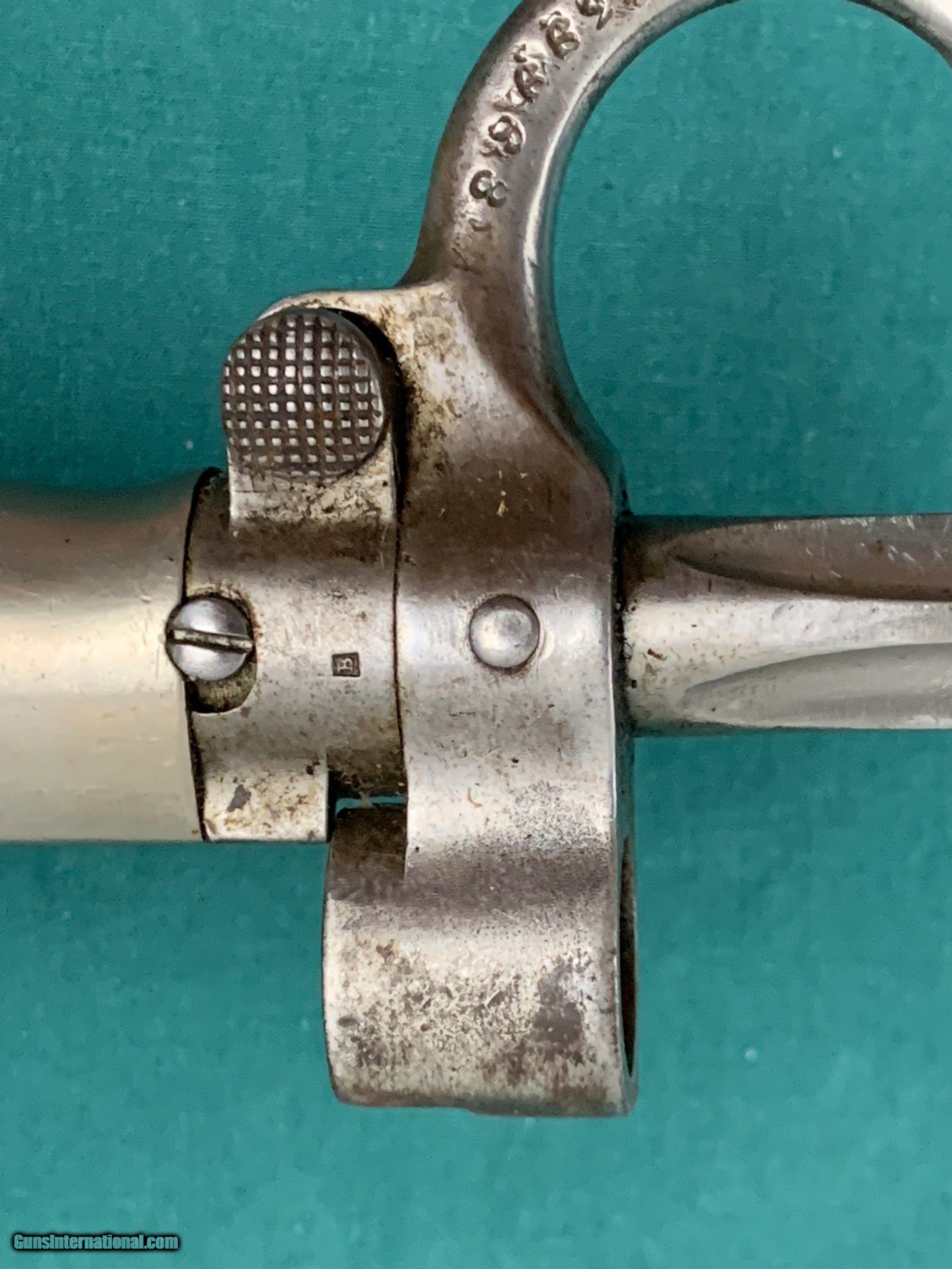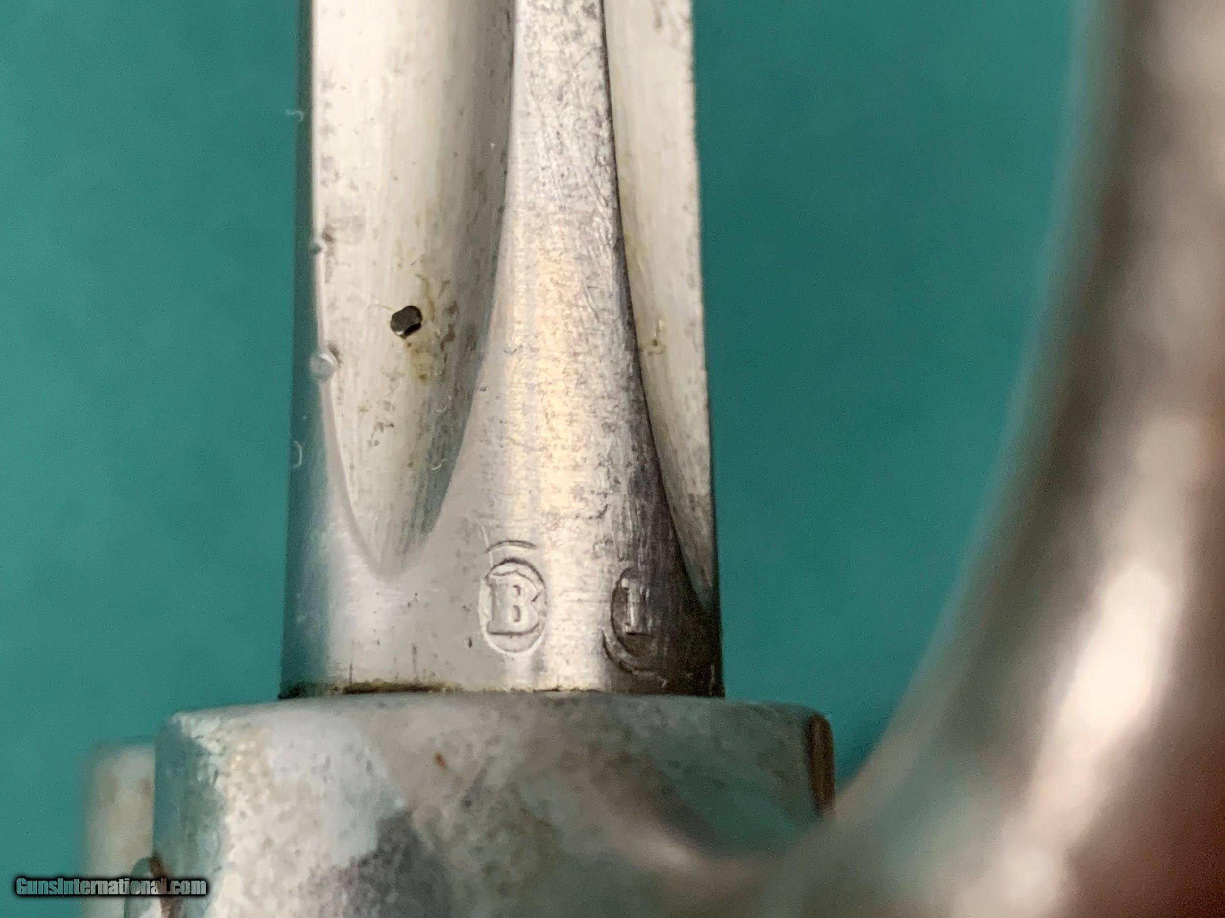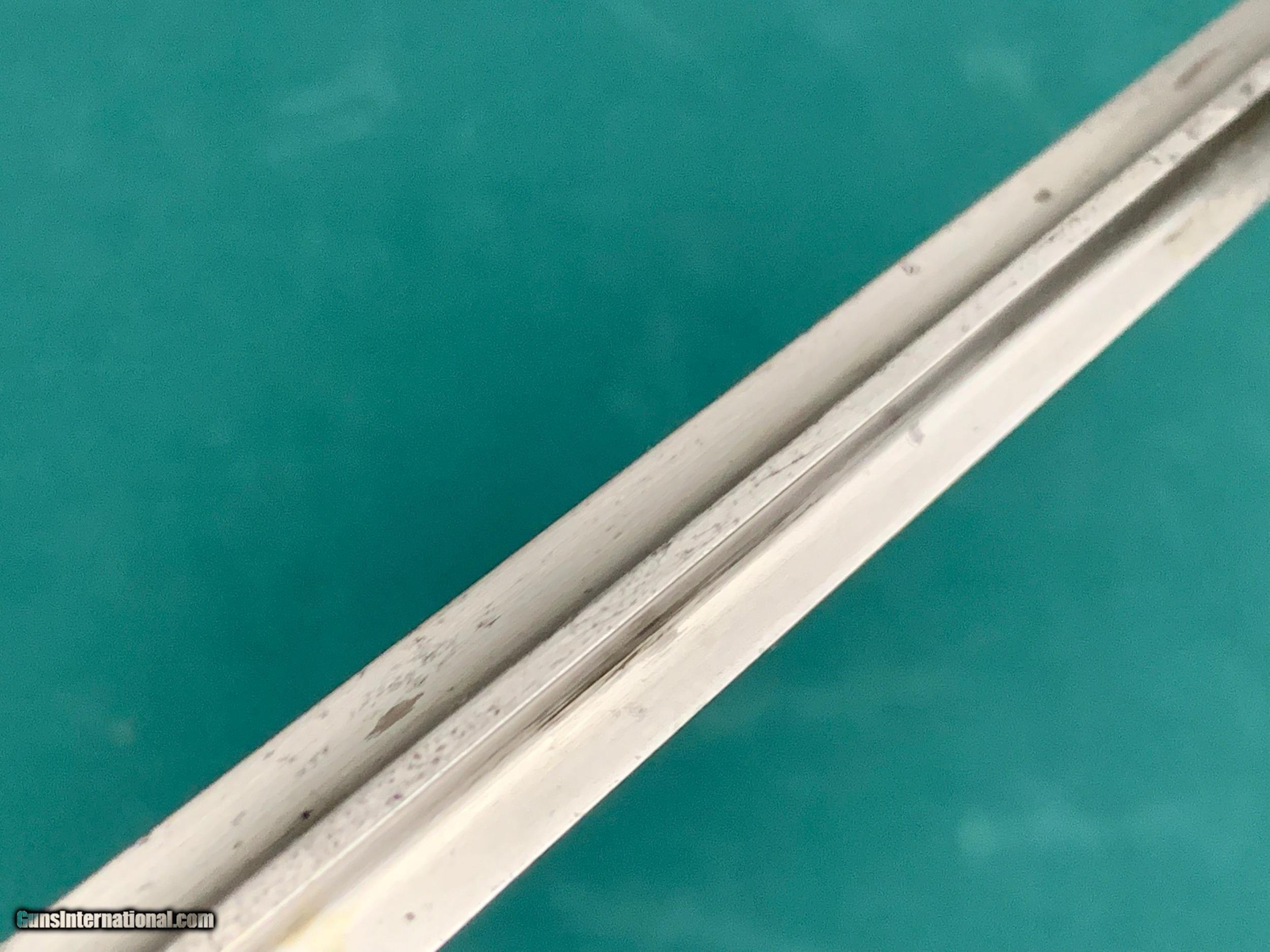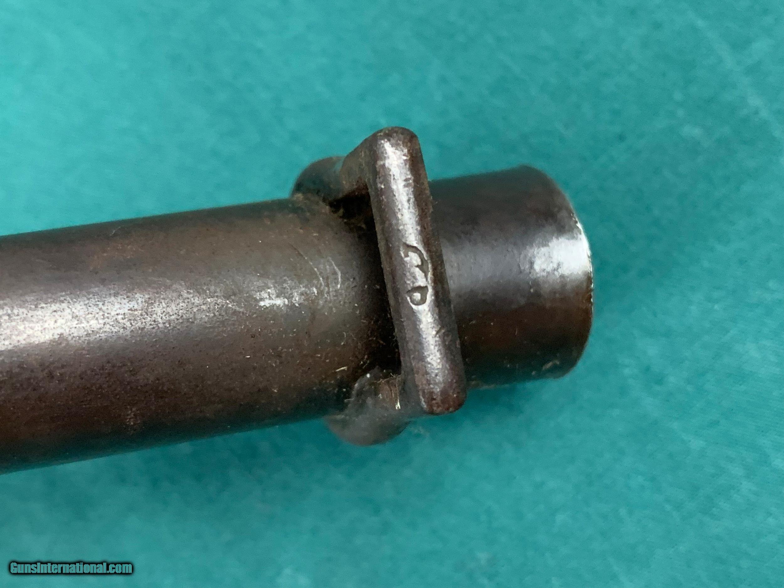 Description: FRENCH LEBEL BAYONET & SCABBARD Nice French Lebel Bayonet in excellent condition documented in Paul Kiesling "Bayonets of the World" book page 179. It has a cruciform straight cruciform blade with some grease, NO NICKS, with minor light aging spots, handling marks-scratches with intact tip that fits the scabbard properly. Cylindrical Silver alloy grips in great shape with just very few minor tiny bruises, scratches-handling marks. Cross hilt in white alloy medal with the muzzle ring, raised circular rounded checkered press release catch in good working condition. Steel medal conical straight blued scabbard in beautiful shape with NO DENTS, minimal even slight fading blue mixed with even pleasing patina showing the first variation tip on drawing 223 (page 179) with intact loop. Wonderful addition for your military Collection! Please e-mail with any questions or more pictures to ms18911909gmail or call my Cell: 912-659-1404. Please see other listings. I can combine shipping on certain items. I can also make a package deal for the 3 French bayonets listed. Terms & Conditions: We will make every possible effort to honestly, accurately and closely describe items including condition, age, virtues, defects and any other pertinent information. Items listed as used/new condition; also may or may not contain unseen flaws and/or imperfections. PLEASE REMEMBER that grading is subjective; some pictures show better than others. PAYPAL payment ok for bayonets and accessories adding 4%. USA ONLY. We only ship to the lower 48 States ( NOT available to Alaska, Hawaii, or Puerto Rico). Shipping USPS priority insured: $19.99 This gun accessory it's sold as a COLLECTIBLE or for DISPLAY. Seller establishes no warranties or depictions concerning the fitness, safeness of use. Any use is entirely at your risk. Buyer agrees to hold seller (as a business company or as an individual/s) harmless against ANY damages, injury, or death caused by defective merchandise and to release seller from ALL liability, whether criminal or civil, arising from the purchase, ownership, possession, storage, use or misuse of this item. No Returns on firearms/antiques/parts/accessories/books. ALL SELLS ARE FINAL. Returns/canceled transaction by buyer are subject to a 30% (of the sale) restocking/paperwork fees. SOLD |