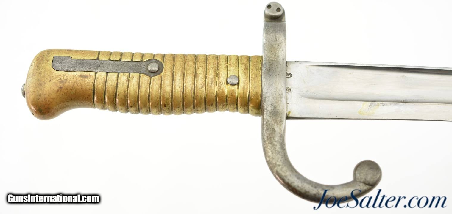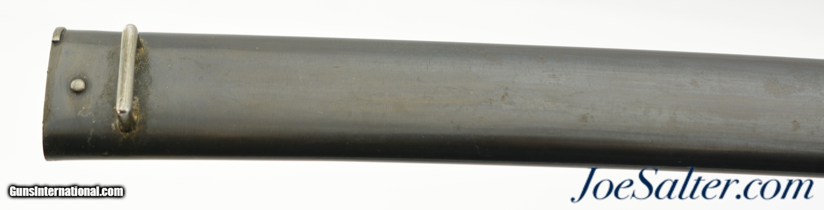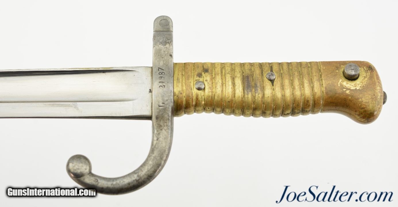 Description: This is an excellent French Model 1866 Chassepot bayonet with matching serial number scabbard. The blade is in excellent condition from the French arsenal of St Etietnne in the year 1871. The unsharpened 22 5/8" blade is free of any imperfection with only minor scuffing from running in and out of the scabbard and virtually no oxidation. The guard is clearly stamped L21987 and the correct proof marks with only light oxidation. The handle is excellent and fully functional with more proof marks. The scabbard is in overall excellent condition with matching serial number and fine light oxidation not concentrated in one area. SOLD |