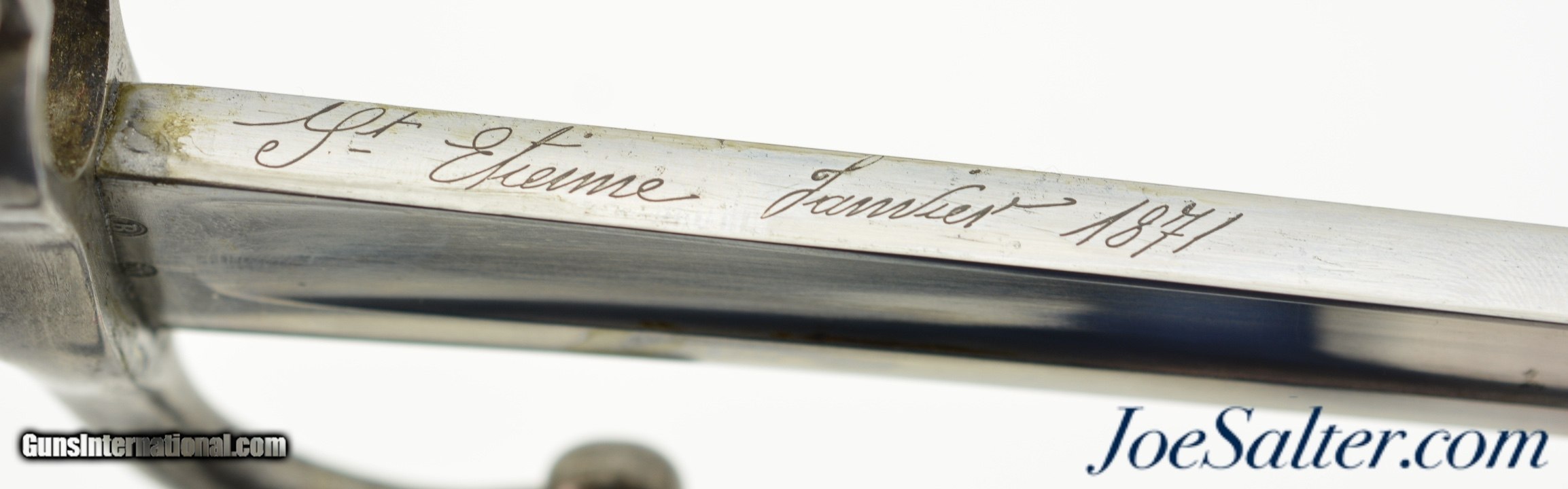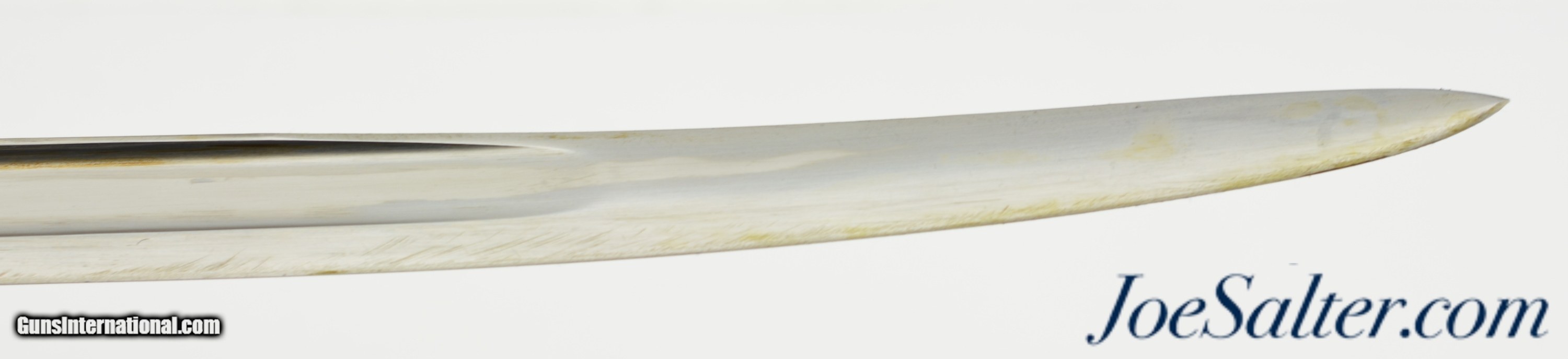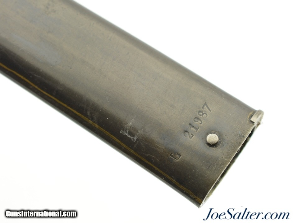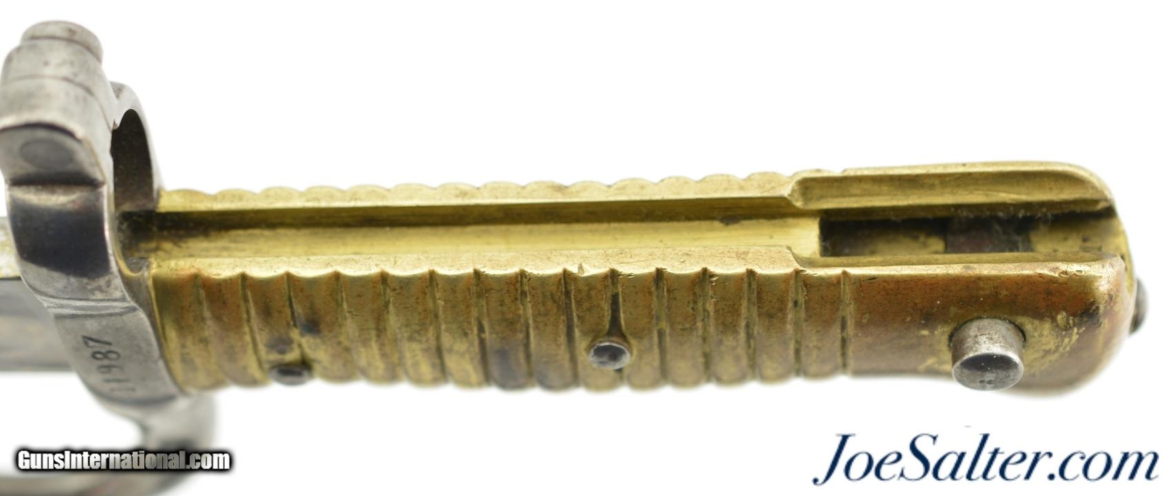 Description: This is an excellent French Model 1866 Chassepot bayonet with matching serial number scabbard. The blade is in excellent condition from the French arsenal of St Etietnne in the year 1871. The unsharpened 22 5/8" blade is free of any imperfection with only minor scuffing from running in and out of the scabbard and virtually no oxidation. The guard is clearly stamped L21987 and the correct proof marks with only light oxidation. The handle is excellent and fully functional with more proof marks. The scabbard is in overall excellent condition with matching serial number and fine light oxidation not concentrated in one area. SOLD |