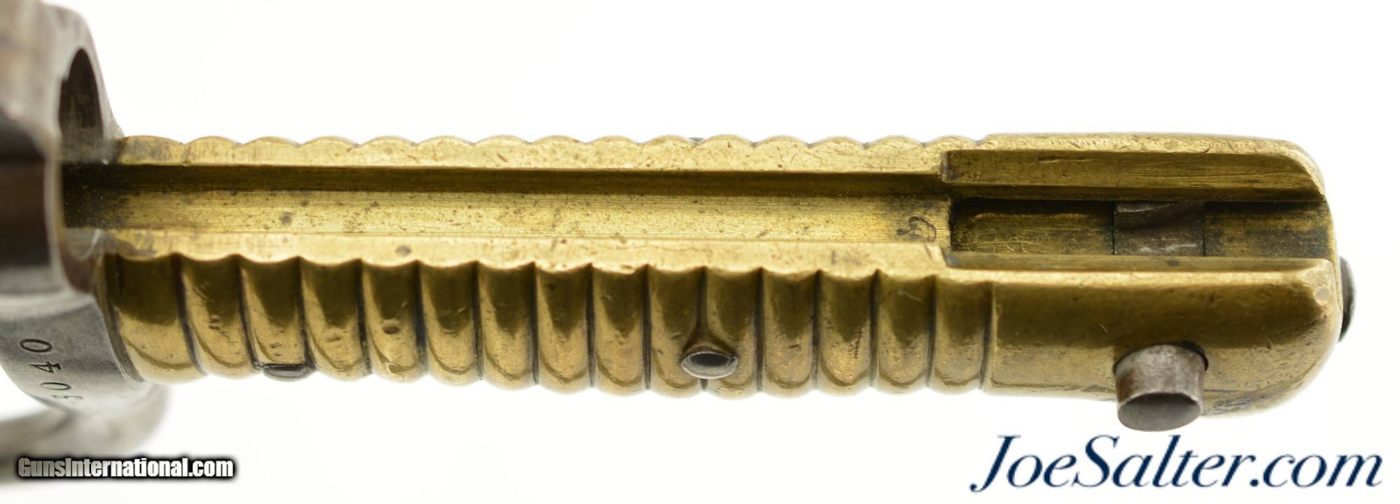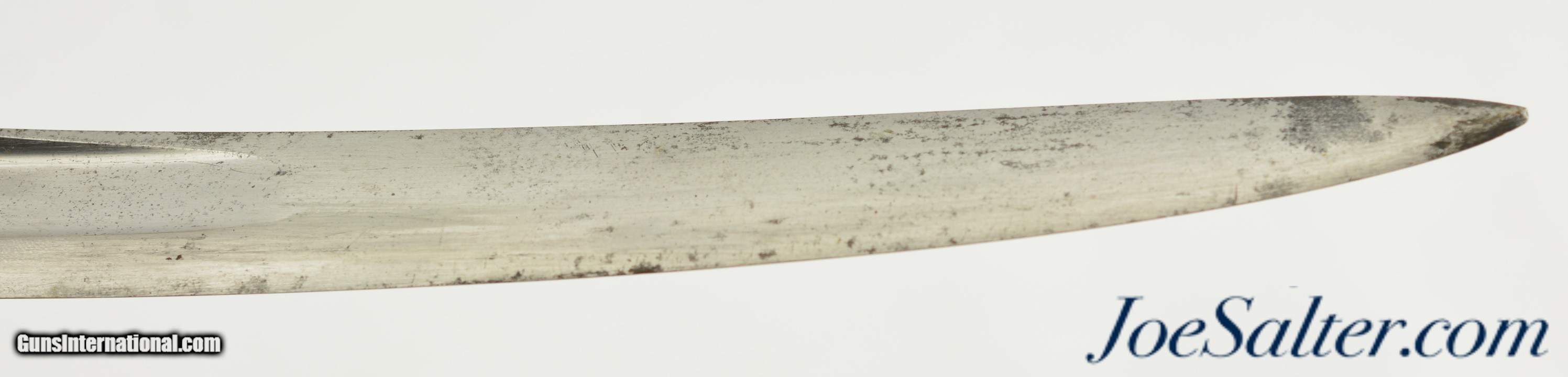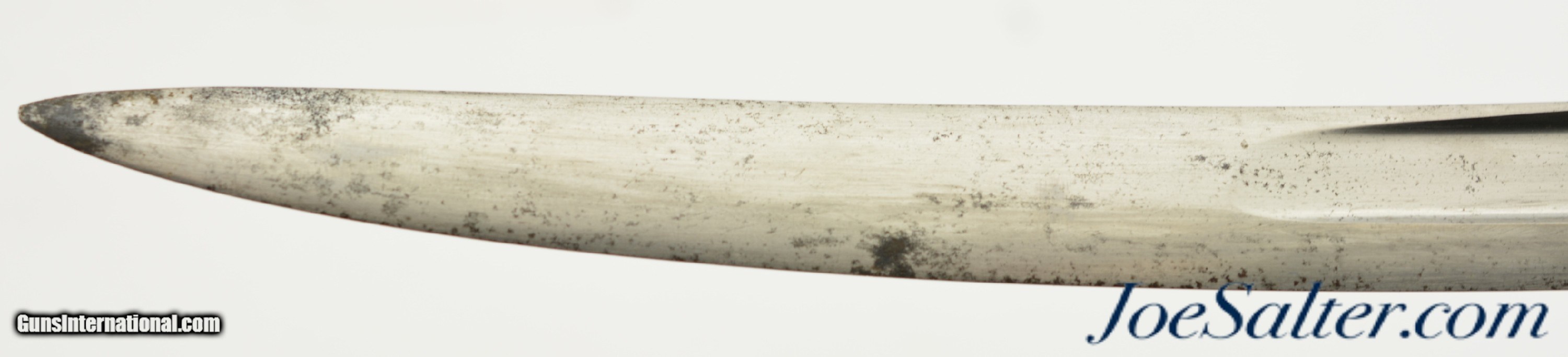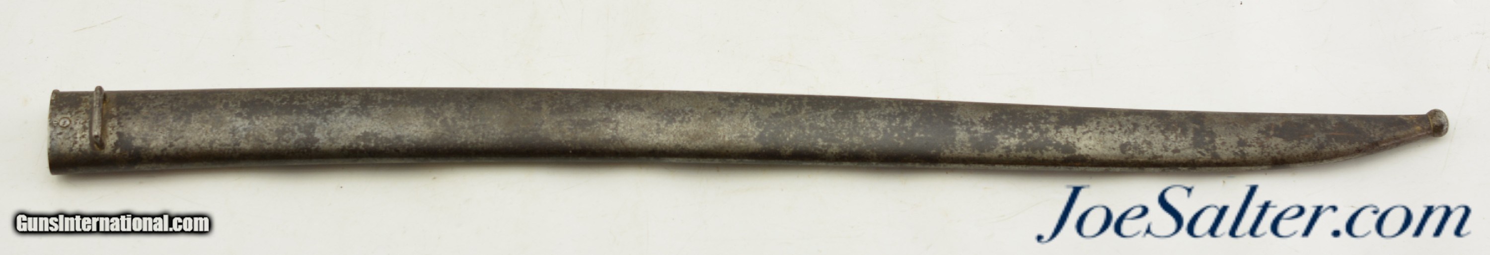 Description: This is a rare French Model 1866 Chassepot bayonet built at Weyersberg Kirschbaum in Germany in 1867/68, only a two year run and very limited, marked only with the Weyersberg "Kings Head" on the ricasso. This very good condition example is rarer still and carries the Naval markings as dose the scabbard. It measures 27 1/4 inches overall with a 22 1/2 inch Yataghan blade with two fullers and flat spine with no markings. The unsharpened blade has a mostly bright silver finish with no nicks and nice tip. The hooked quillon and muzzle ring are mostly a darker mottled patina with serial number #3040 and an Anchor with an M inside a box. The brass handle is marked in the stud channel with a Crown.. The scabbard is marked "A 95211" on the back and with an anchor on the front. It is in very good condition with little of the original finish but no real dents or scratches. Very nice group of a short run French Bayonet.; Price: $439.00 Contact Seller |