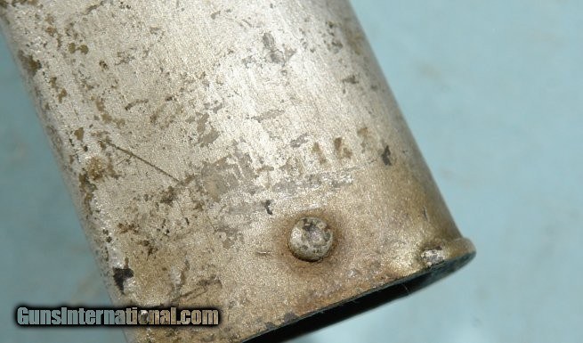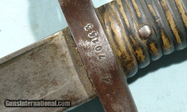 Description: FRENCH MODEL 1866 OR M1866 CHASSEPOT RIFLE SABER BAYONET & SCABBARD. 27 3/4" overall with 22 1/2" fullered blade. "S" and "M" round proofs at ricasso with hand engraved "Manu. Di Armas de Chatellerault Janvier 1874" on back of blade. Last year for the 1866 bayonet. Tight fit to brass hilt with same "S' and "M" as well as three digit serial number in lug slot. Good tension on catch spring. Old patina on brass and never cleaned. Original steel scabbard with nice tight fit so does not rattle around and perfect fit. SOLD |
