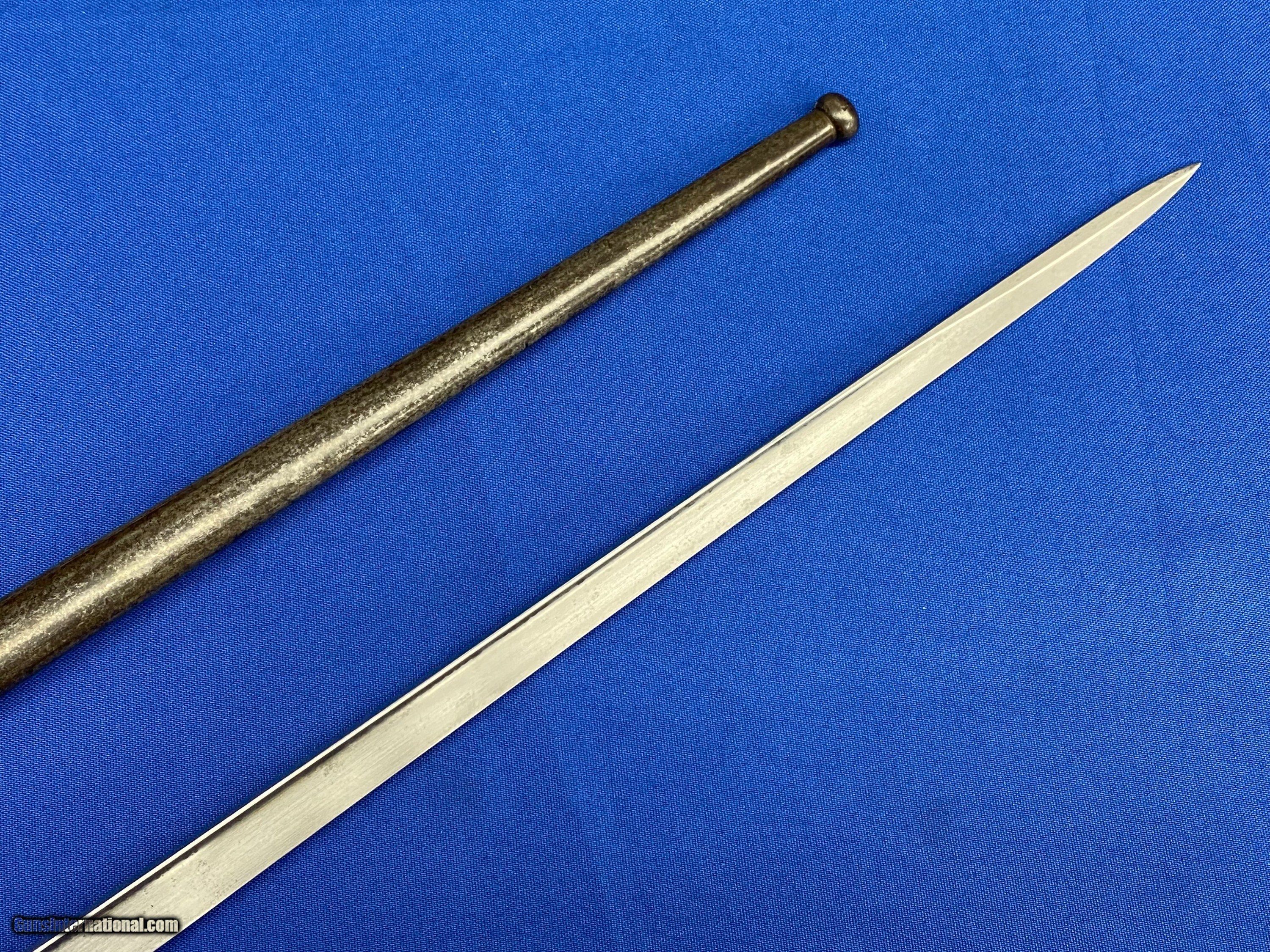 Description: This is an original French Model 1874 Pattern Gras Sword Bayonet in very nice untouched condition. The bayonet features riveted brass & wooden swollen grips, with the locking lug (working). Metal quillon and muzzle ring showing issue numbers & manufacturer/acceptance stamps. The blade is dated 1876. The blade is serial # 10961 and the scabbard serial # is 44040. The triangular thrusting 20-1/2” long blade is in excellent condition, with no wear and no nicks on the blade. SOLD |