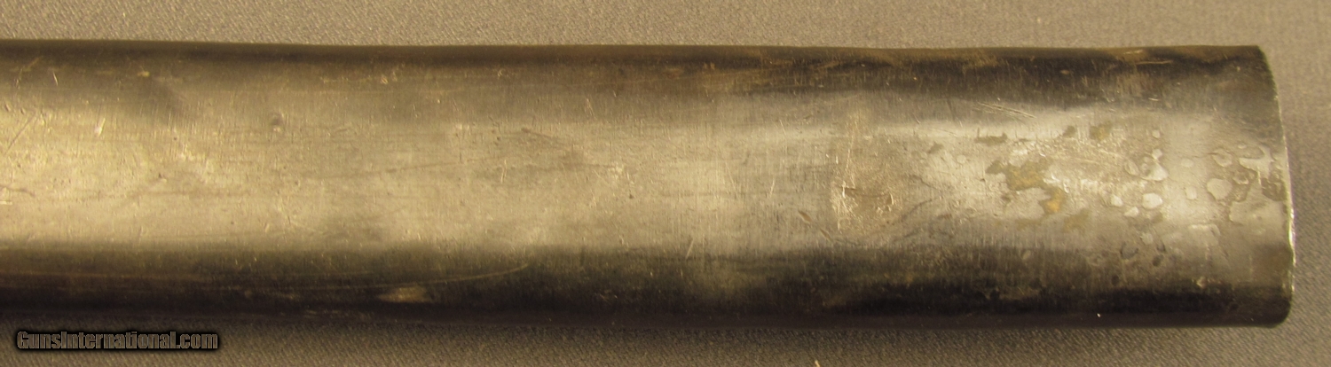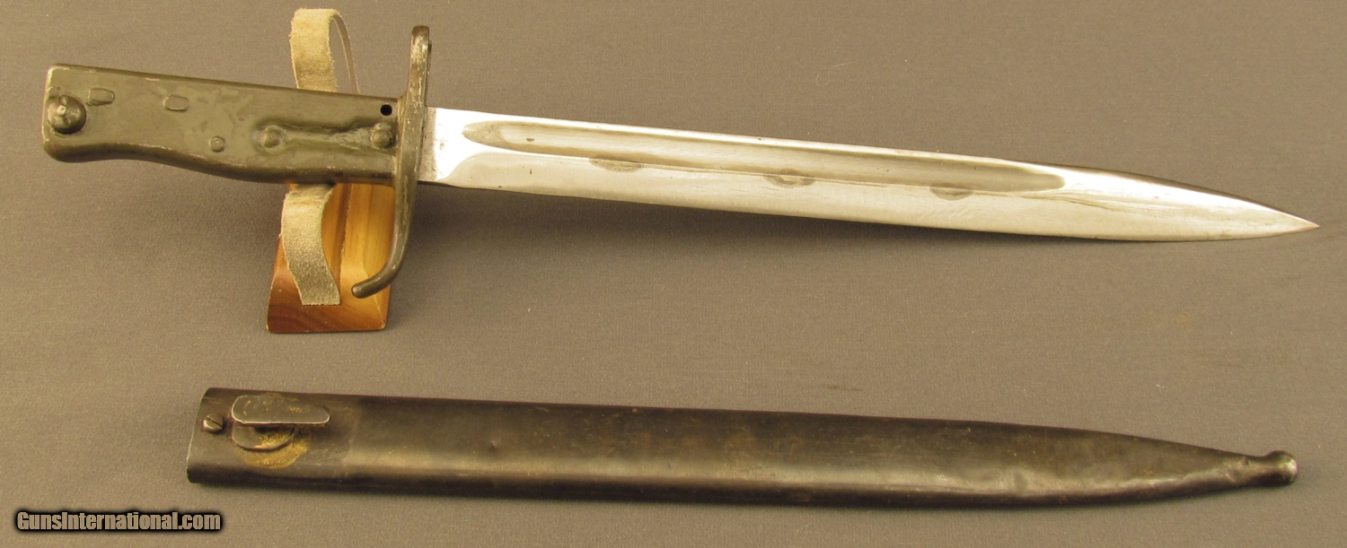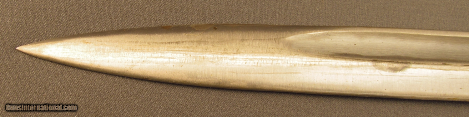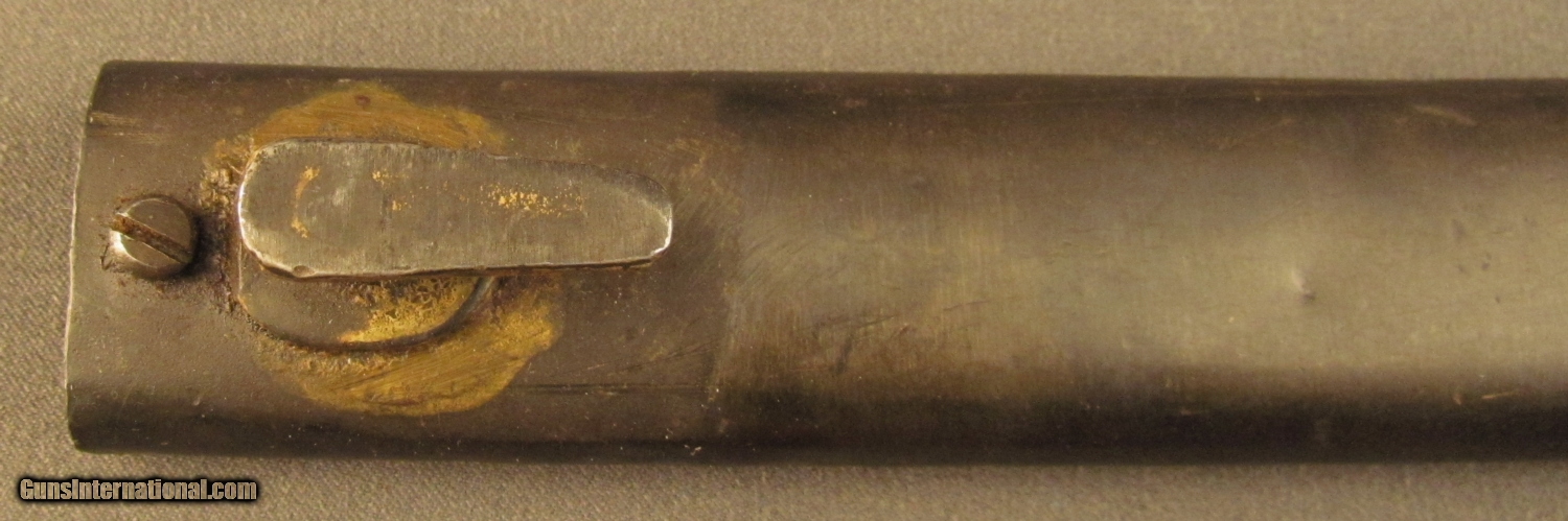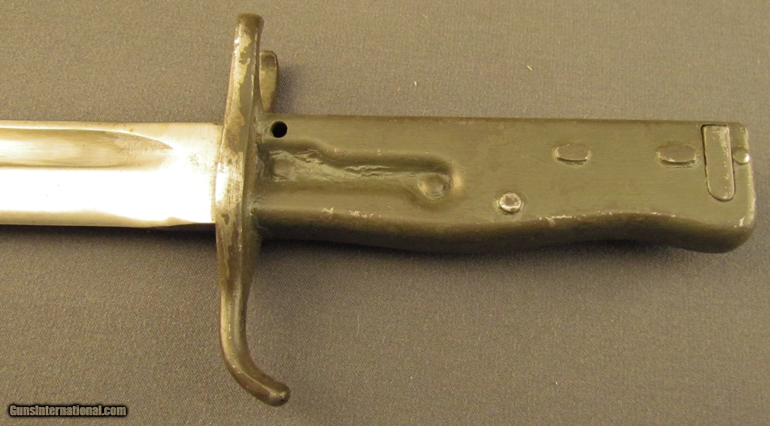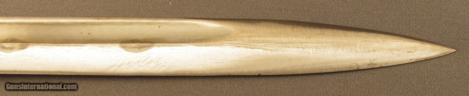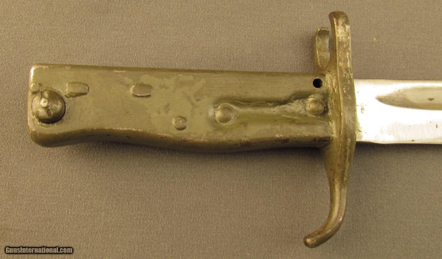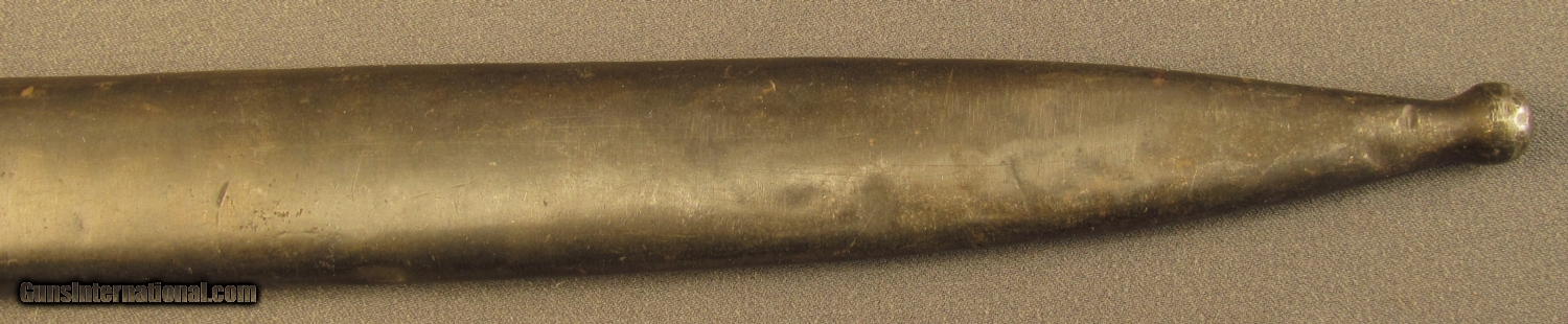 Description: This German bayonet features the split muzzle ring, riveted steel handle, swept back quillion and bright blade. The crossguard is numbered, blade spine shows an indistinct mark. Blade is bright with light staining, the grip is painted green. This comes in a ball final steel scabbard missing throat piece with frog stud showing a brazed repair. A fine WWI German bayonet for the collector. SOLD Manufacturer: German Model: Bayonet |