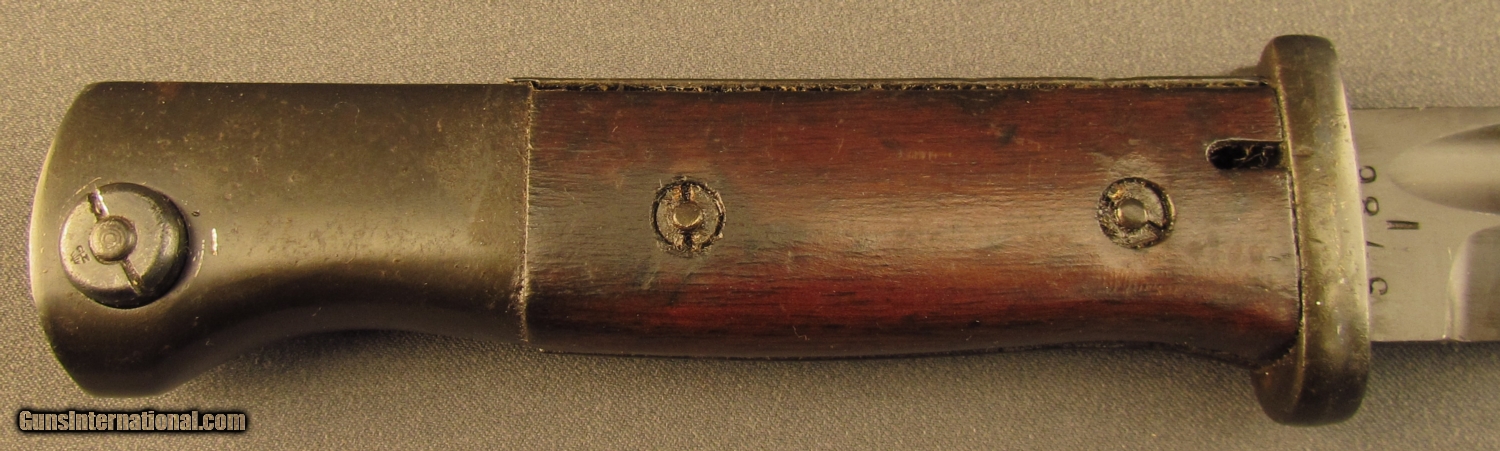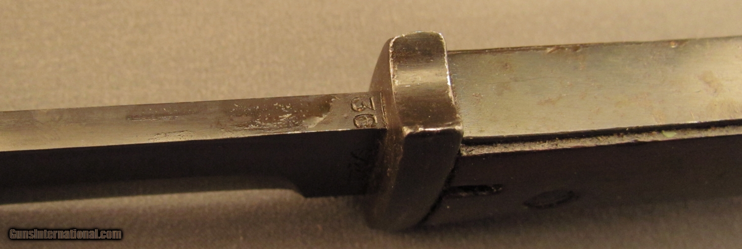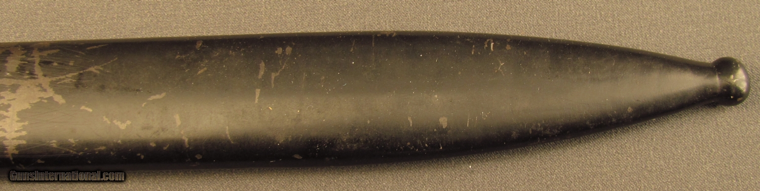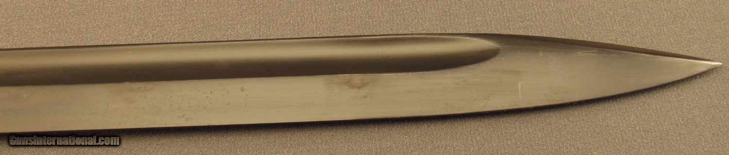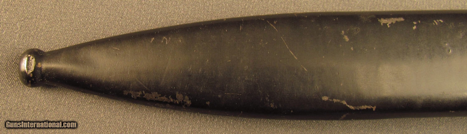 Description: This bayonet is marked "5786" over "I" on ricasso. Reverse reads "S/244" with "36" on spine. This "S" code indicates 1934-37 production under Hitler's secret rearmament program. Pommel is stamped with two early Weimer Eagle era Waffenampts with "WA 219" code. The press stud also shows this mark. Bayonet is in excellent condition with unsharpened blade and retaining 95% blue with light oxidation on flashguard. Scabbard shows "4596H" serial number with 43 AGV code opposite. The ball final shows a Waffenampt, scabbard retains 90% of a black painted finish. A very good early Nazi bayonet in a later replacement scabbard. SOLD Manufacturer: German Model: Bayonet |