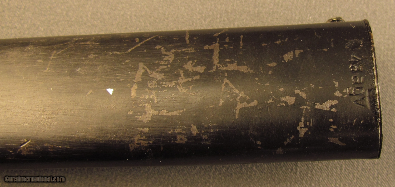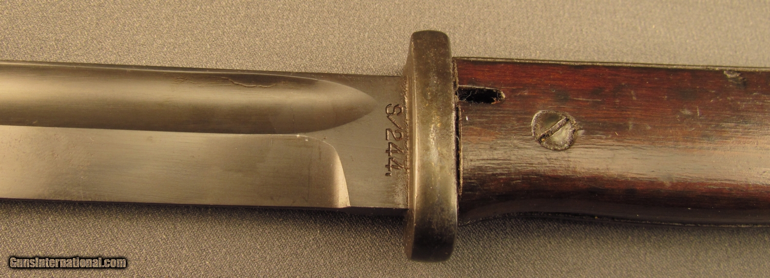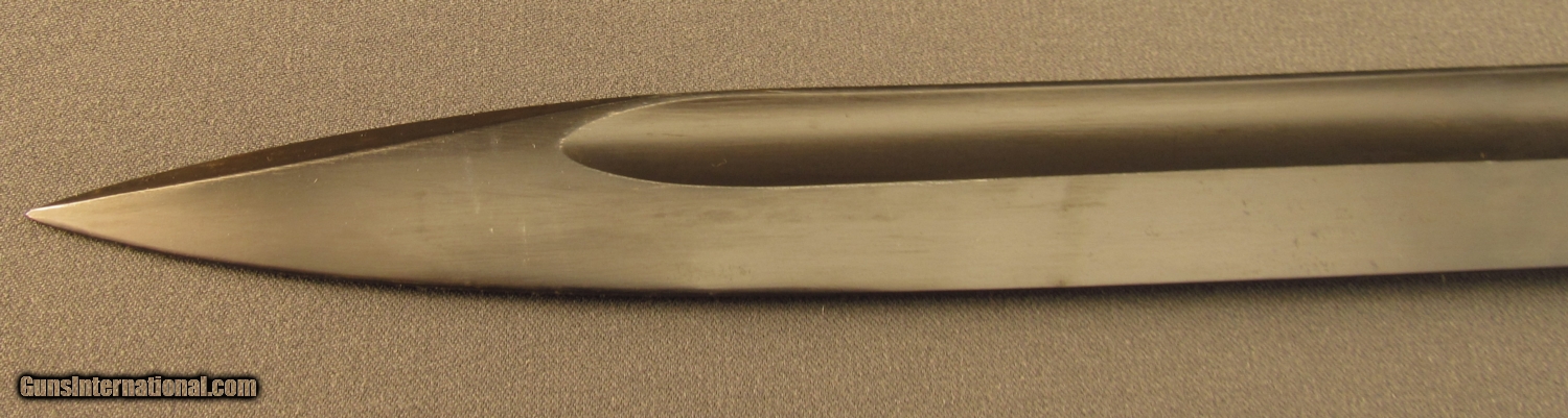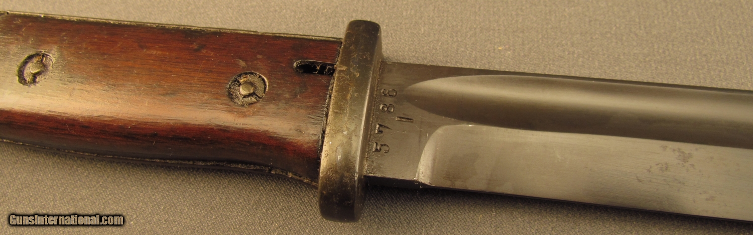 Description: This bayonet is marked "5786" over "I" on ricasso. Reverse reads "S/244" with "36" on spine. This "S" code indicates 1934-37 production under Hitler's secret rearmament program. Pommel is stamped with two early Weimer Eagle era Waffenampts with "WA 219" code. The press stud also shows this mark. Bayonet is in excellent condition with unsharpened blade and retaining 95% blue with light oxidation on flashguard. Scabbard shows "4596H" serial number with 43 AGV code opposite. The ball final shows a Waffenampt, scabbard retains 90% of a black painted finish. A very good early Nazi bayonet in a later replacement scabbard. SOLD Manufacturer: German Model: Bayonet |