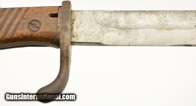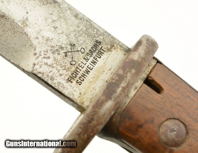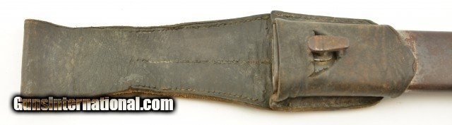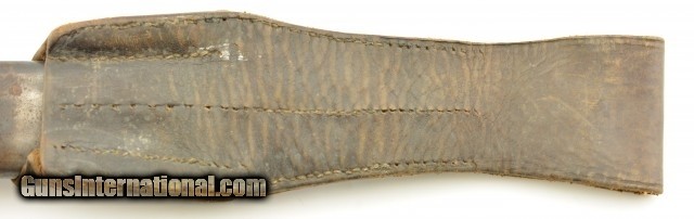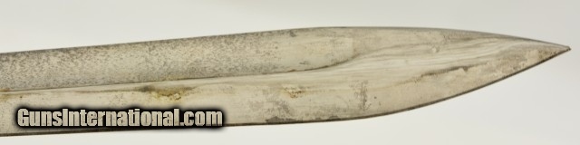 Description: German M1898/05 rifle Bayonet & scabbard with frog from WWI. This is a nice example of a Fichtel & Sadhs Schweinfurt, late type 98/05 with a trimmed muzzle ring and with flash guard. The blade is excellent original condition, light oxidation freckling, no chip with correct tip, length is correct at 14 3/8", has been sharpened once. Handle is also in fine condition with nice brown patina. There is a little surface oxidation on pommel, handle and guard. The frog is in very good condition with fairly supple leather and only a couple stitches missing. The scabbard is in very good condition with a good deal of bluing with surface oxidation, under the frog all of finish is worn away. Spine markings correct with manufacture date of 1917. SOLD |