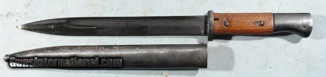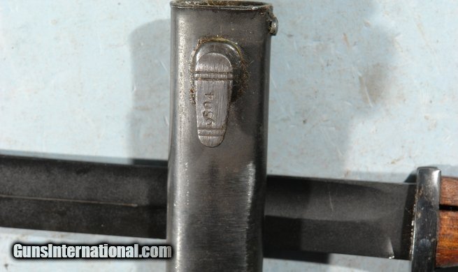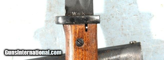 Description: GERMAN POST WW1 WWI MAUSER S84/98 GEW98 K98K BAYONET & SCABBARD BY WEYERSBURG UND KIRSCHBAUM (W.u.K.), CIRCA 1920. Manufactured after WW1 by Weyersburg und Kirschbaum and stamped "20" (1920) on back of blade with other smalls proofs. "W.u.K" proof on ricasso. Four digit number on guard and other Weimar republic small eagle proofs elsewhere. Original false edge and flat/matte blue black finish to blade. Blue finish to all other metal parts including scabbard with nonmatching numbers on period scabbard which has some small areas of salt and pepper but correct fit and does Not rattle. Wood grip panels held with slotted screws. SOLD |