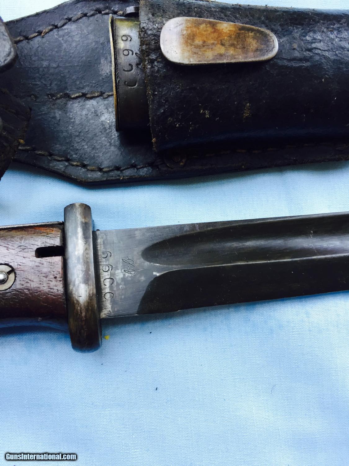 Description: Near Mint K-98 bayonet with scabbord that has matching serial number to the blade comes with orginal black leather frog SOLD |