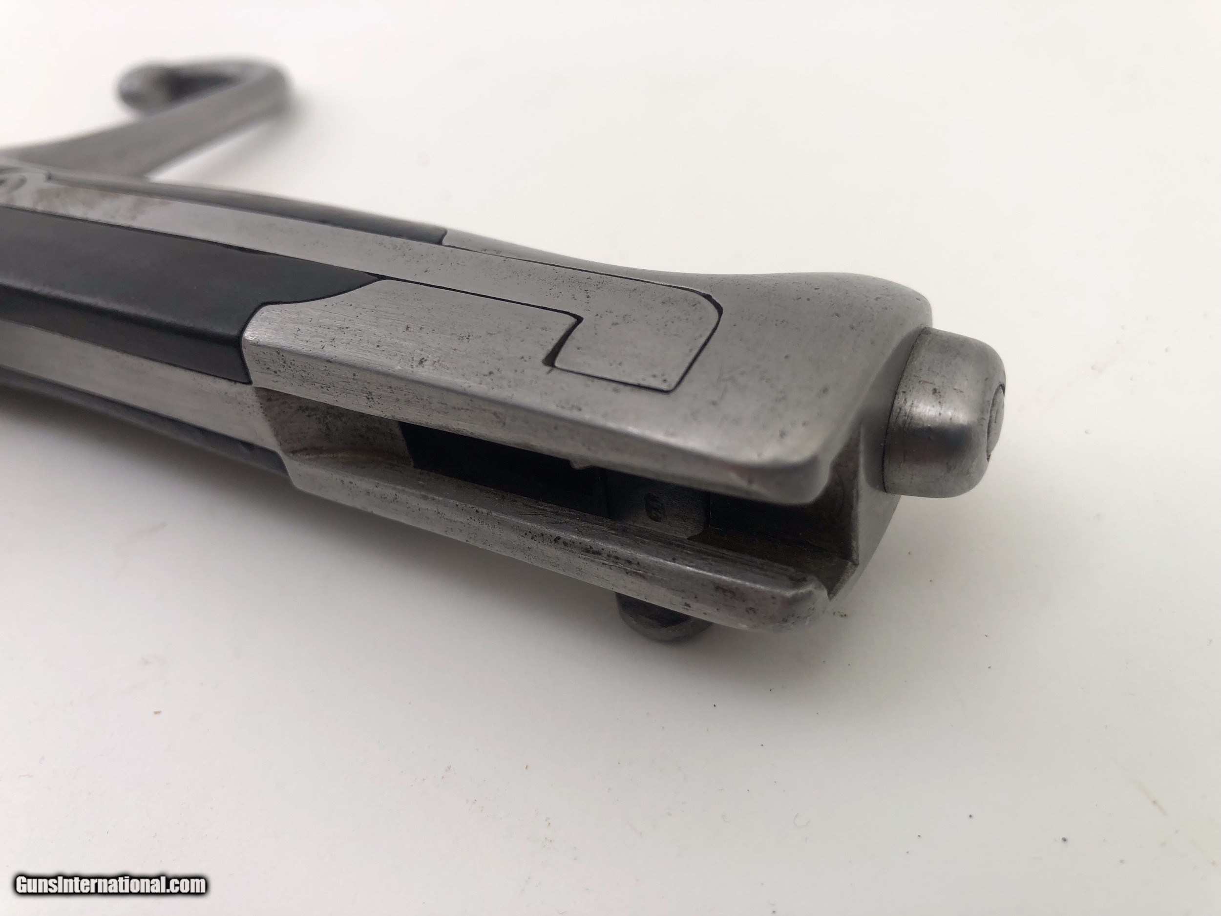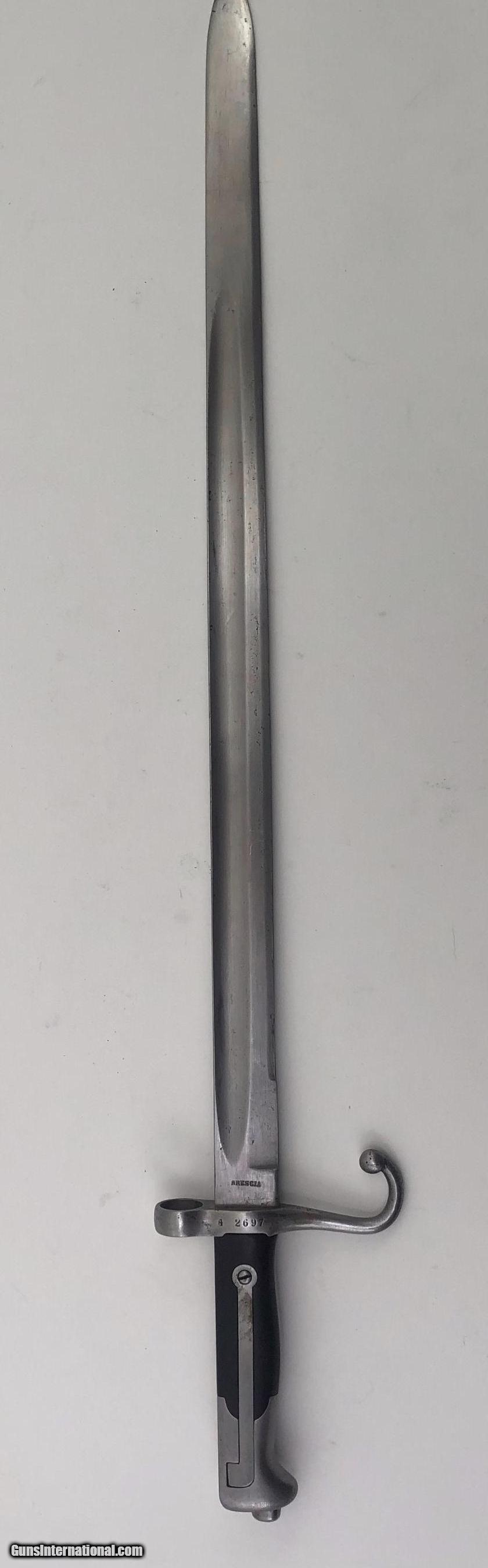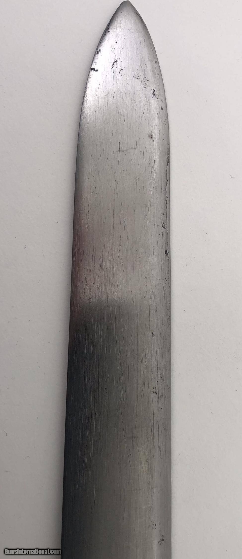 Description: Dimensions-- Overall 25.25" Blade 20.25" Muzzle ring inside diameter .68" Condition-- Hilt and blade are gray metal and appear to have been cleaned. Right grip is excellent and the left has some damage at upper edge. See photos. SOLD |