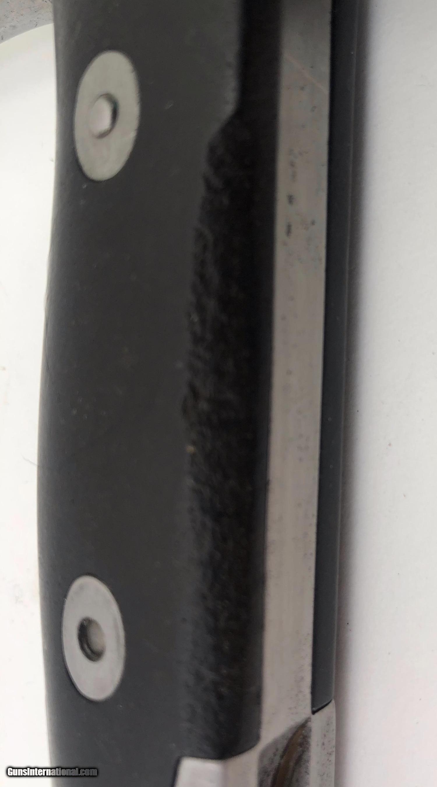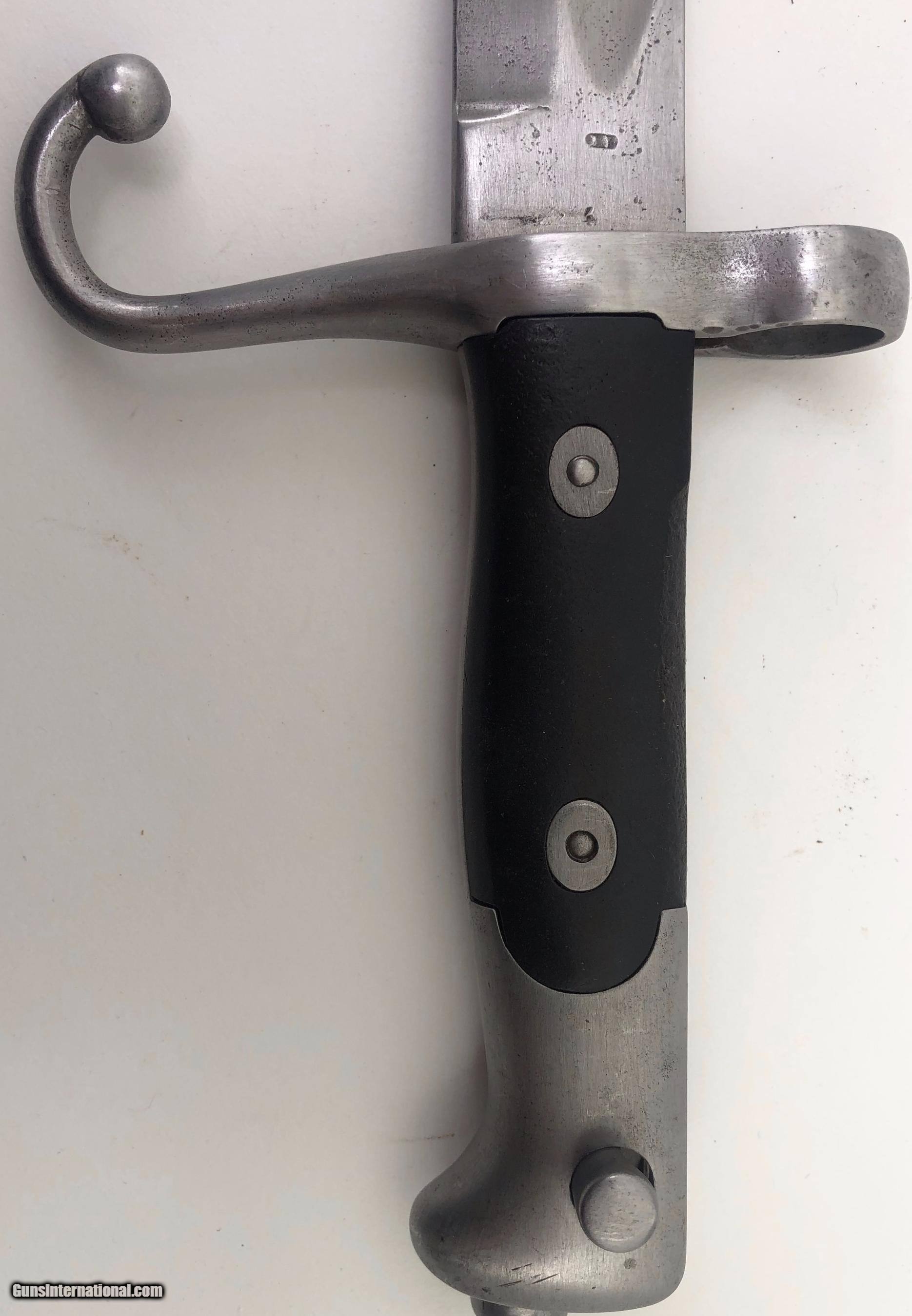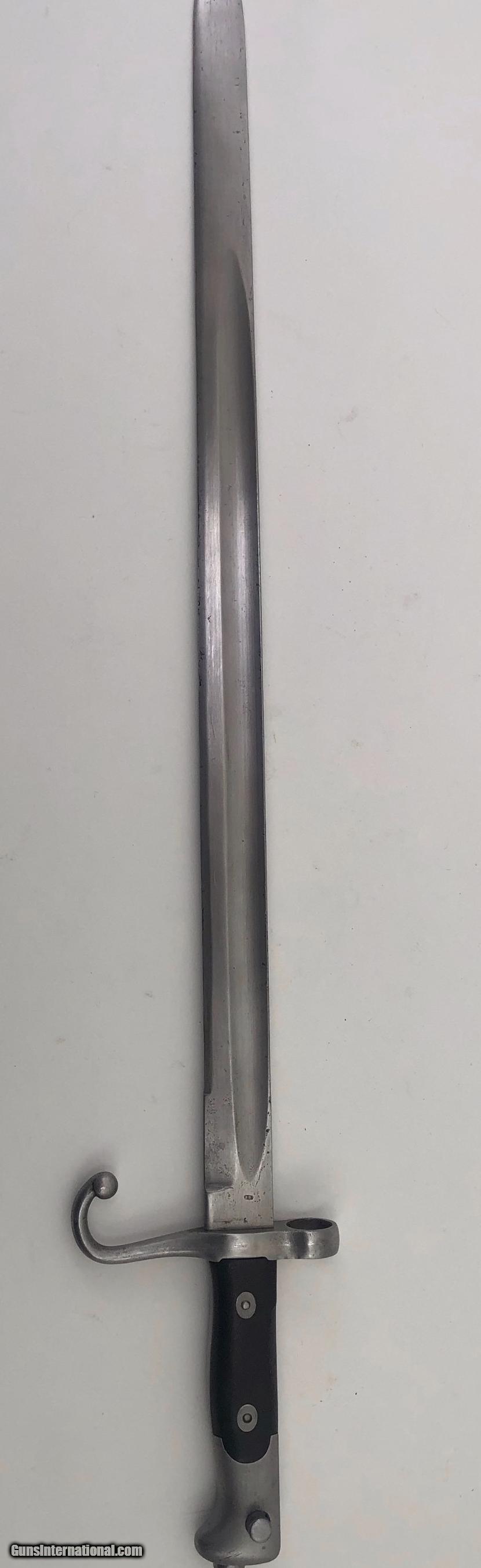 Description: Dimensions-- Overall 25.25" Blade 20.25" Muzzle ring inside diameter .68" Condition-- Hilt and blade are gray metal and appear to have been cleaned. Right grip is excellent and the left has some damage at upper edge. See photos. SOLD |
