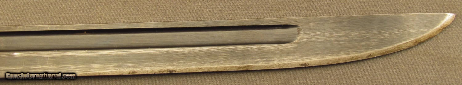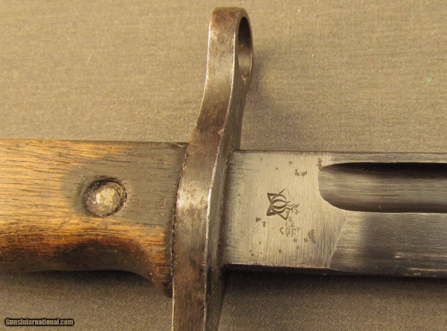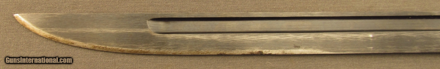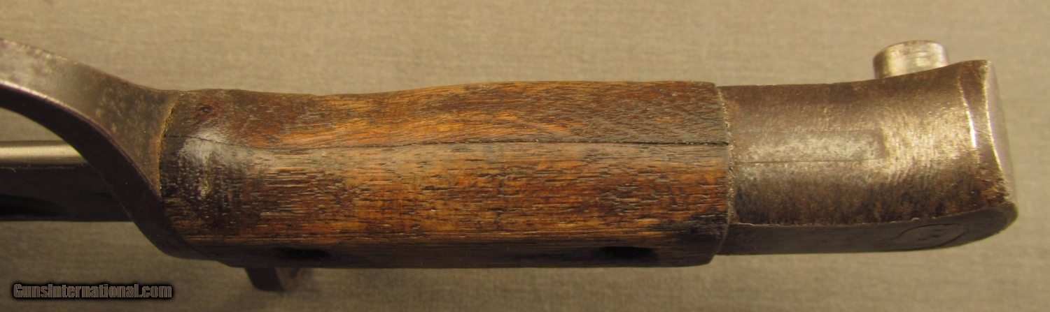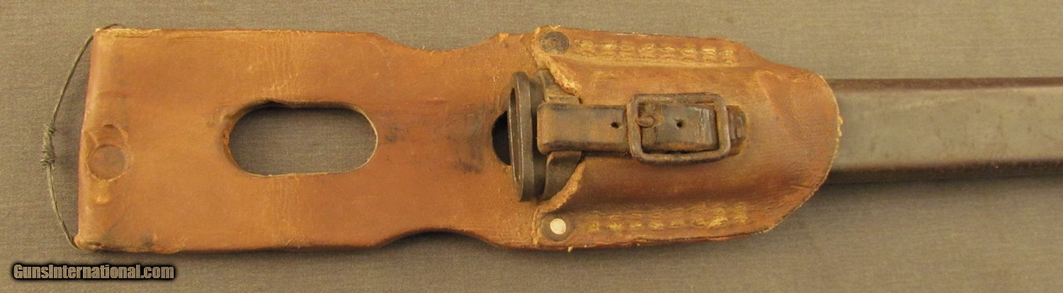 Description: This type 30 bayonet features a flat bird's head pommel with number (75772), riveted grips, blued blade with fullers, and hooked quillon. The ricasso is stamped with Jinsen arsenal symbol. Quillon and pommel retain 40% fading blue with light oxidation staining. The blade shows a period sharpening on first six inches and retains 90% bright blue. The later type scabbard has browned with nice patina and still wears original rubber frog with solid top. A great Japanese bayonet set with the scarcer rubber frog. SOLD Manufacturer: Japanese Model: Type 30 |