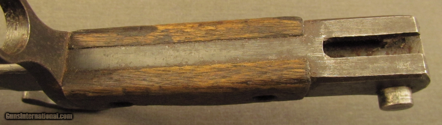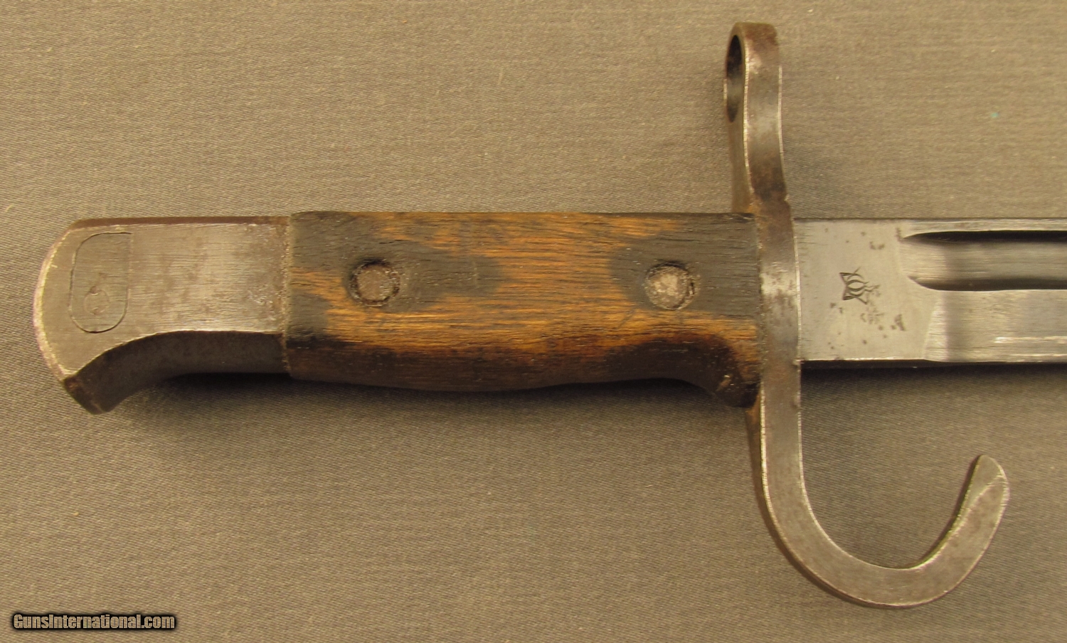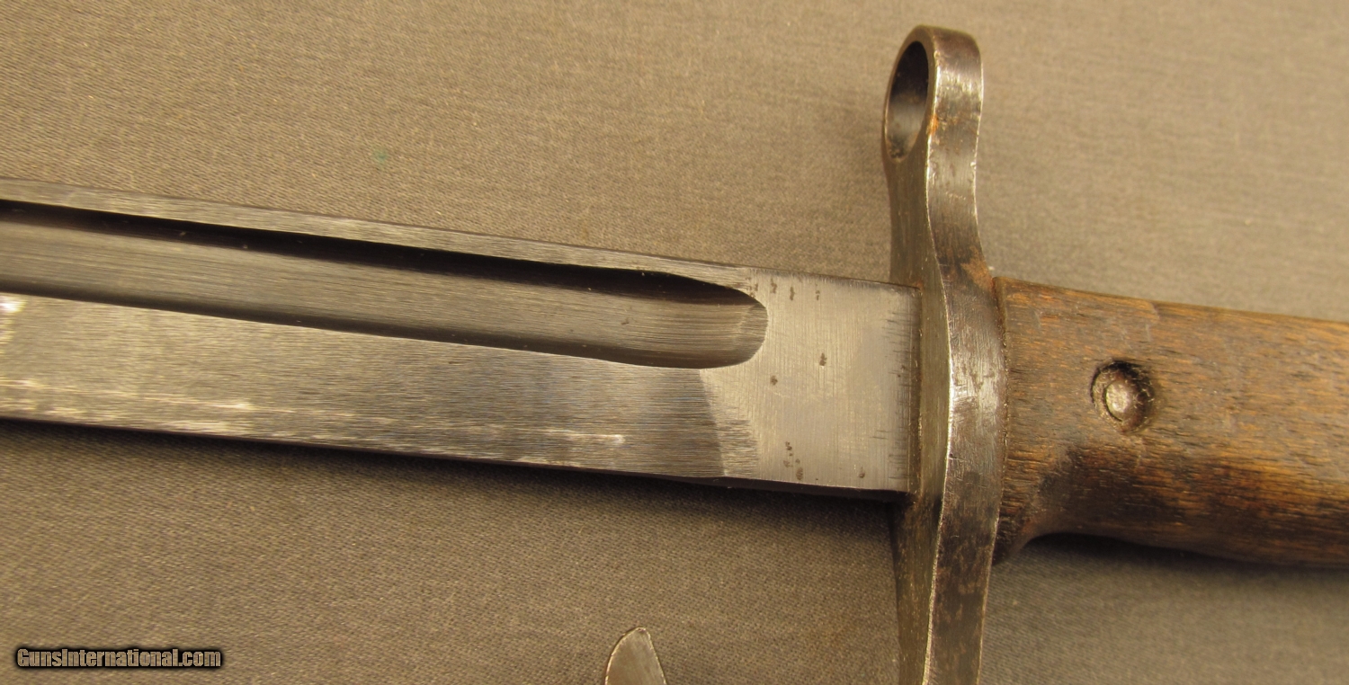 Description: This type 30 bayonet features a flat bird's head pommel with number (75772), riveted grips, blued blade with fullers, and hooked quillon. The ricasso is stamped with Jinsen arsenal symbol. Quillon and pommel retain 40% fading blue with light oxidation staining. The blade shows a period sharpening on first six inches and retains 90% bright blue. The later type scabbard has browned with nice patina and still wears original rubber frog with solid top. A great Japanese bayonet set with the scarcer rubber frog. SOLD Manufacturer: Japanese Model: Type 30 |