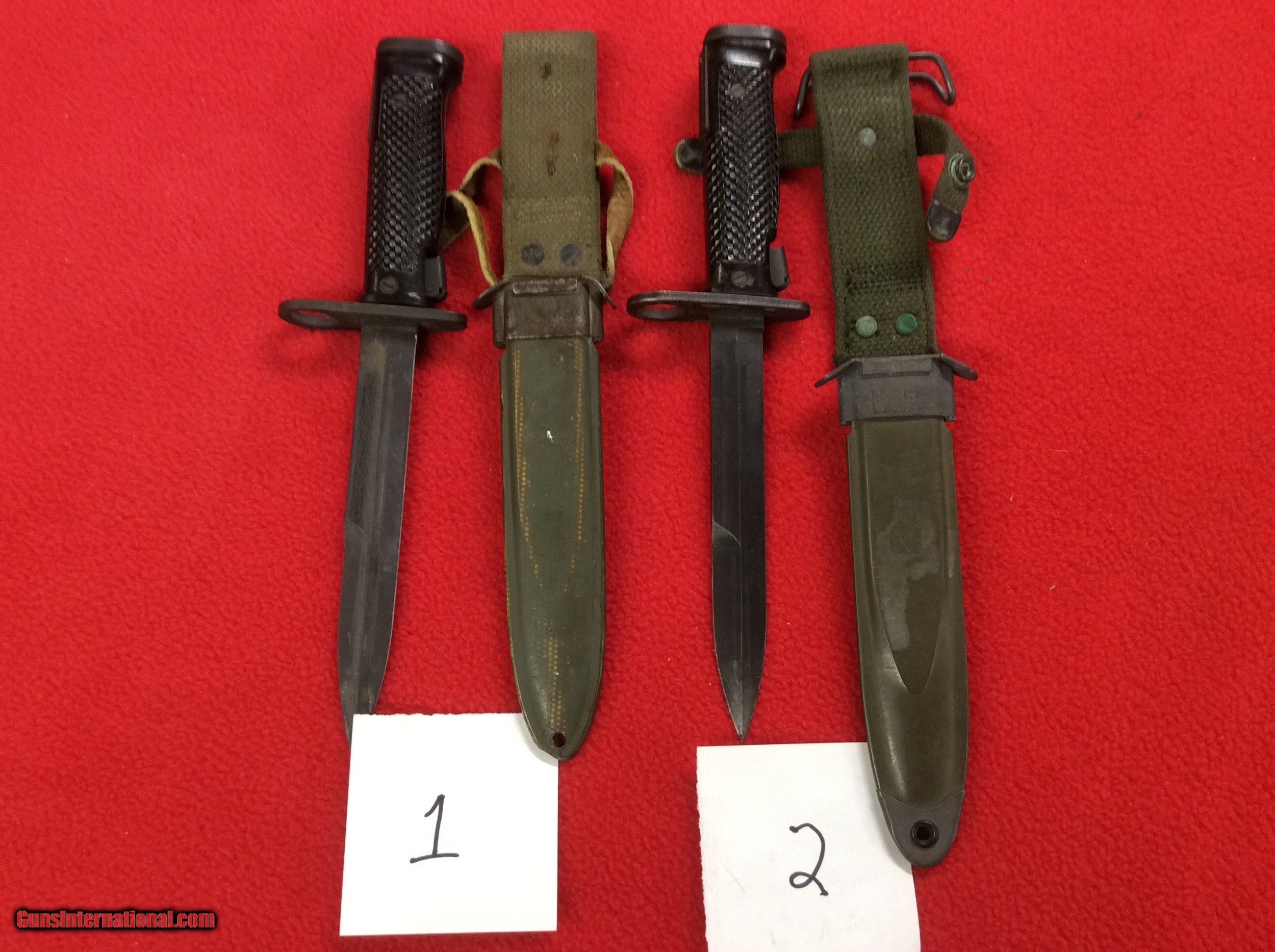Description: FOR SALE ARE TWO M-14 BAYONETS. ONE IS A. USM8 MADE BY BM CO. NO. 2 IS A USM8A1 MADE BY PML CO. BOT IN GOOD CONDITION NO RUST OR DINGS TO THE BLADE CALL OR EMAI FOR MORE INFO ETC. THANS FOR LOOKING SOLD |
