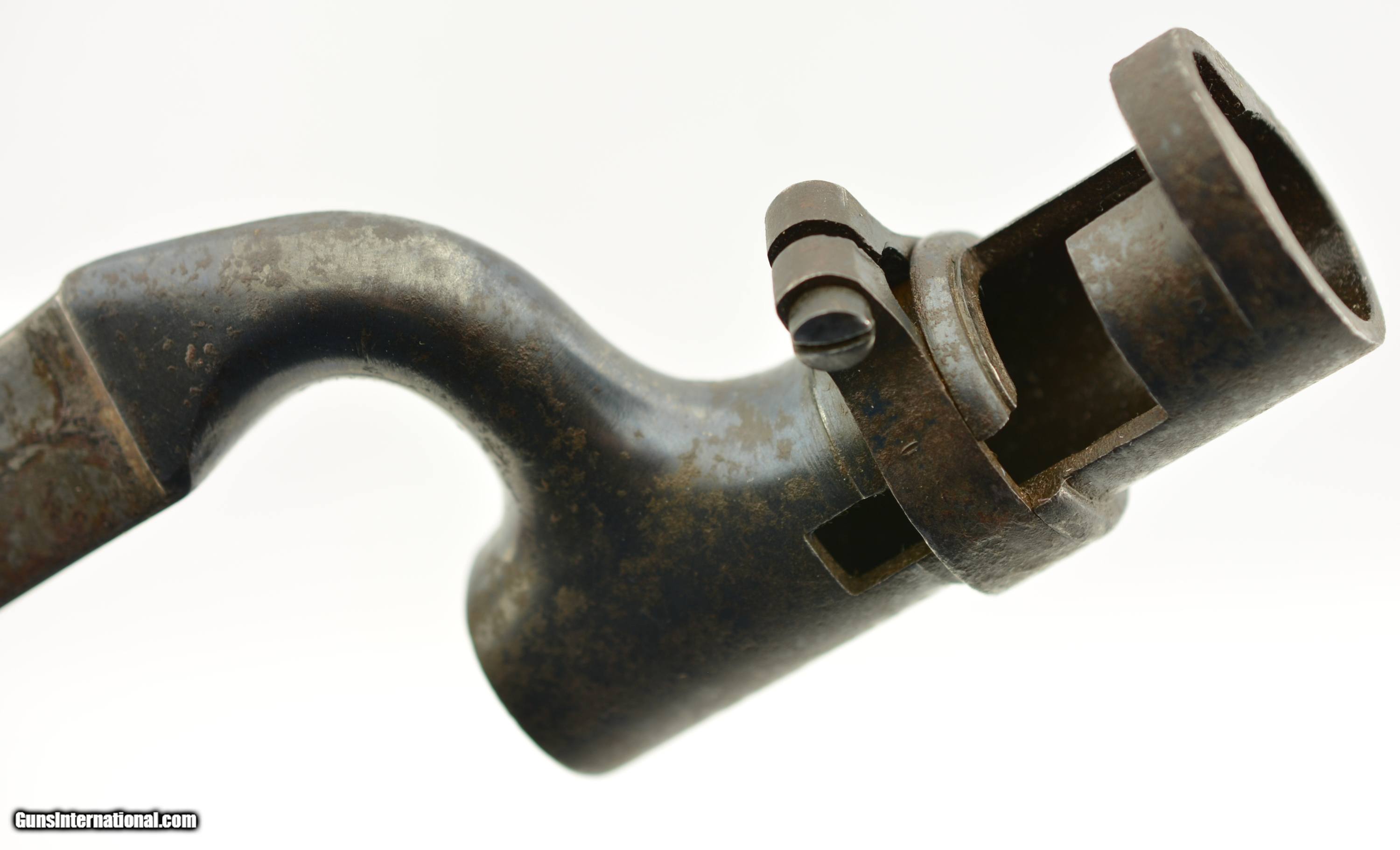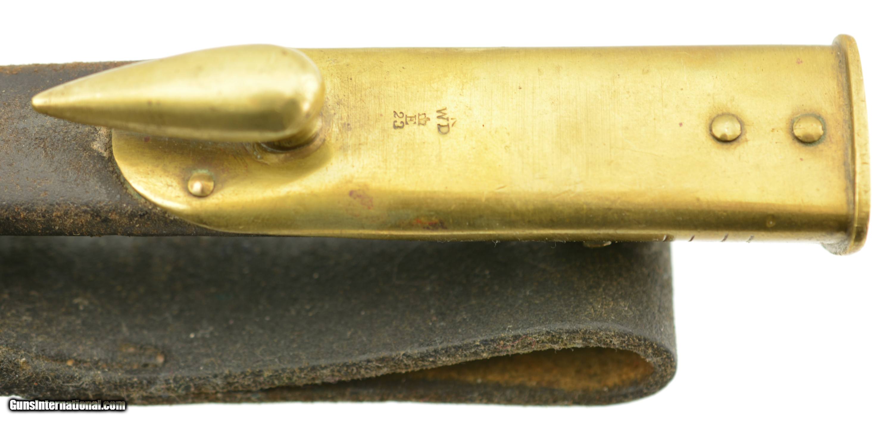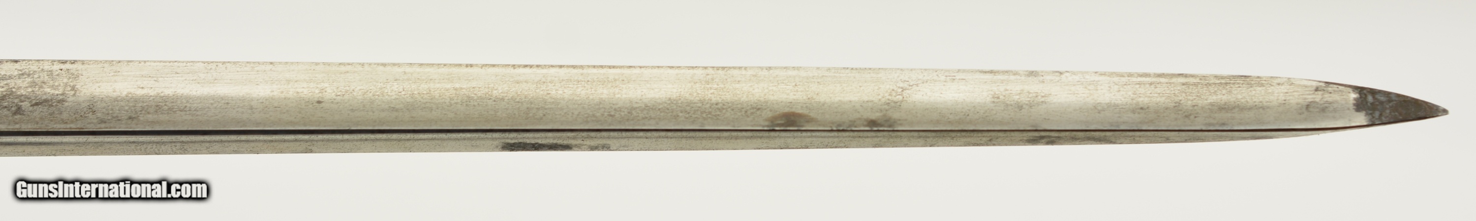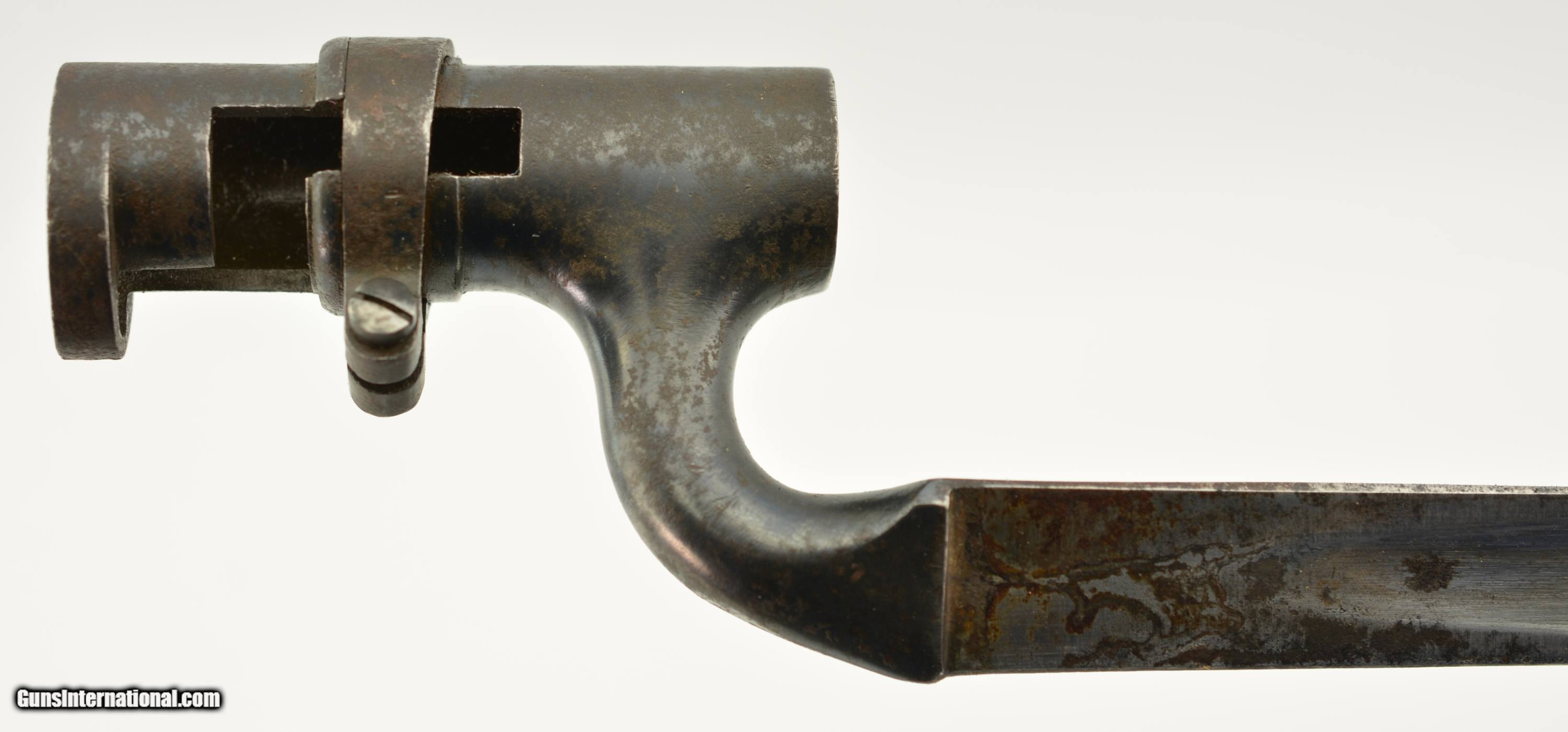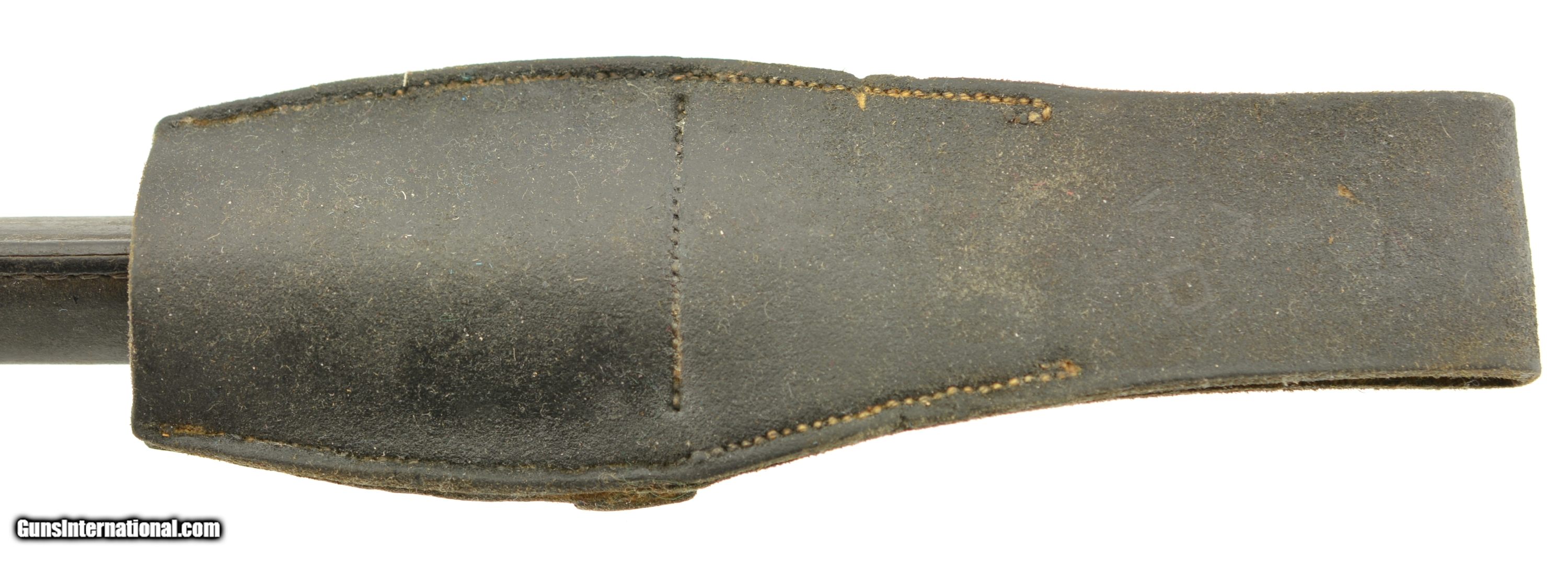 Description: Serial #315 and made in 1888 this Martini-Henry Common Long Bayonet sometimes referred to the pattern 1876 is in excellent condition with only slight surface oxidation and spotting on the 22" blade with most, 80-85% of the original bluing on the socket. Sharp English war department stamp, WD, the year and others are found on the blade and the socket. This bayonet comes complete with a fine example of the Mark 1 three rivet scabbard with nearly all of the metals original finish and sharp WD Crown/E 23. The leather is in excellent condition with only one area of wear hidden and caused by the frog. The heavy frog is in excellent condition with tight stitching, a bit on the stiff side leather. It is also WD marked over a 5. Fine example of the Martini-Henry Long Common. SOLD Manufacturer: British Model: Bayonet |