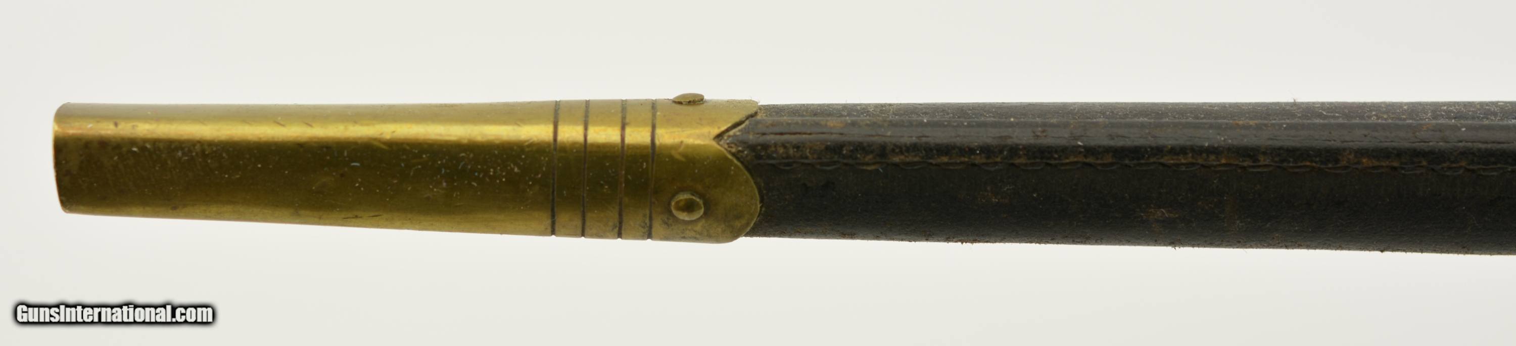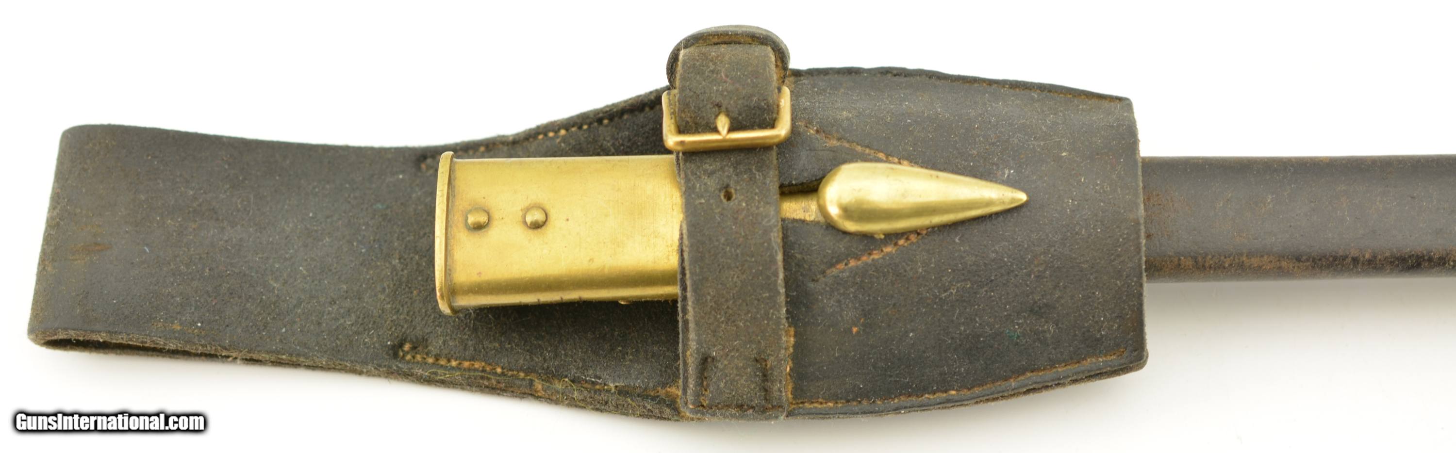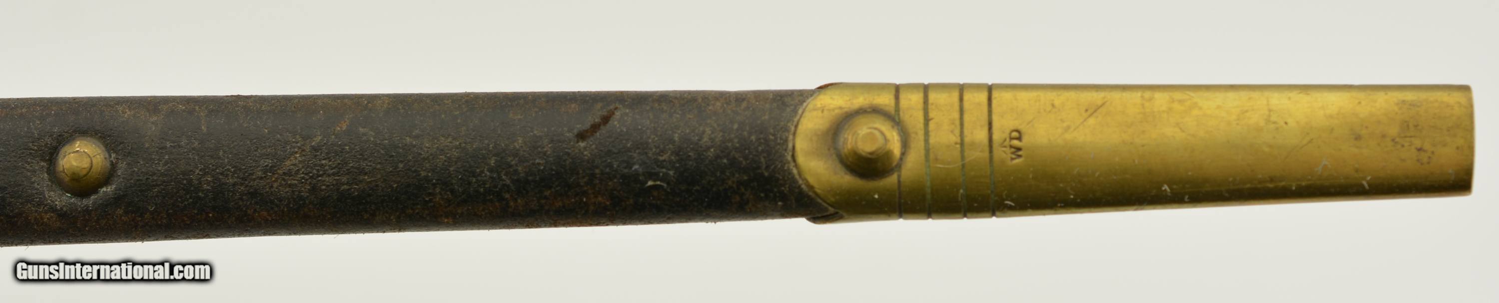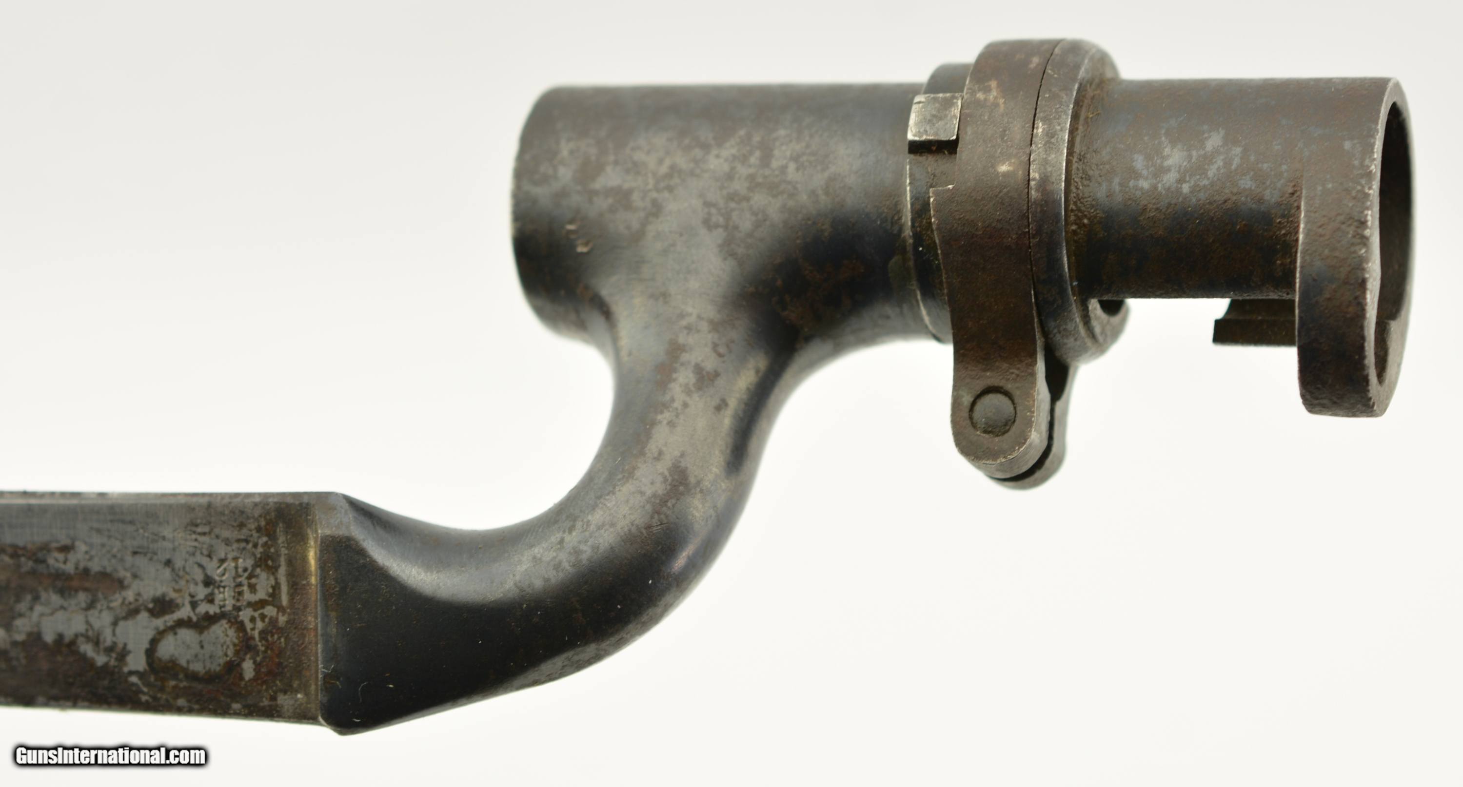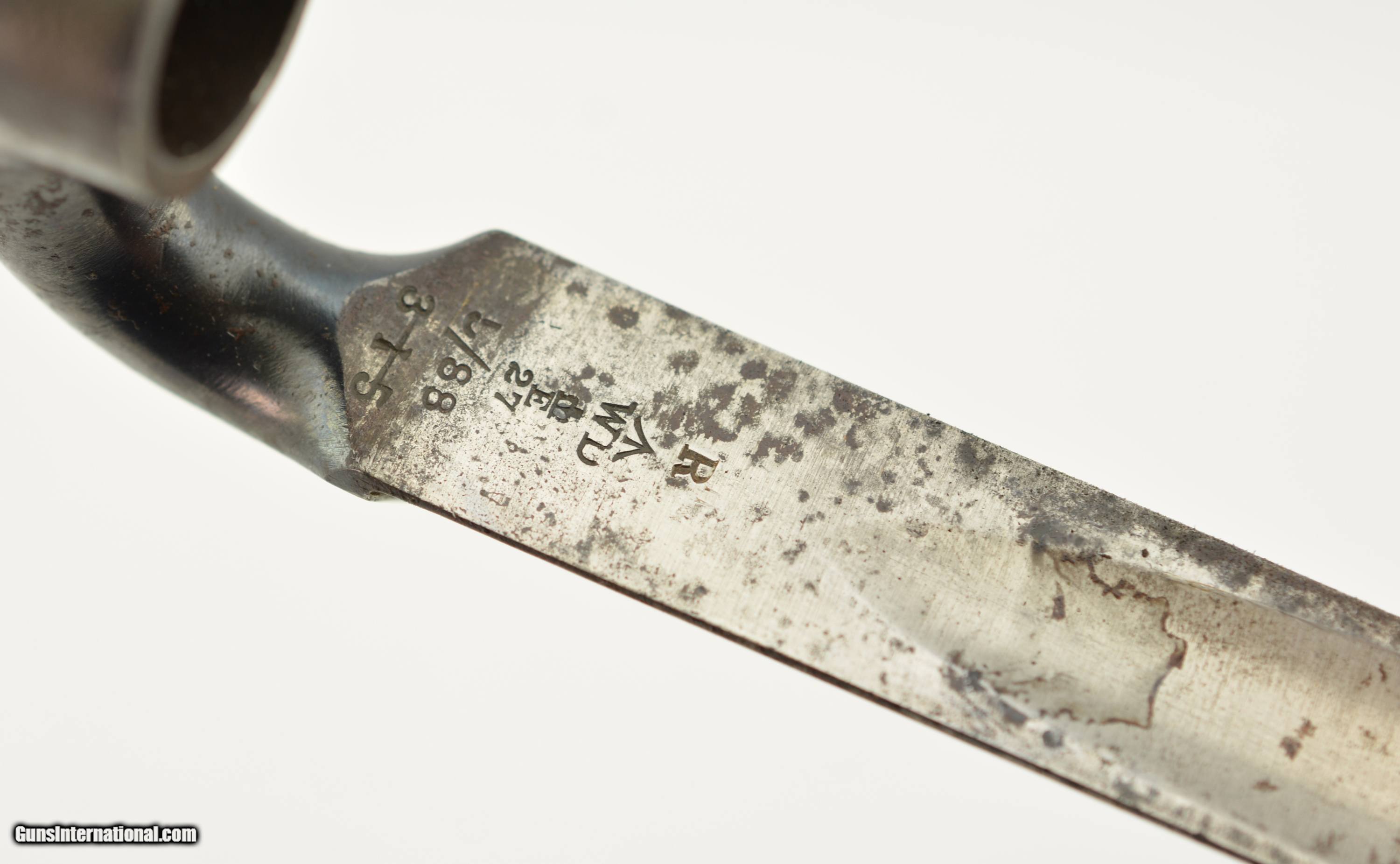 Description: Serial #315 and made in 1888 this Martini-Henry Common Long Bayonet sometimes referred to the pattern 1876 is in excellent condition with only slight surface oxidation and spotting on the 22" blade with most, 80-85% of the original bluing on the socket. Sharp English war department stamp, WD, the year and others are found on the blade and the socket. This bayonet comes complete with a fine example of the Mark 1 three rivet scabbard with nearly all of the metals original finish and sharp WD Crown/E 23. The leather is in excellent condition with only one area of wear hidden and caused by the frog. The heavy frog is in excellent condition with tight stitching, a bit on the stiff side leather. It is also WD marked over a 5. Fine example of the Martini-Henry Long Common. SOLD Manufacturer: British Model: Bayonet |