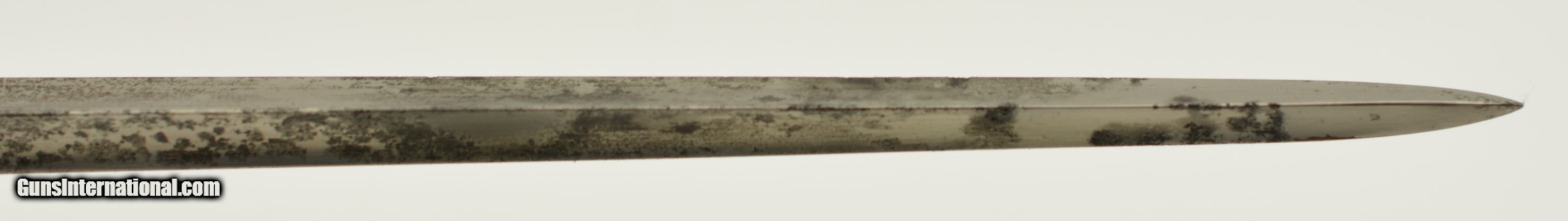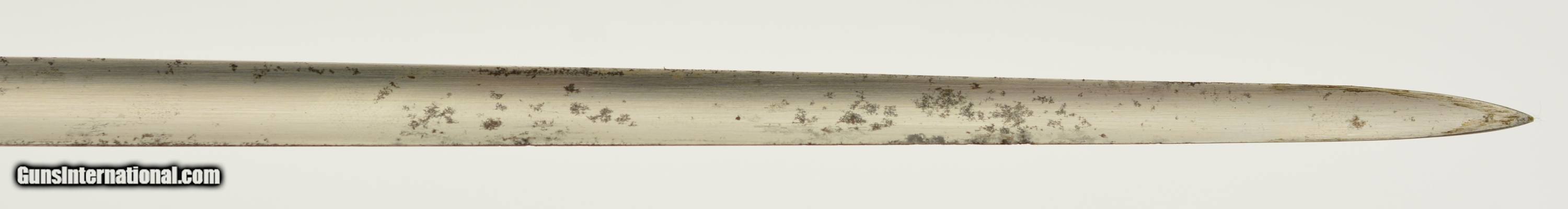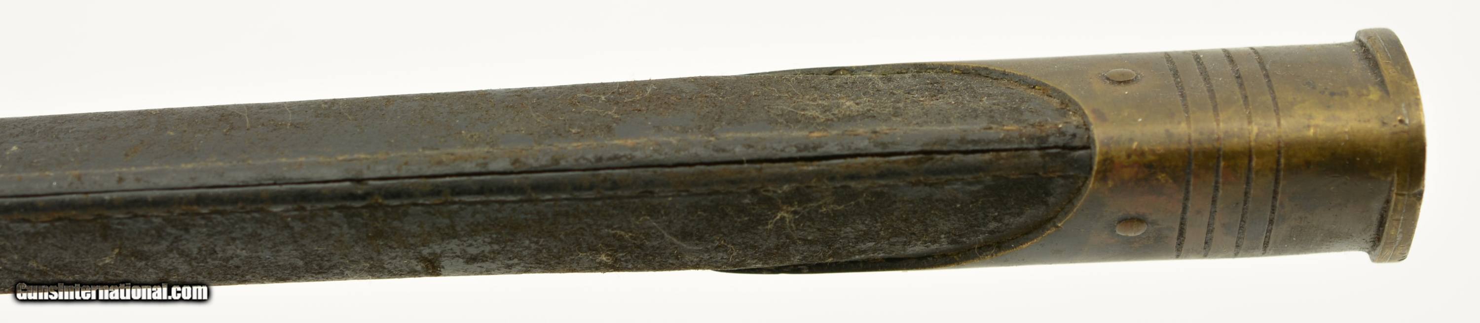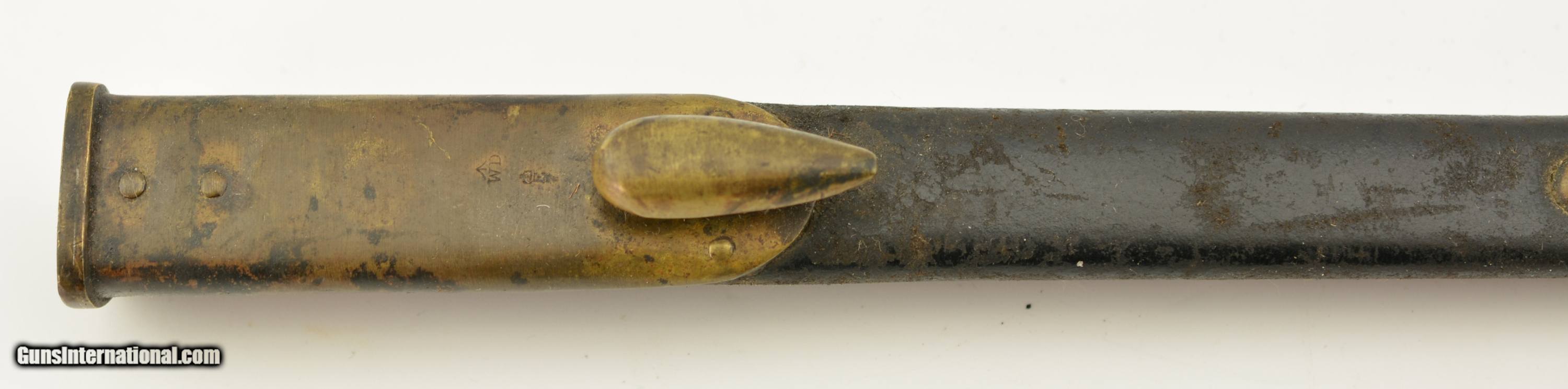 Description: This is a Martini-Henry Common Long Bayonet sometimes referred to the pattern 1876, blade is in very good bright condition with only slight surface oxidation, dark spots and scattered pitting on the blade and 85% of the original bluing on the socket. Sharp English war department stamp, WD alone with other markings. This comes with a very good to excellent 2 rivet Mk II scabbard. All stitching is tight with a nice patina on the brass with WD Broad head markings. Fine original example of the pattern 1876. SOLD |