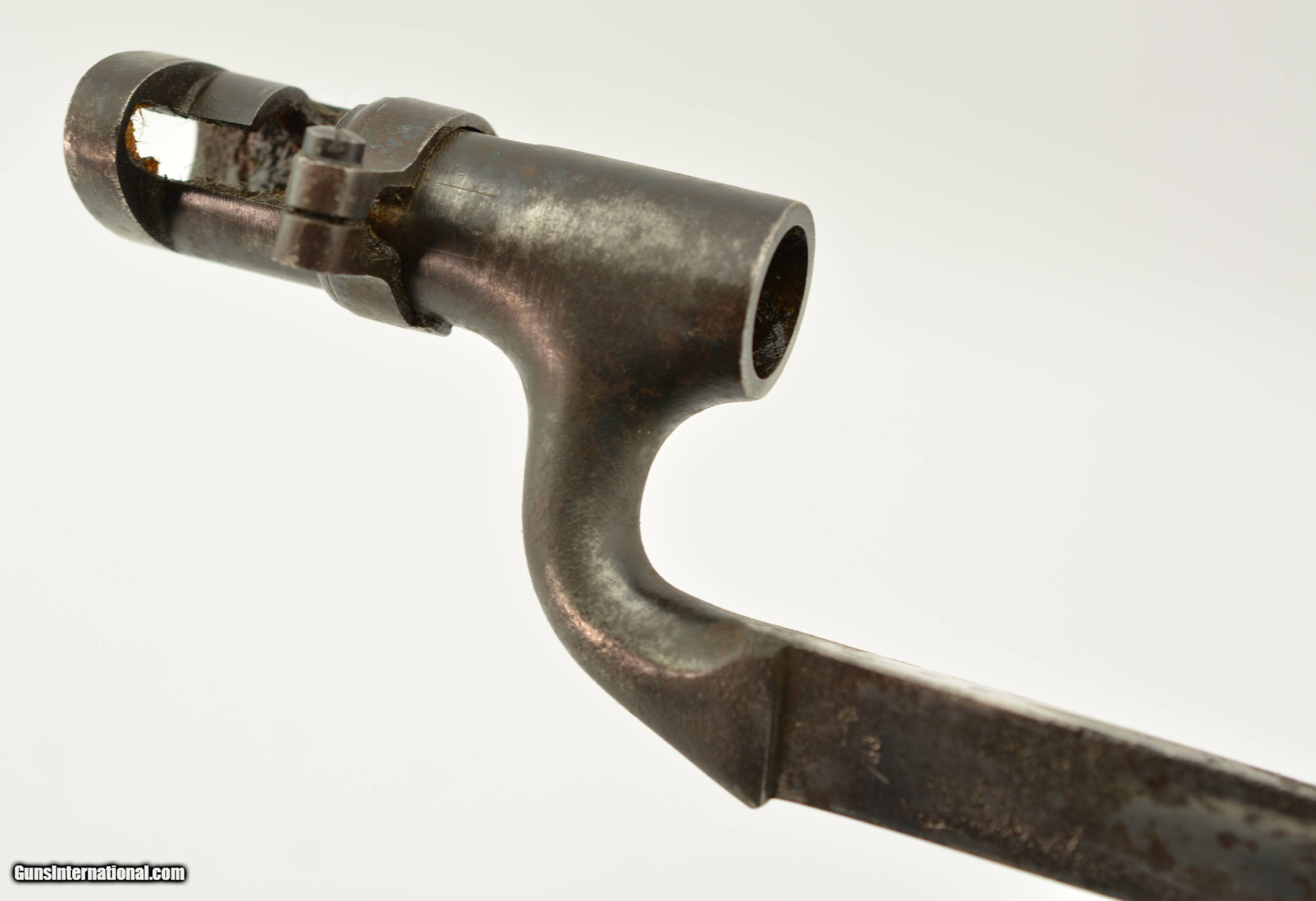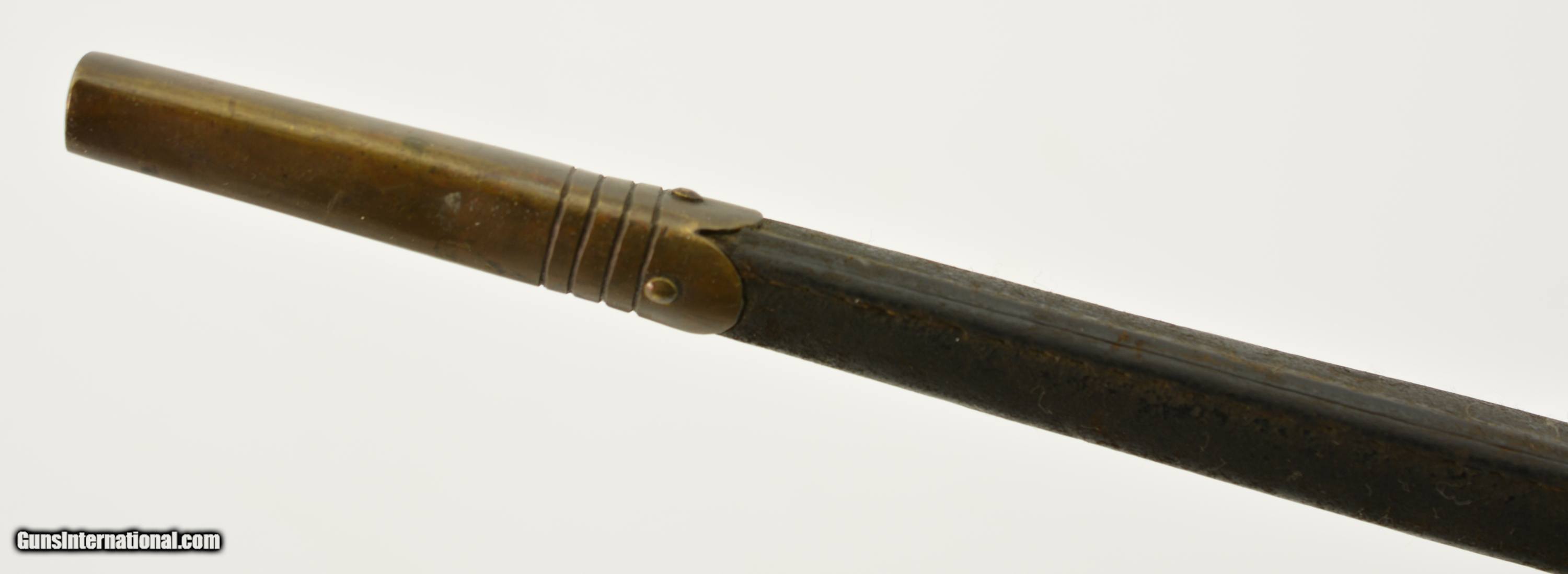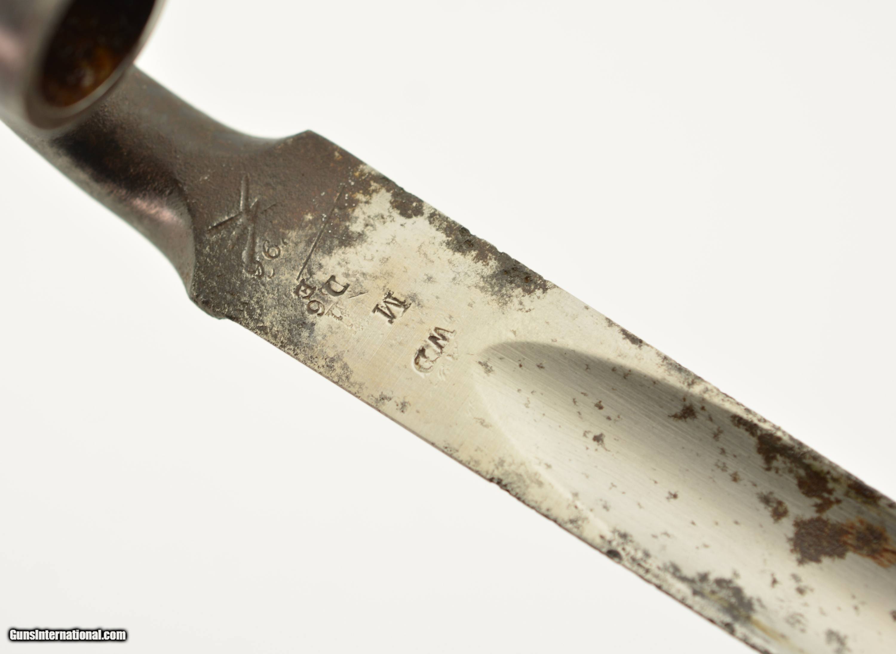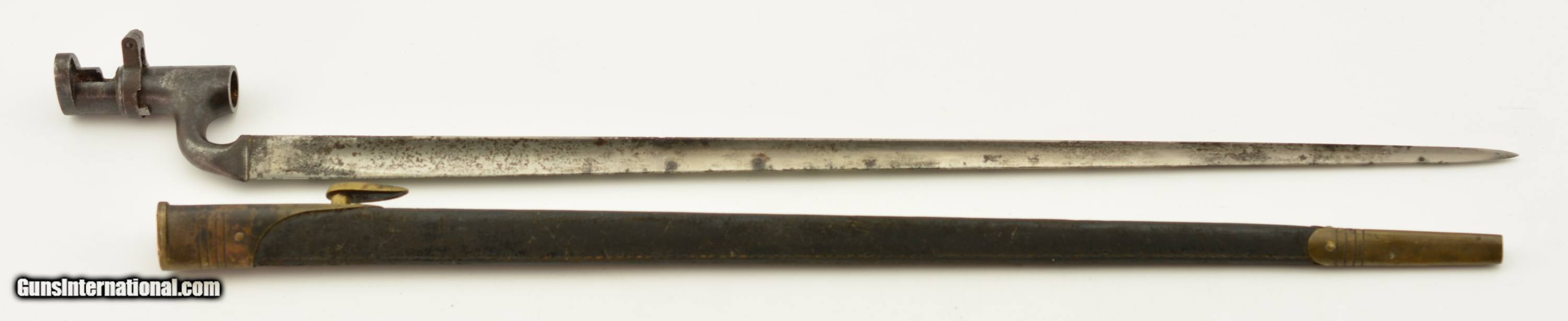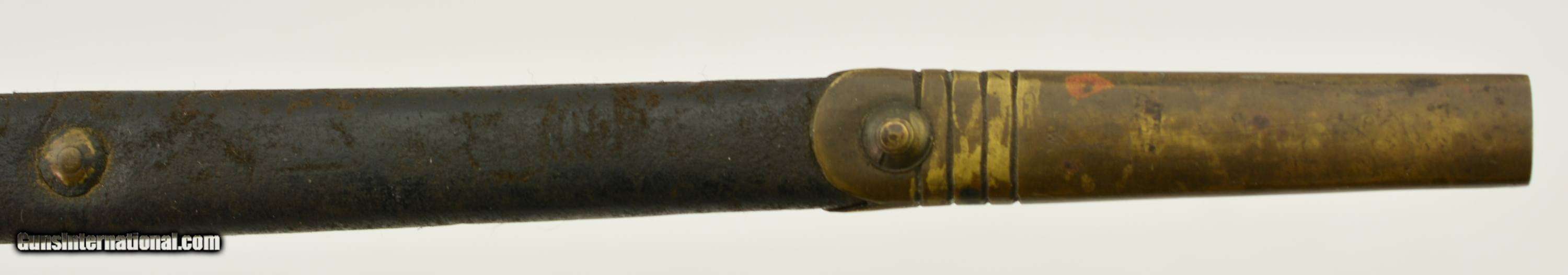 Description: This is a Martini-Henry Common Long Bayonet sometimes referred to the pattern 1876, blade is in very good bright condition with only slight surface oxidation, dark spots and scattered pitting on the blade and 85% of the original bluing on the socket. Sharp English war department stamp, WD alone with other markings. This comes with a very good to excellent 2 rivet Mk II scabbard. All stitching is tight with a nice patina on the brass with WD Broad head markings. Fine original example of the pattern 1876. SOLD |