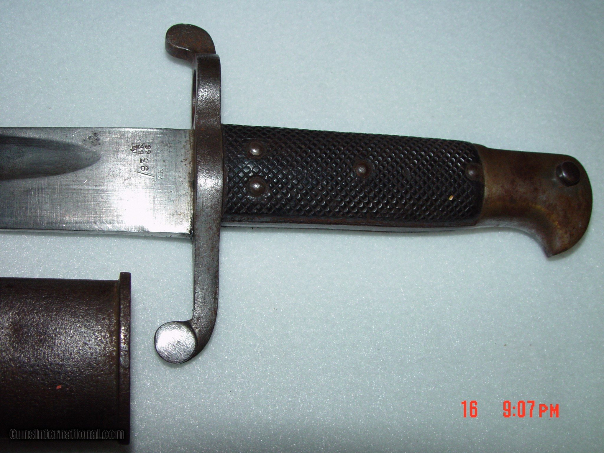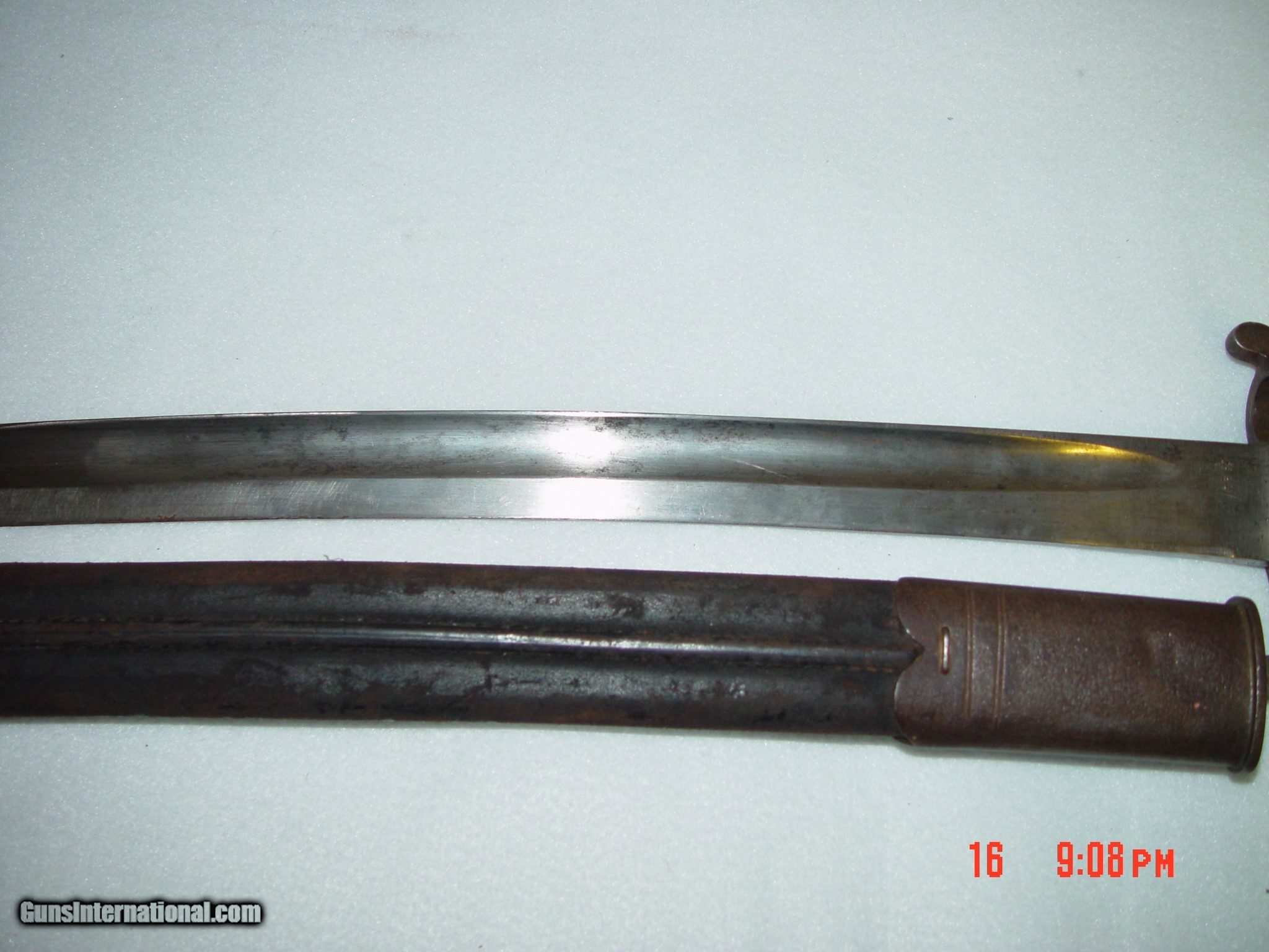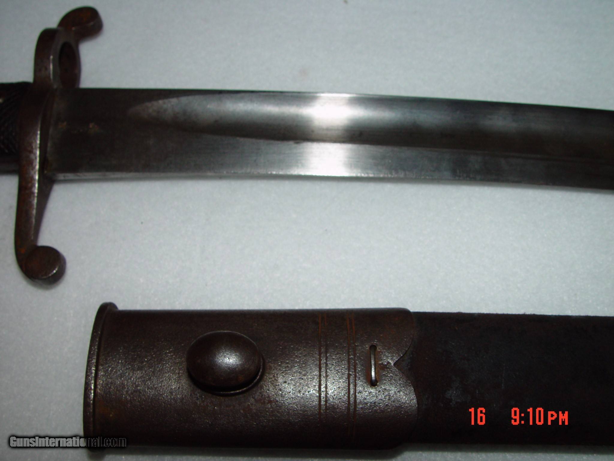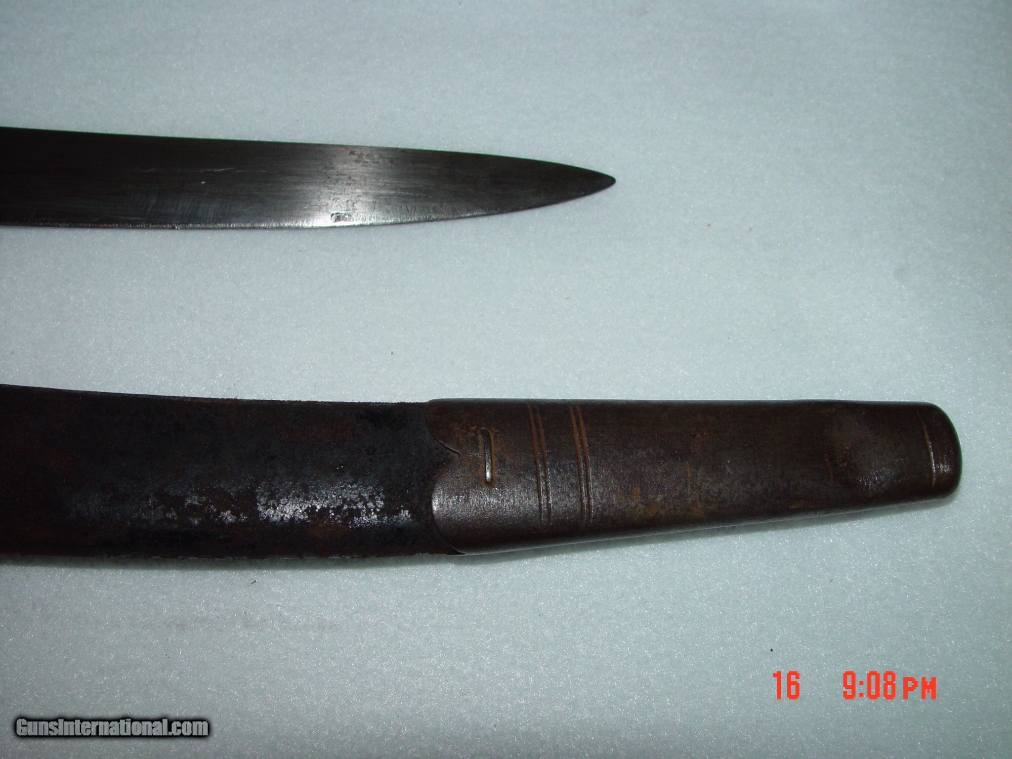 Description: THIS BAYONET HAS A 22 3/4" CURVED BLADE AND LEATHER/METAL SCABBARD WITH SOME SCUFFING ON THE LEATHER AND SOME LIGHT SURFACE RUST ON THE HANDLE METAL. ALL MARKINGS OBSERVED ARE SHOWN. SOLD |