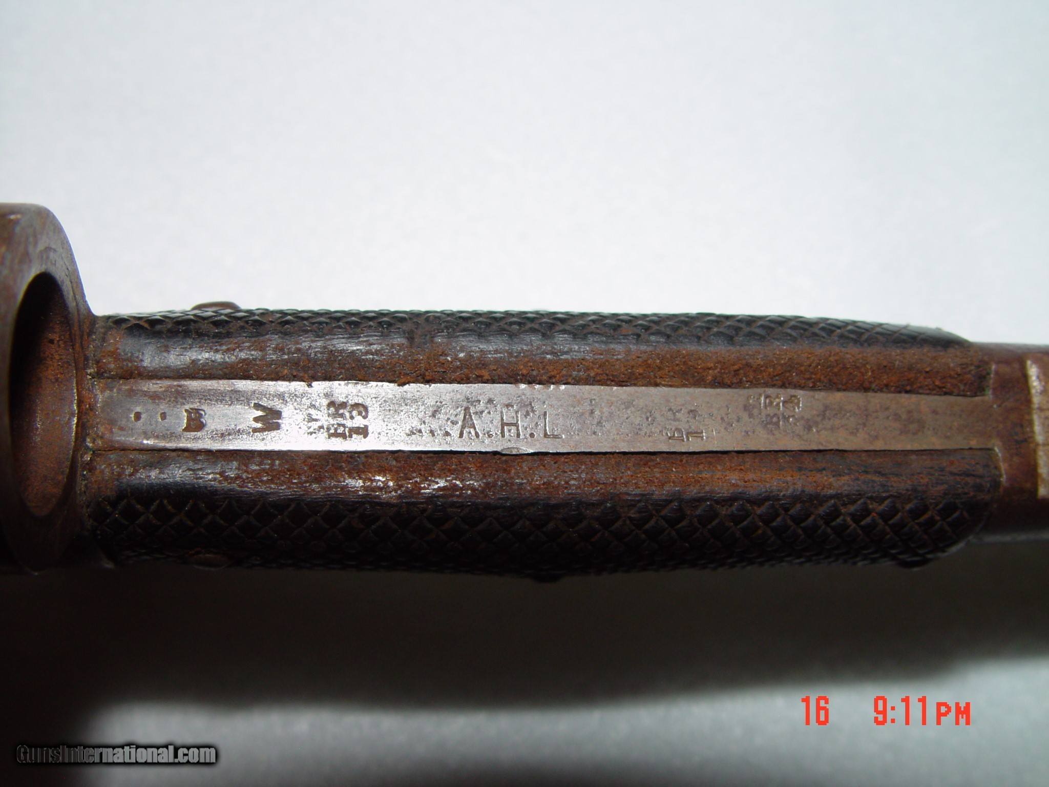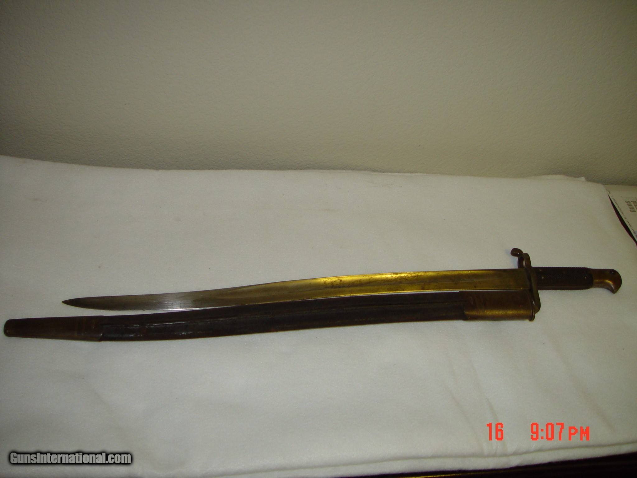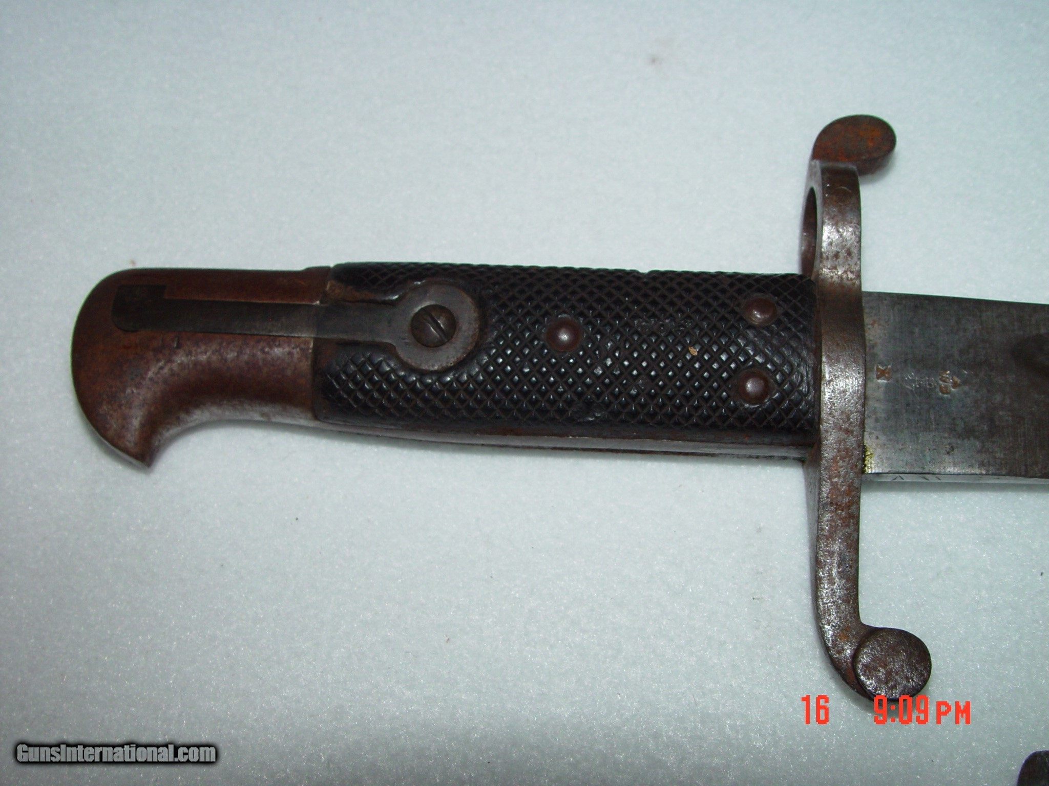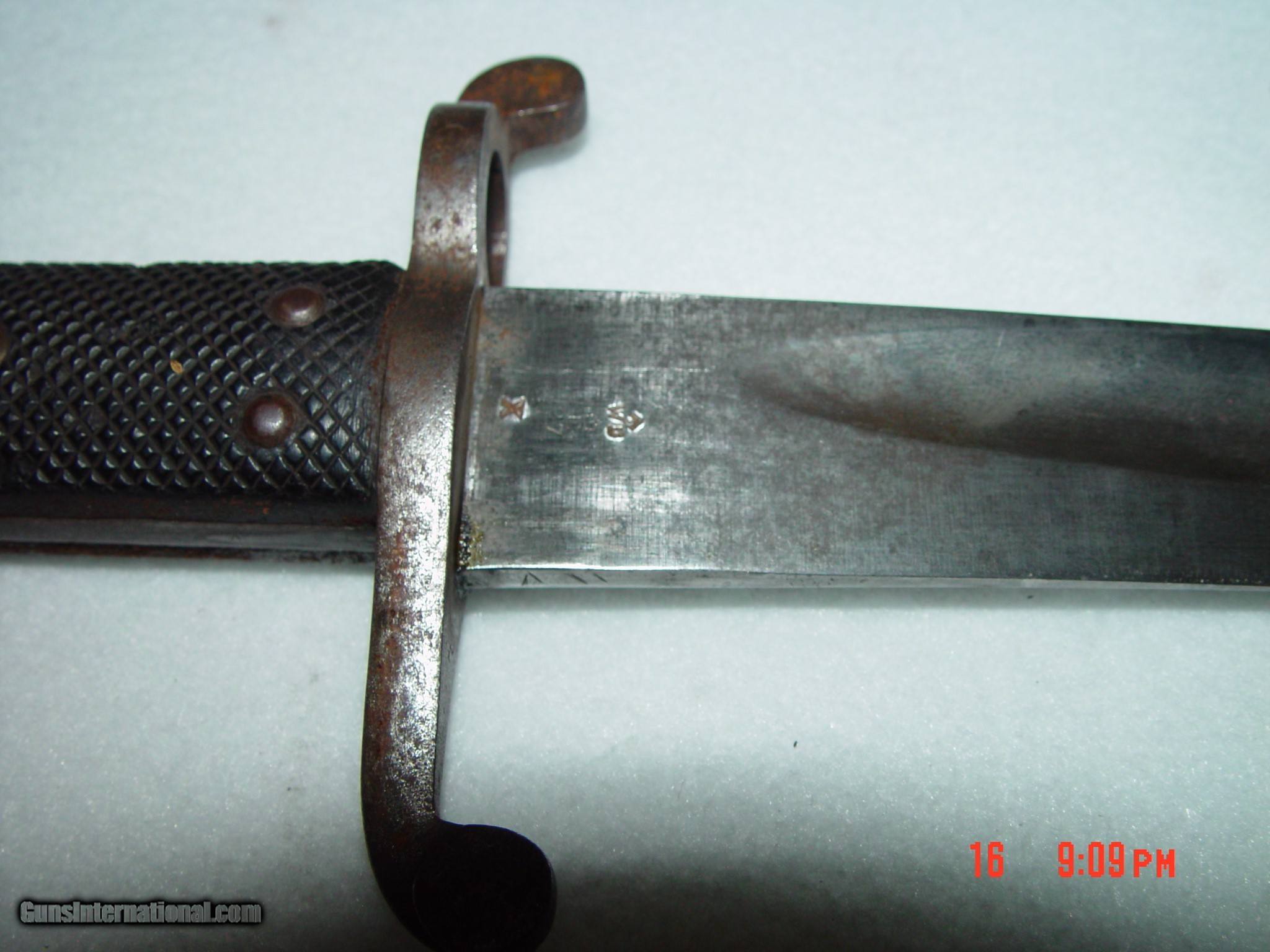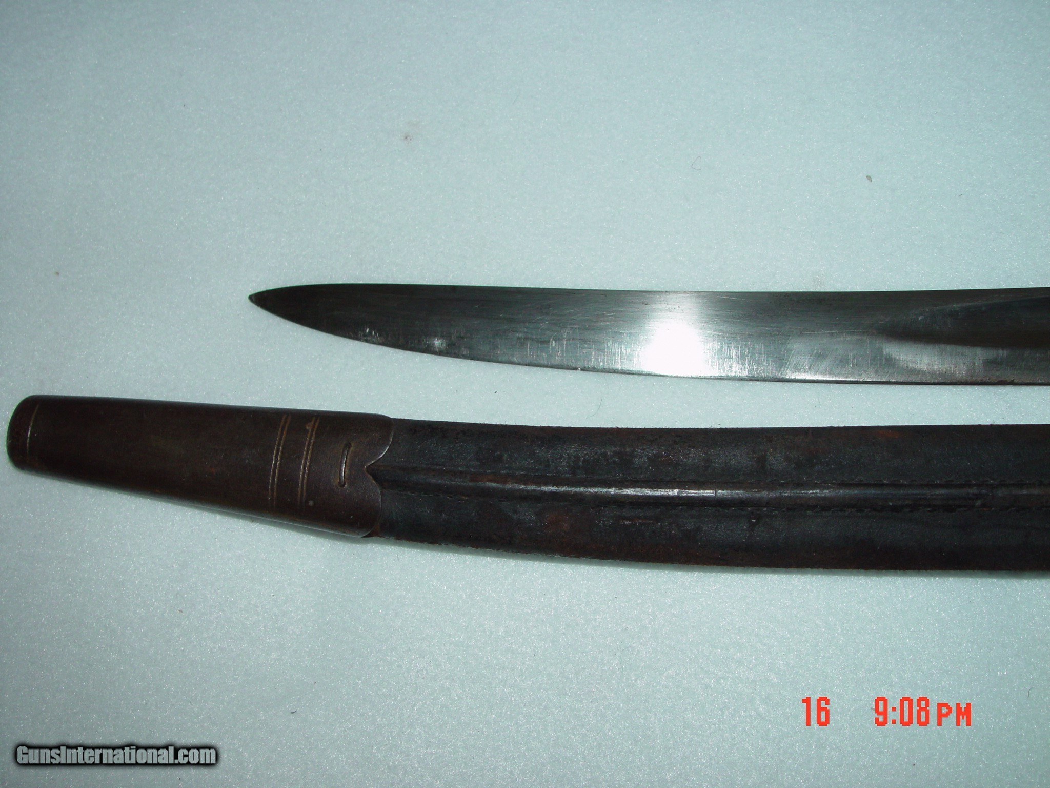 Description: THIS BAYONET HAS A 22 3/4" CURVED BLADE AND LEATHER/METAL SCABBARD WITH SOME SCUFFING ON THE LEATHER AND SOME LIGHT SURFACE RUST ON THE HANDLE METAL. ALL MARKINGS OBSERVED ARE SHOWN. SOLD |