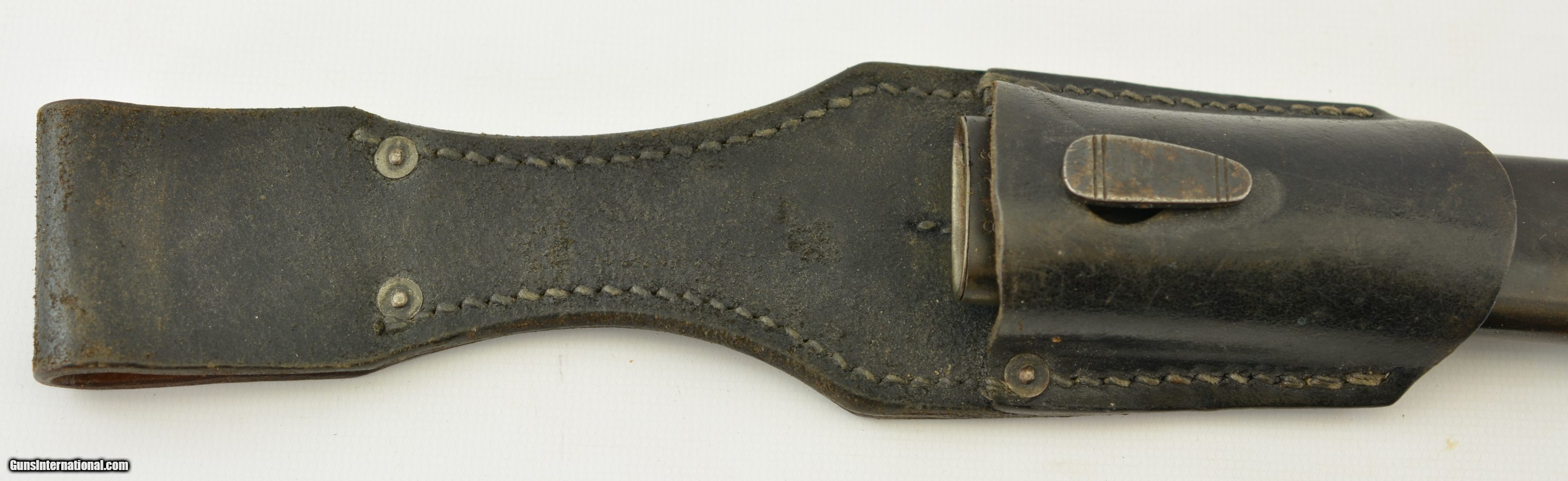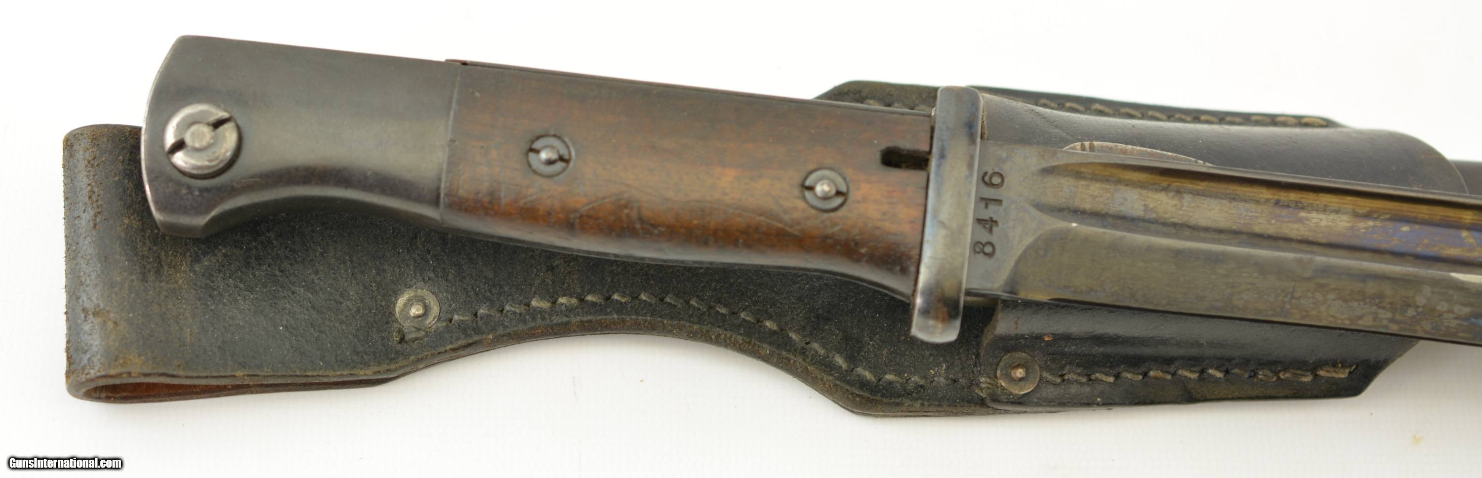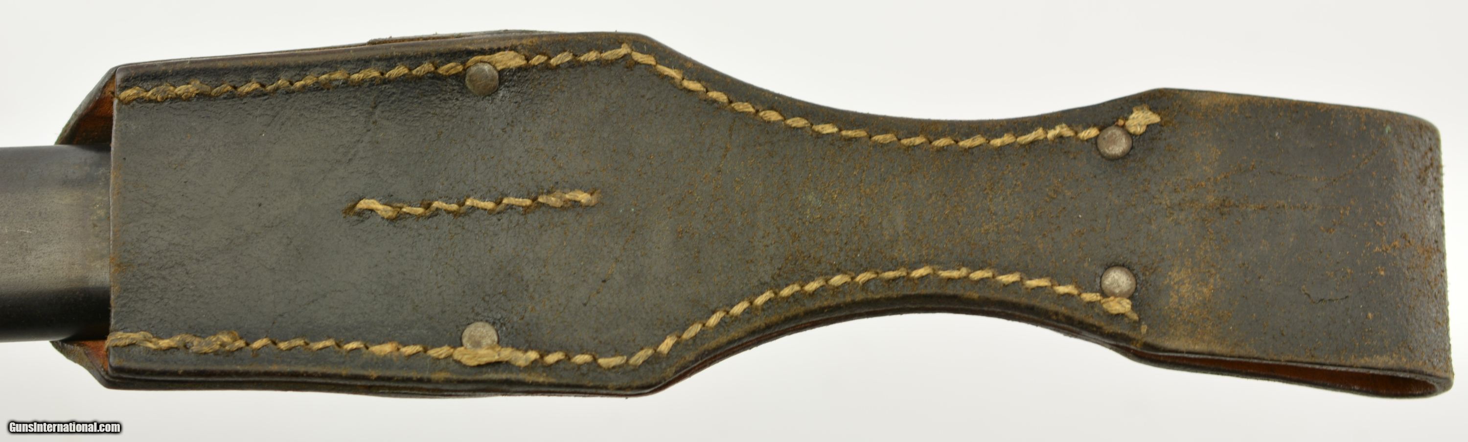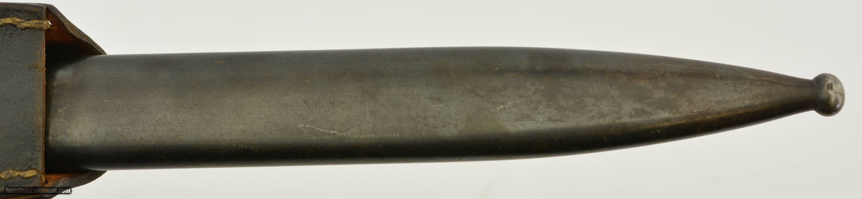 Description: This is a German, WWII Mauser 98 Bayonet with matching numbered scabbard and leather frog. It measures 15 15/16" (385 mm) overall with a 9 7/8" (252 mm) heavily blued and fullered blade numbered “8416" on the ricasso (matching the numbers on the scabbard throat) and “S/155G" on the reverse. In near excellent condition the blade gray thinning on the high points with light freckling. The flashguard sports a small German Eagle Waffen-amt mark. The wood grips are excellent with light scratches and have a crudely carved Swastika about 1/4" in diameter and the pommel has “WaA 256" markings. The steel scabbard is matching numbered and thinned to a plum-brown with light use marks and is in a leather frog which remains supple. SOLD |