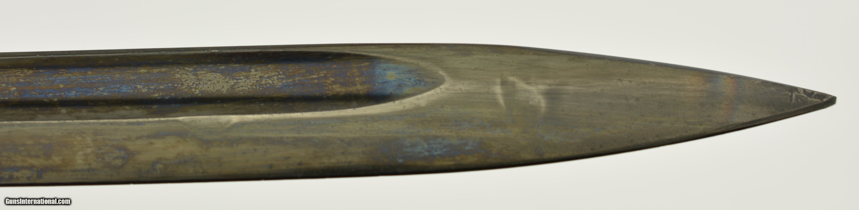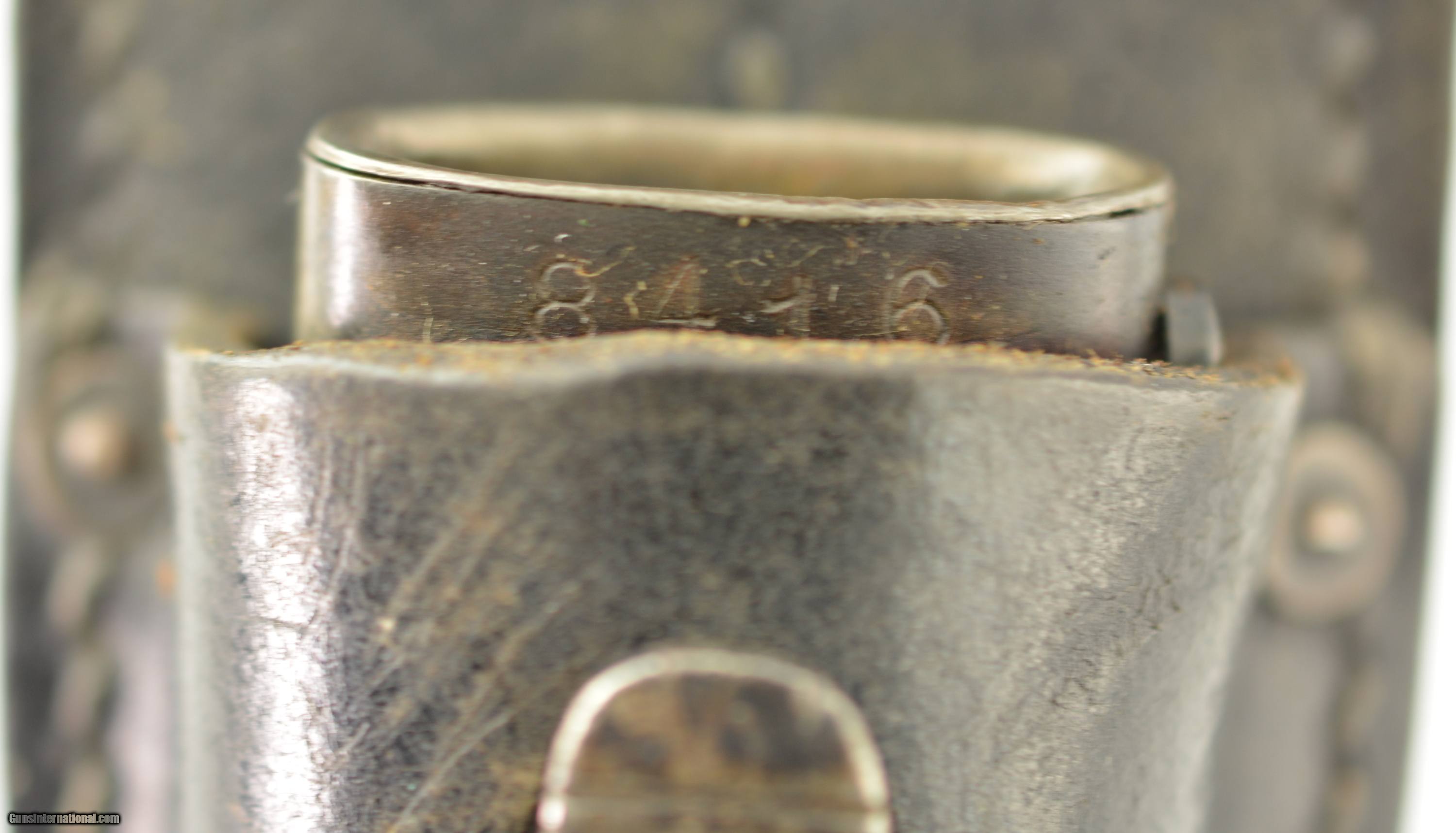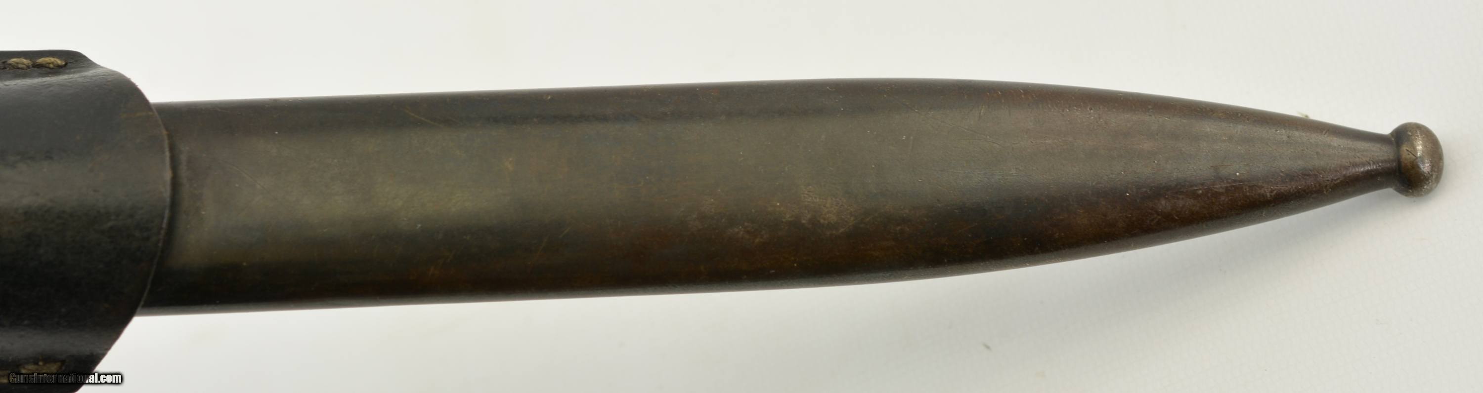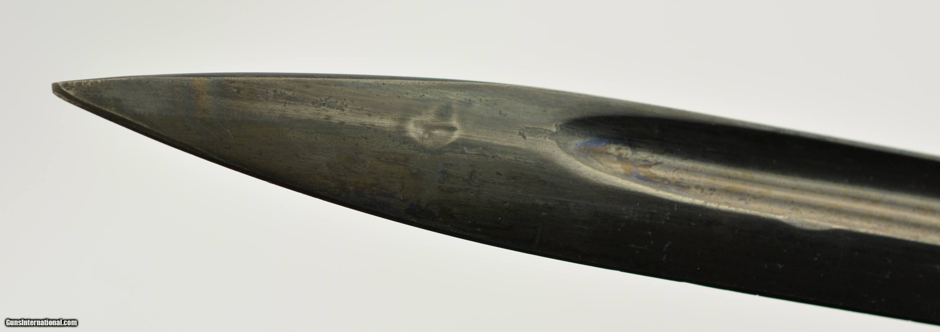 Description: This is a German, WWII Mauser 98 Bayonet with matching numbered scabbard and leather frog. It measures 15 15/16" (385 mm) overall with a 9 7/8" (252 mm) heavily blued and fullered blade numbered “8416" on the ricasso (matching the numbers on the scabbard throat) and “S/155G" on the reverse. In near excellent condition the blade gray thinning on the high points with light freckling. The flashguard sports a small German Eagle Waffen-amt mark. The wood grips are excellent with light scratches and have a crudely carved Swastika about 1/4" in diameter and the pommel has “WaA 256" markings. The steel scabbard is matching numbered and thinned to a plum-brown with light use marks and is in a leather frog which remains supple. SOLD |