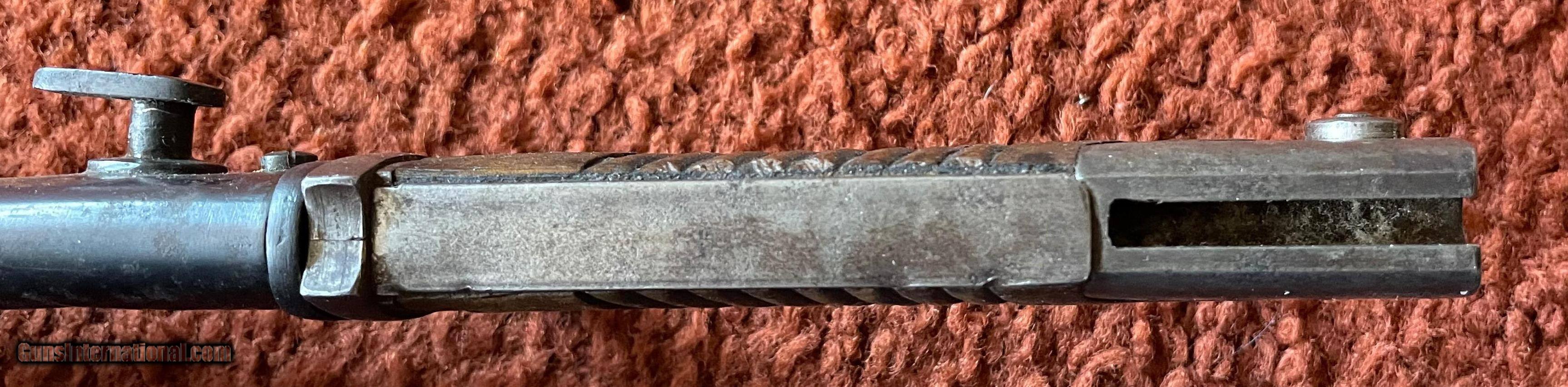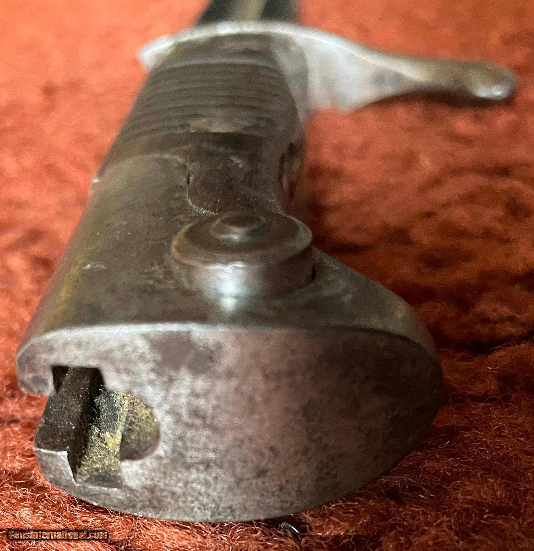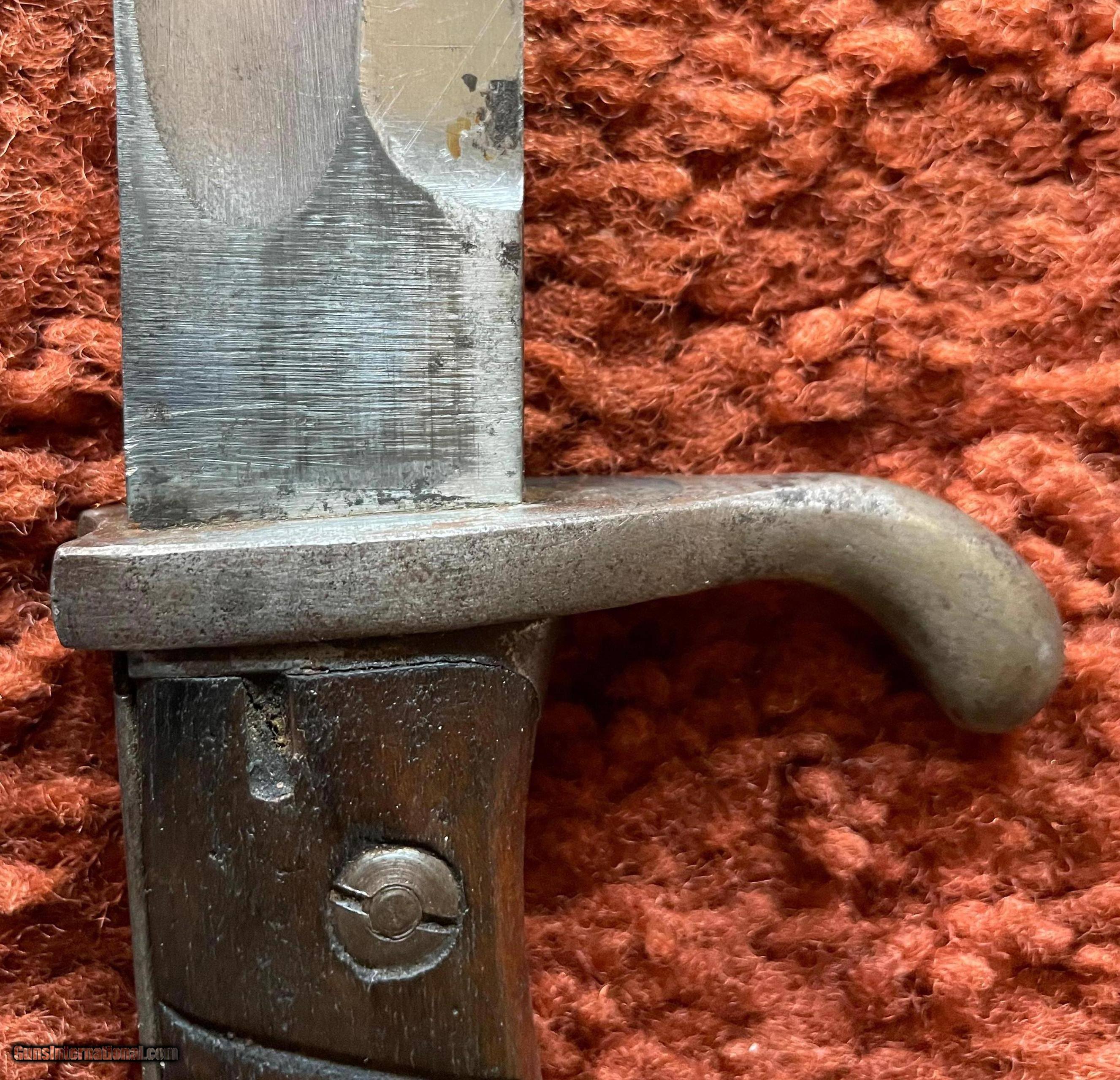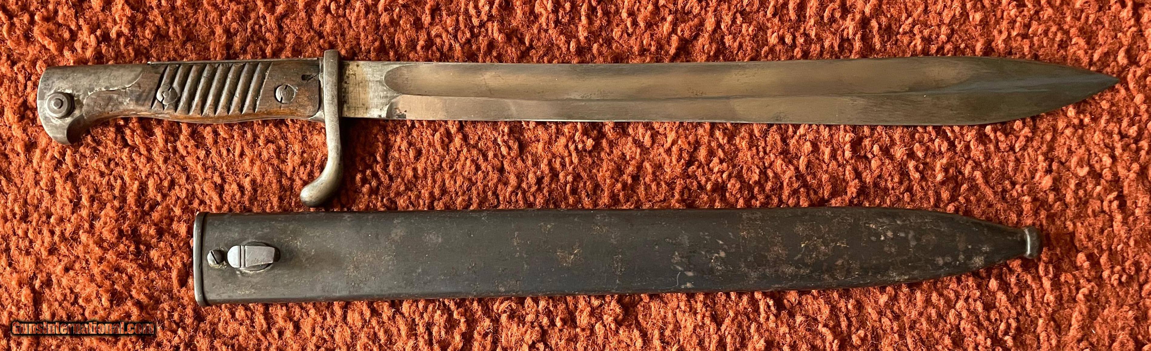 Description: This bayomet fits the 1898 Mauser rifle and carbine. Overall length in scabbard 20.65" Blade length 14.5" See photos for condition. SOLD |