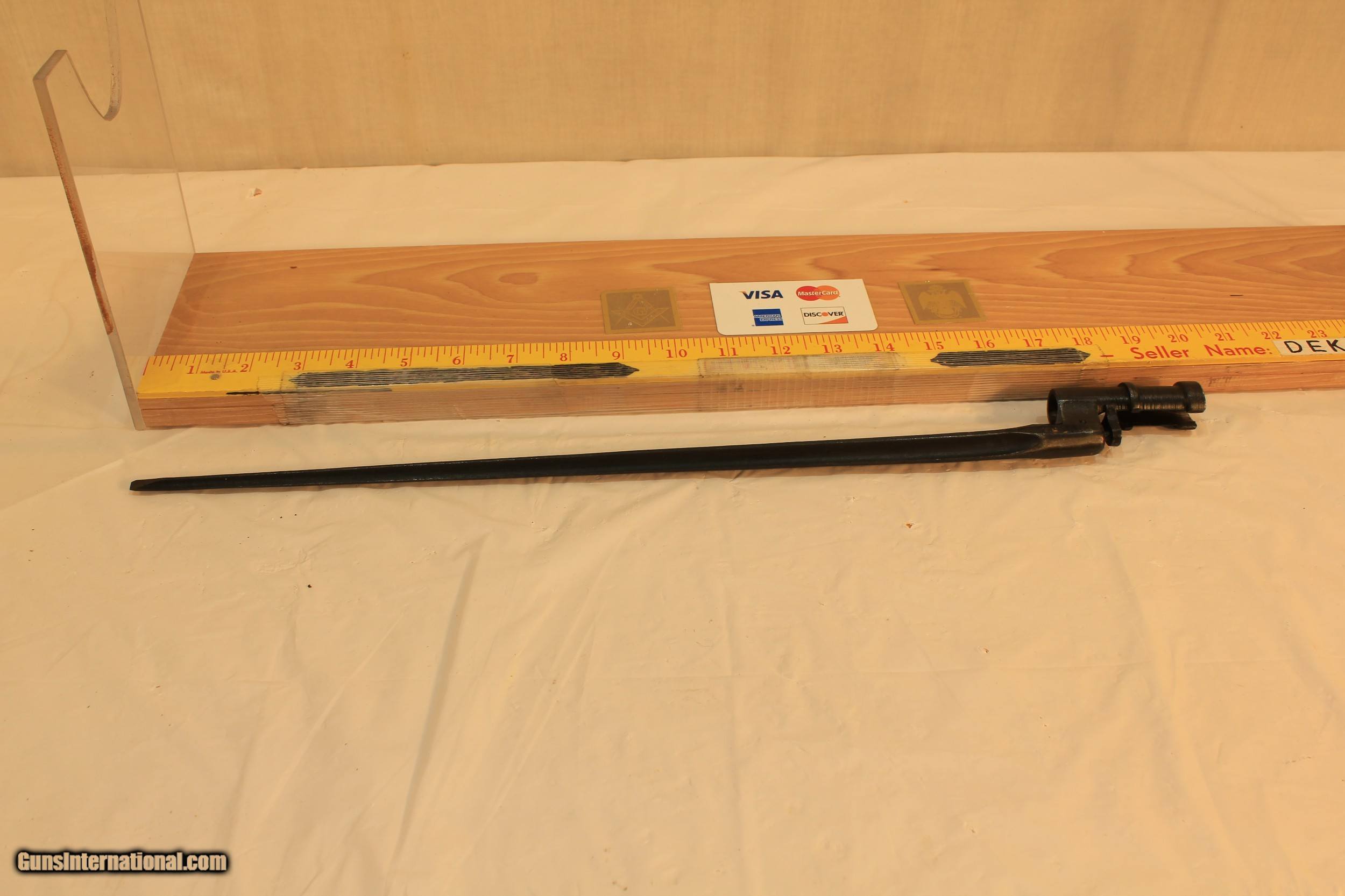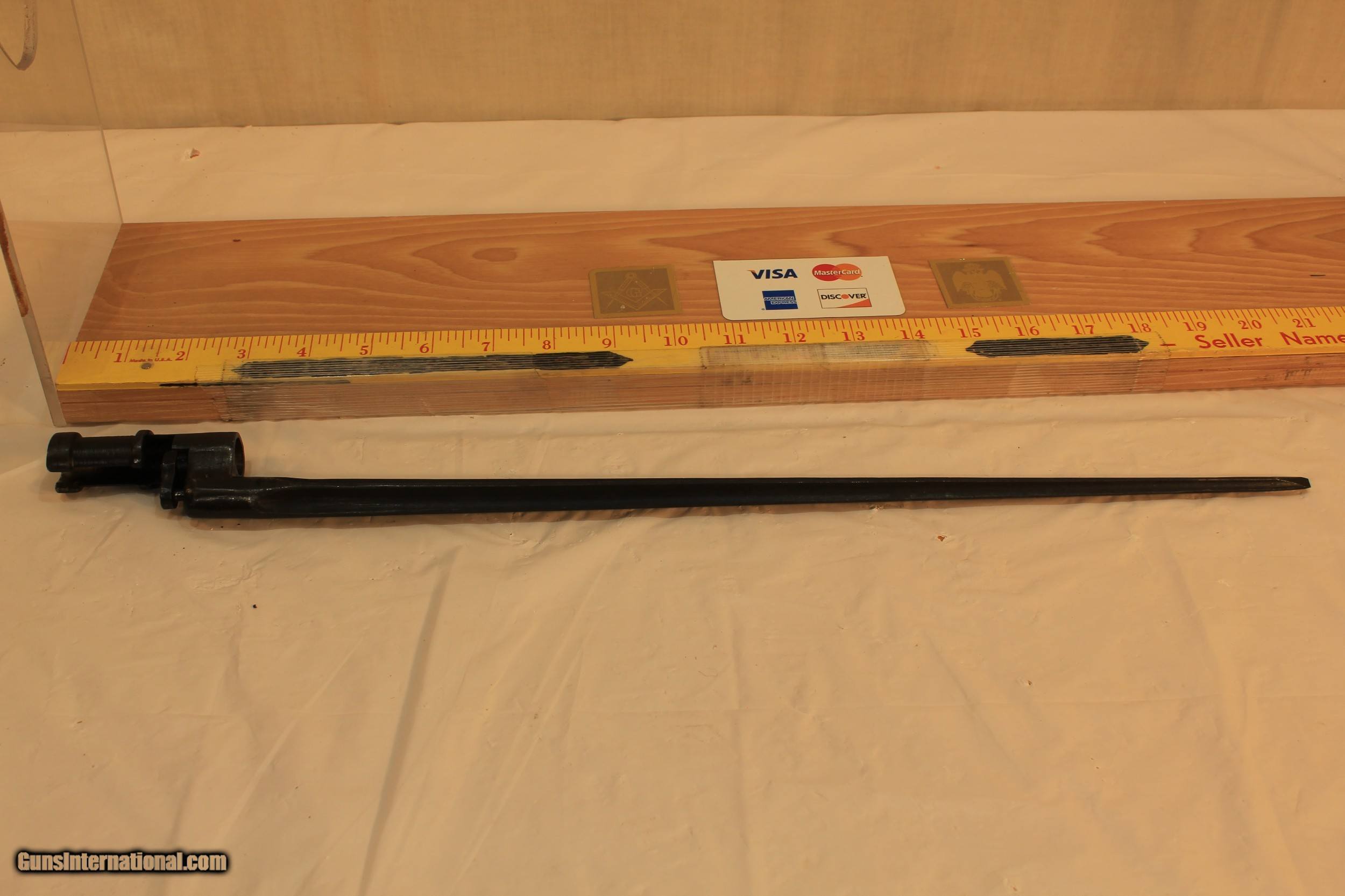 Description: Mosin-Nagant Triangular Bayonet. Overall Length is 20 inches and has a 17 inch triangular spike. Good condition. The pictures are part of the discription. Please use the ZOOM feature. SOLD |