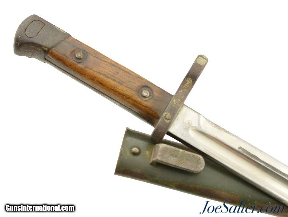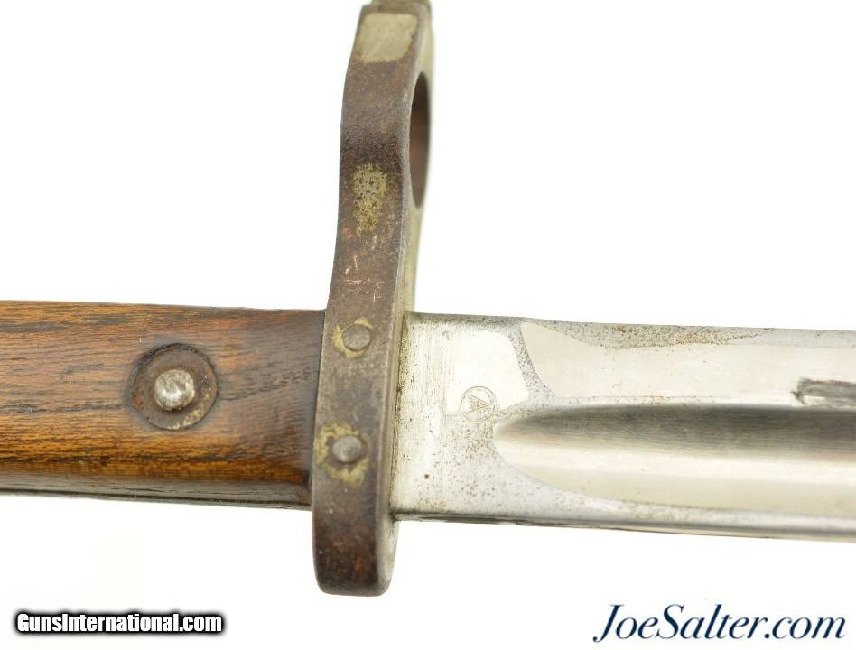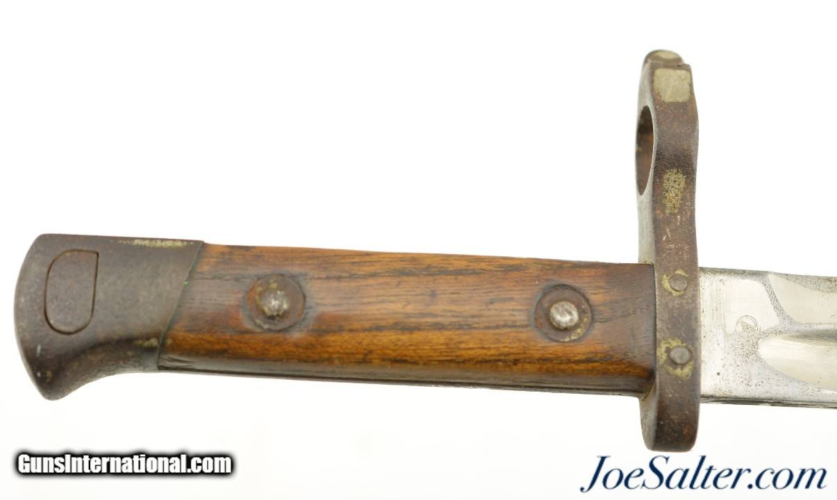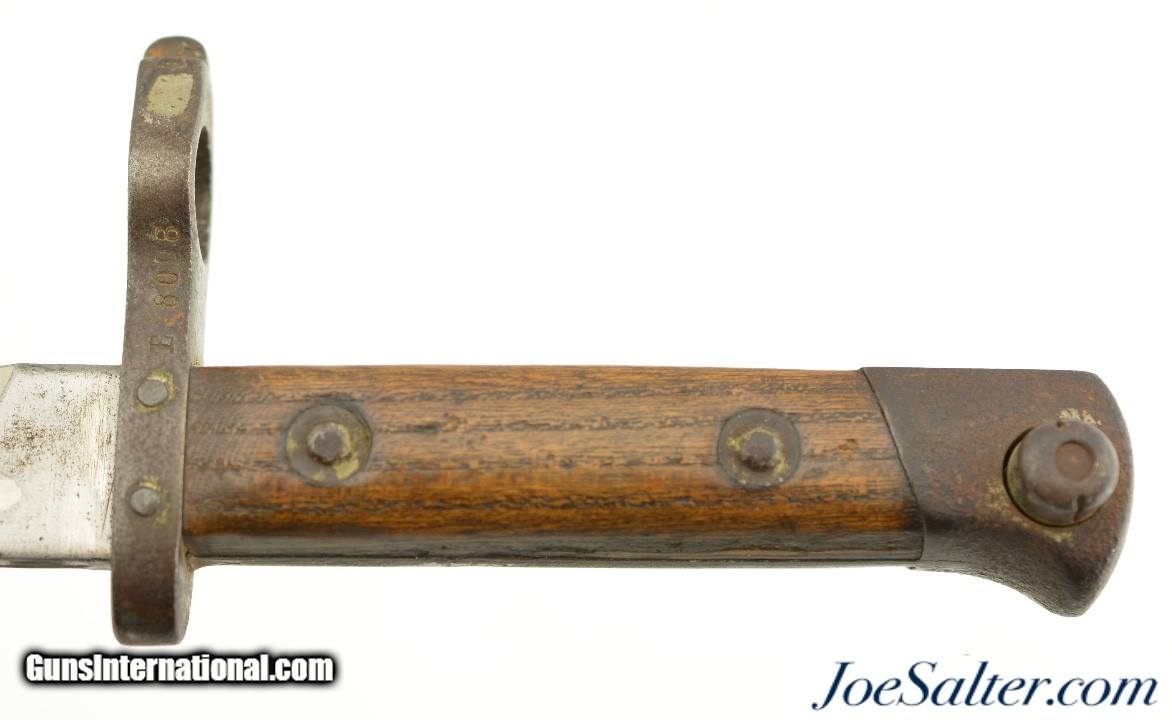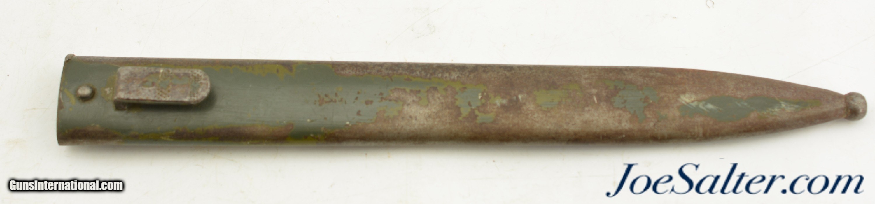 Description: This is an Original Austrian Mannlicher M1895 Carbine and Short Rifle Bayonet with Muzzle Ring Sight & Scabbard in very good condition, the original 9 5/8" bright finish blade, with very little oxidation or damage of any kind. The ricasso is marked with an A inside a circle and the guard is marked E 8098. There is some light wear on the wooden grip scales. The steel scabbard was originally blued, but then painted green, a very common color used during WWI to repaint scabbards. This is now mostly worn away, and there is very little denting of any kind on the scabbard.; Price: $239.00 Contact Seller |