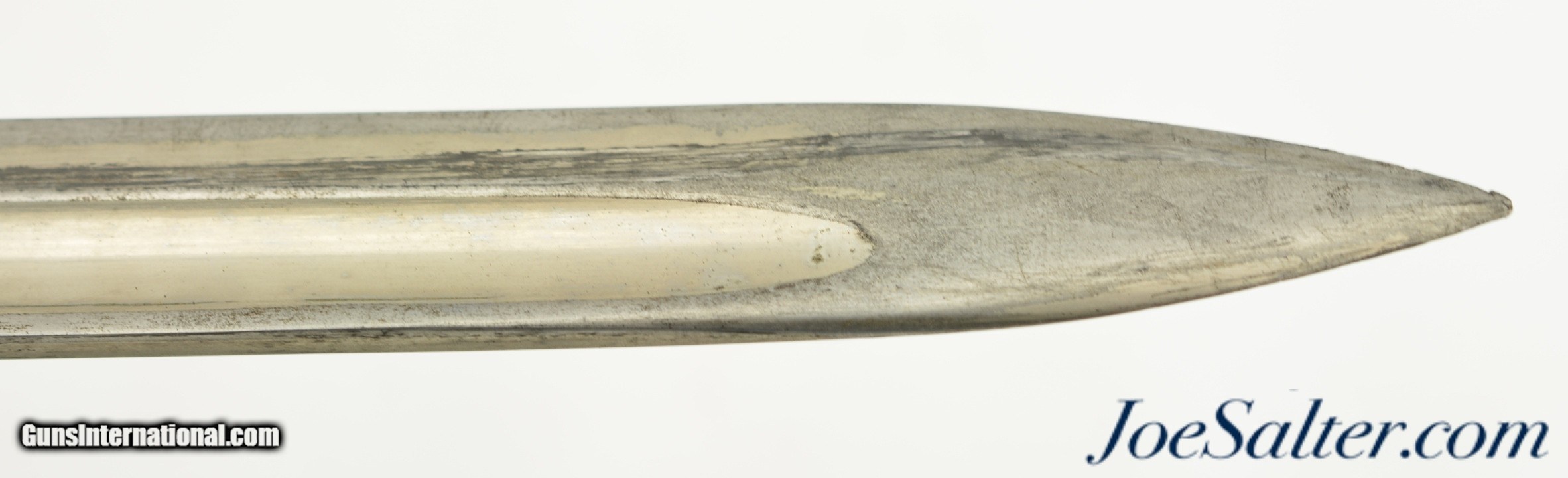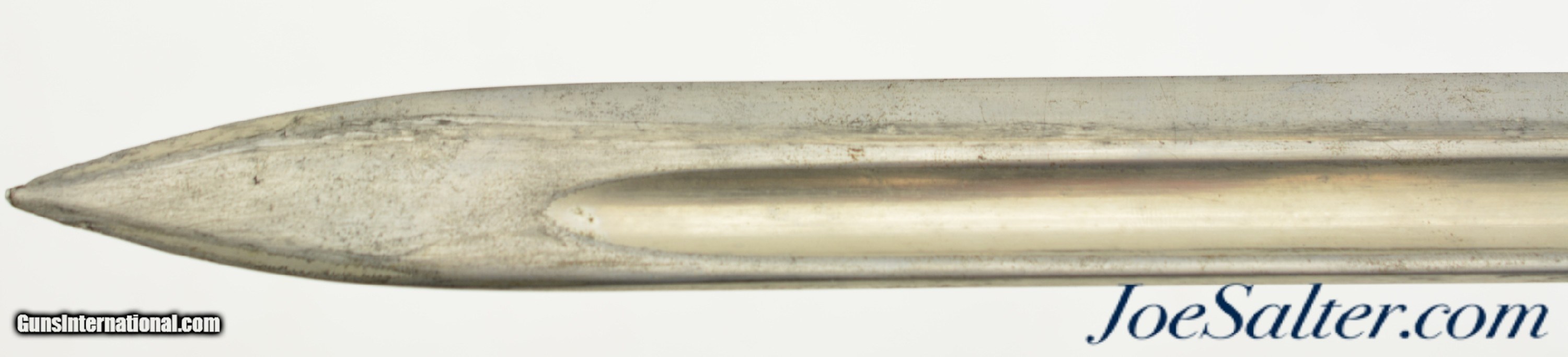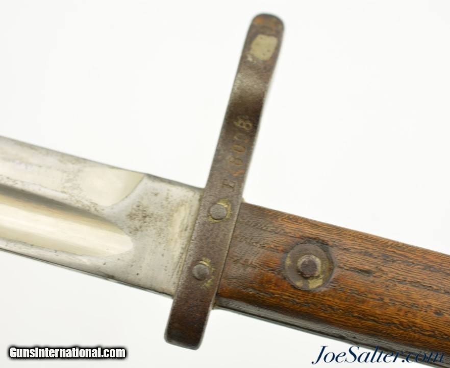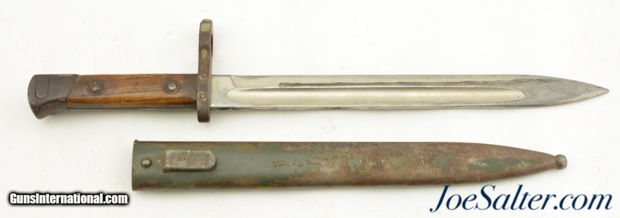 Description: This is an Original Austrian Mannlicher M1895 Carbine and Short Rifle Bayonet with Muzzle Ring Sight & Scabbard in very good condition, the original 9 5/8" bright finish blade, with very little oxidation or damage of any kind. The ricasso is marked with an A inside a circle and the guard is marked E 8098. There is some light wear on the wooden grip scales. The steel scabbard was originally blued, but then painted green, a very common color used during WWI to repaint scabbards. This is now mostly worn away, and there is very little denting of any kind on the scabbard.; Price: $239.00 Contact Seller |