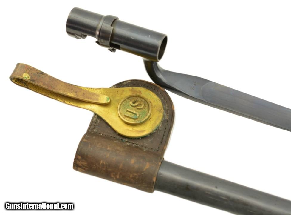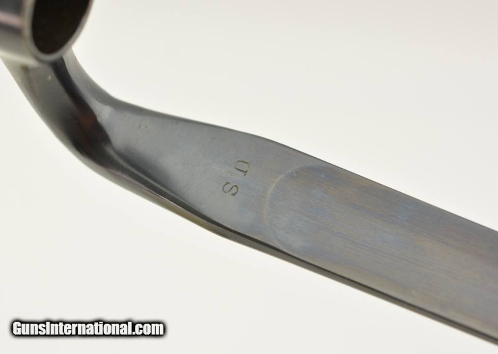 Description: This is an outstanding US M1873 Trapdoor Socket Bayonet with original scabbard and frog. The 18" blade retains 95-97% of the original bluing with US on the ricasso and blade is nearly free of any imperfections, only light marks from age with only a hint of oxidation at the point. The neck shows almost no wear on both sides which continues into the sides of the socket. The 3" socket is in excellent condition with light marks from use and very light oxidation. The excellent scabbard retains most of the original bluing with light oxidation, tiny scratches on a dent free surface. This comes with a third pattern, Hoffman device, leather and brass frog in excellent condition with the US on a stippled brass casting hook/hanger with some scattered verdigris, tight stitching and a fine original patina. This is one for the collection or a step up to a new standard. SOLD |