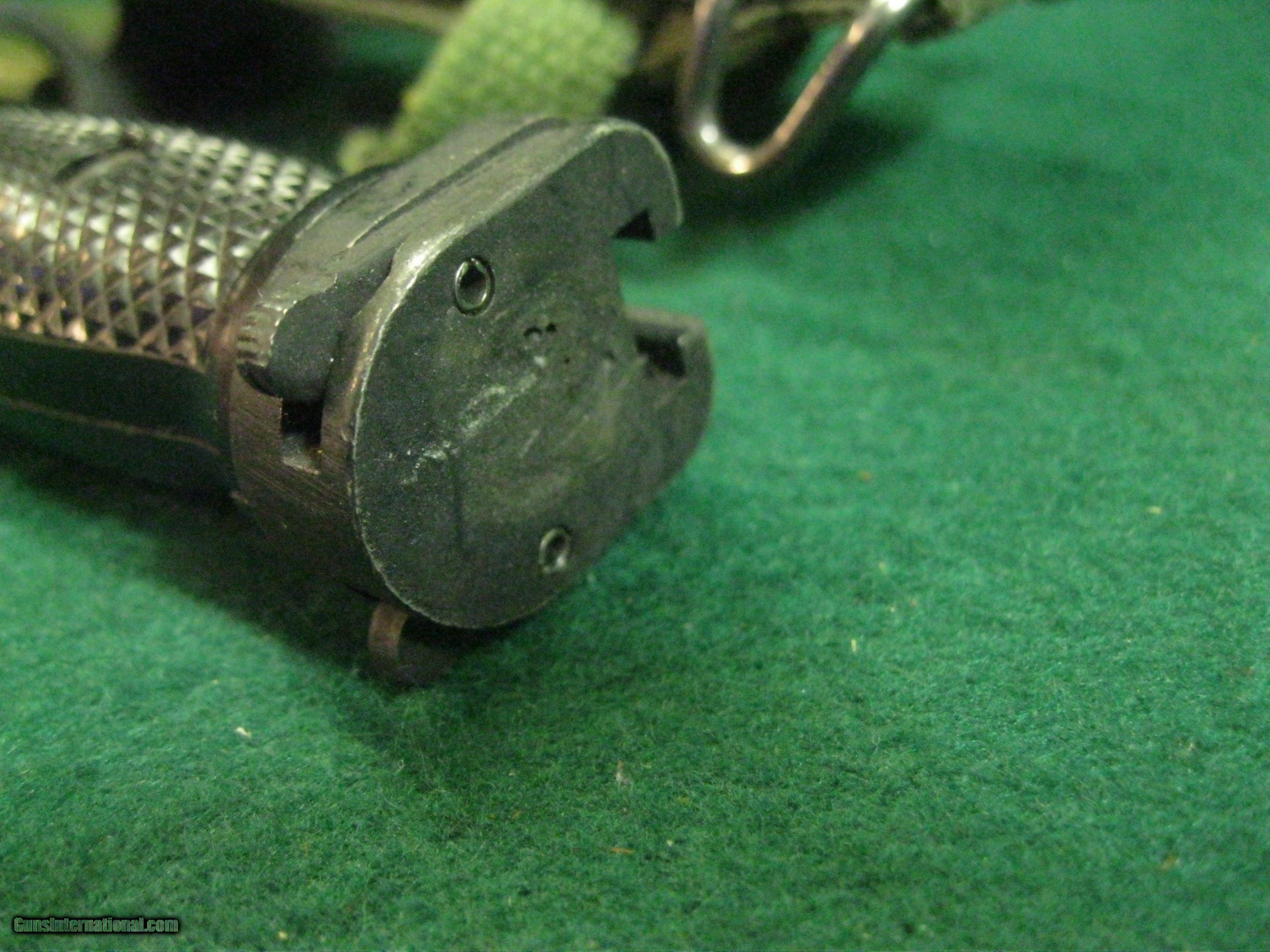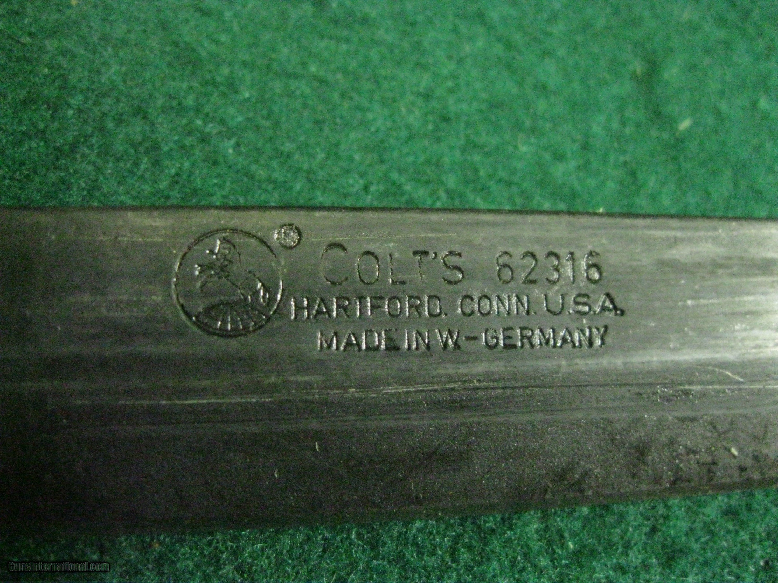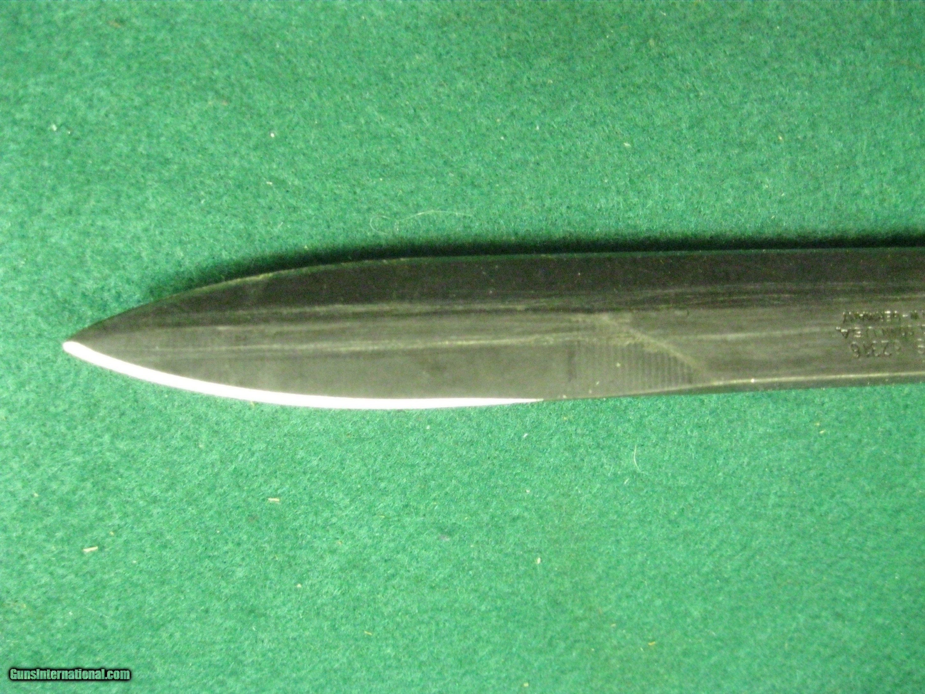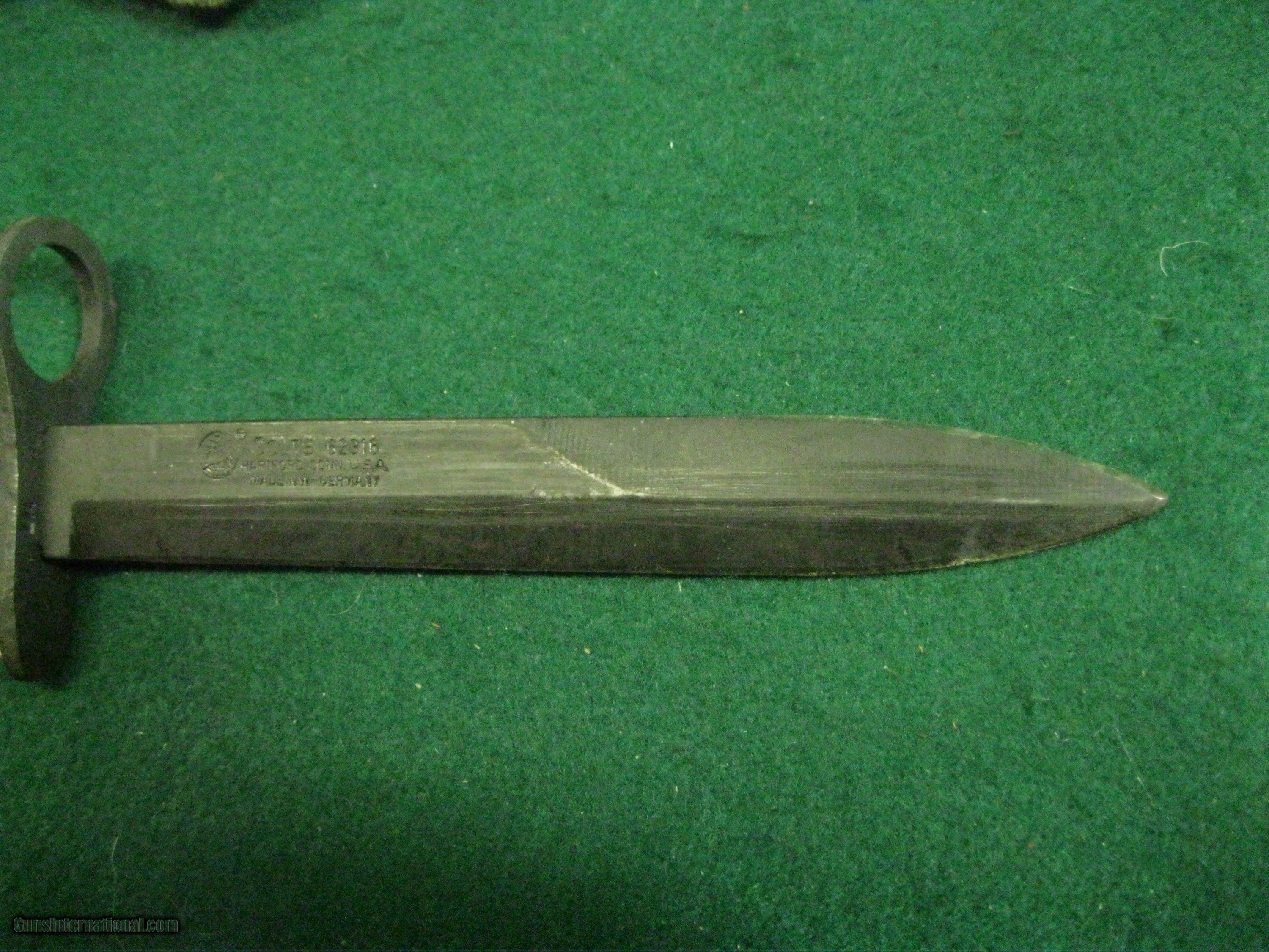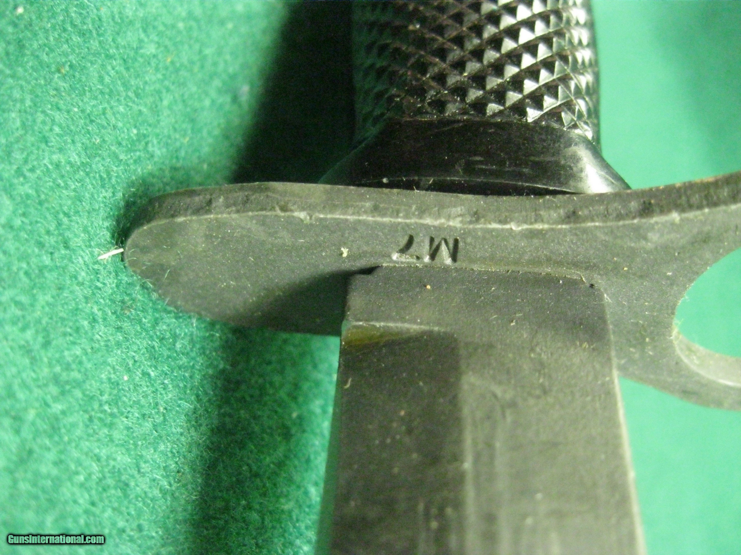 Description: ORIGINAL W. GERMAN MARKED US MODEL 7 COLT BAYONET WITH SCABBARD VIETNAM Rarely see "Made in W. Germany" stamped on blade. Never used or sharpened. Dried Grease & small marks on blade from going in & out of scabbard Shipping $10 SOLD |