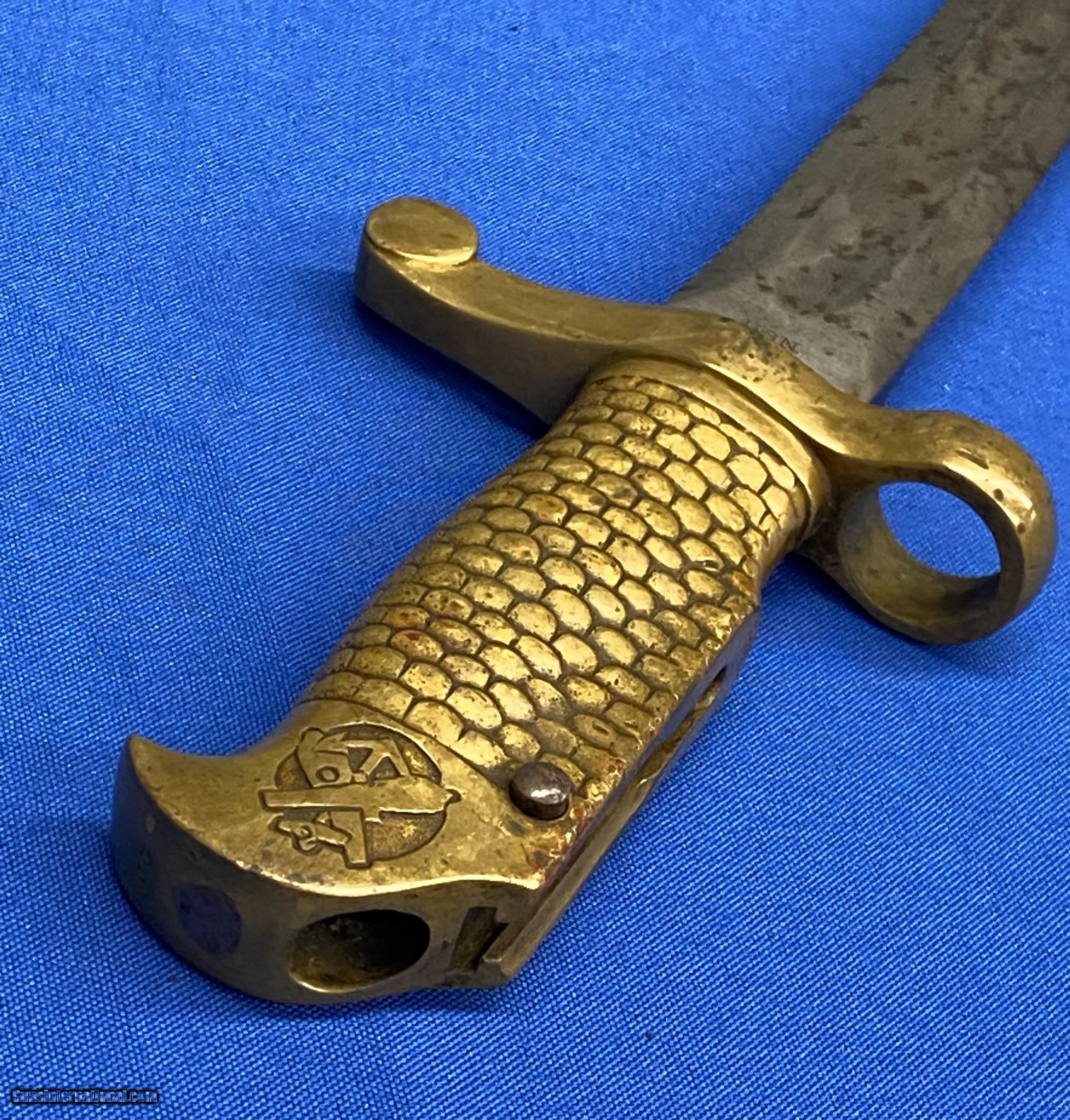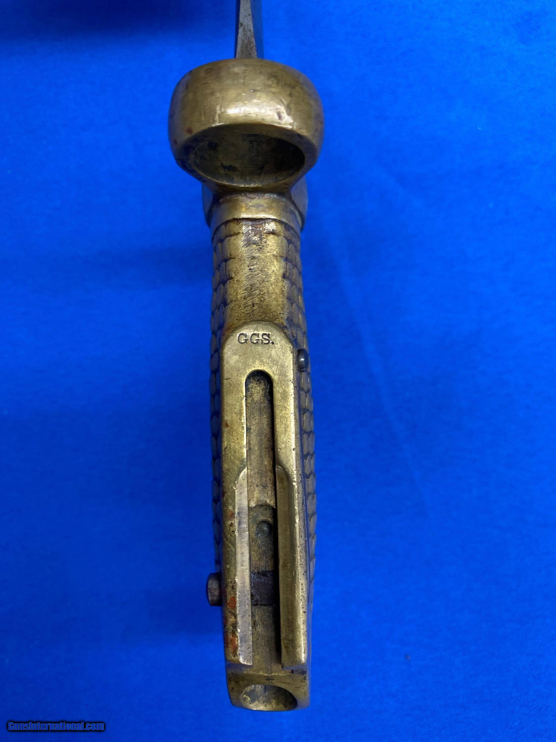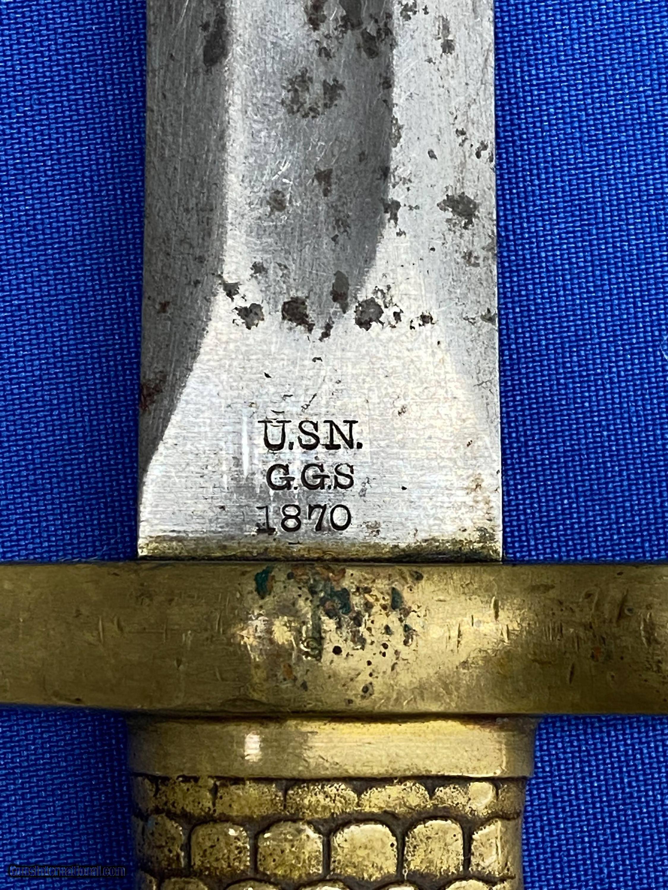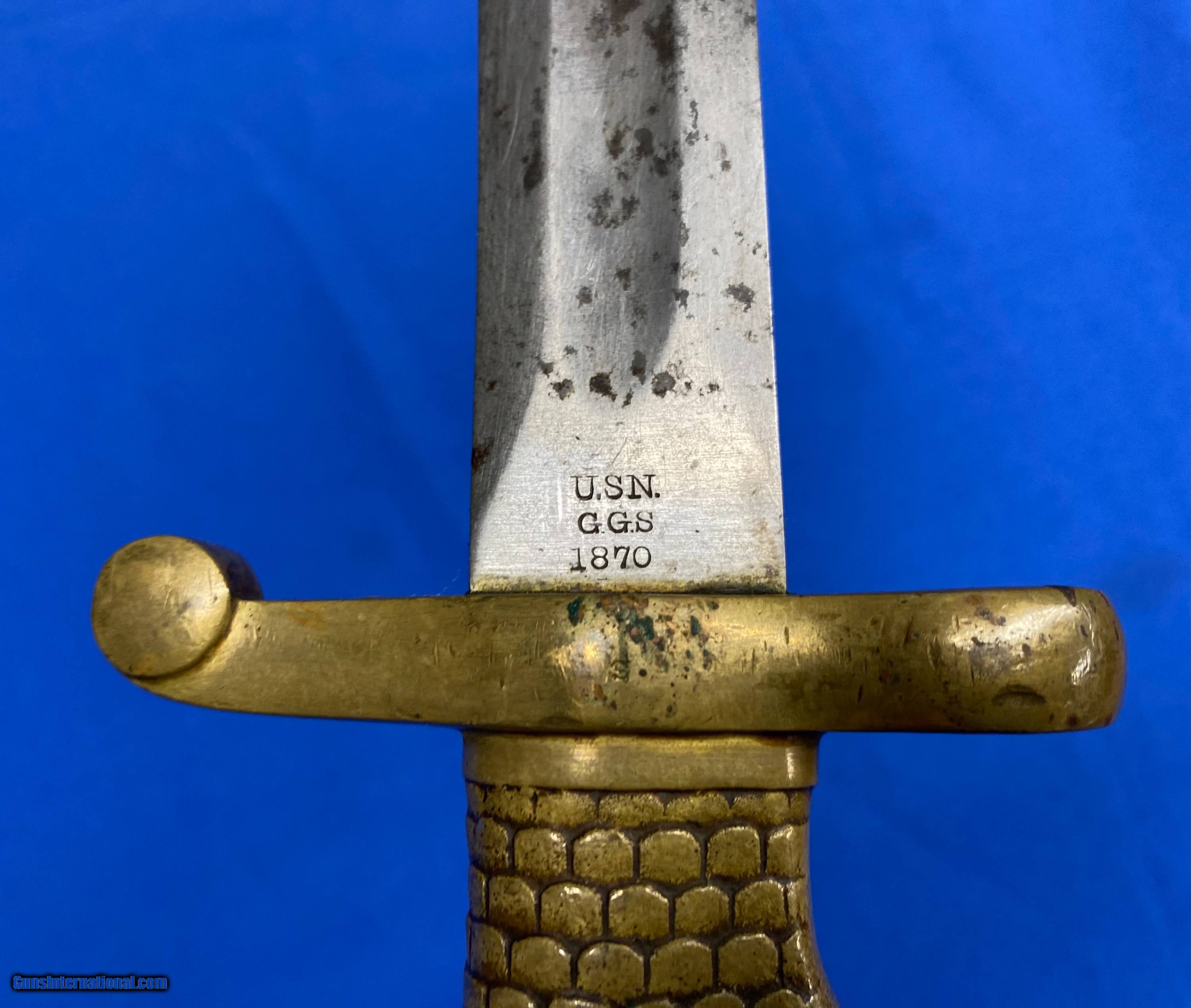 Description: This is an original, rare and lesser known of the Post Civil War Naval brass hilted bayonets for the U.S. Navy M1870 Remington Rolling block rifle, the Type 2 being somewhat more distinctive. It is a lovely yataghan style sword bayonet with a 20" blade, measuring 25” overall. It features a distinctive solid brass hilt with a feather/scale design cast into the grip. The blade is marked on one side “Ames Co. Chicopee, Mass”. The other side is marked U.S.N. G.G.S. 1870. The pommel is cast with the U.S. Crossed Cannons overlaying an Anchor and still bears the U.S. Inspector's initials of G.G.S. it is in nice untouched condition with some staining but is still in great shape. SOLD |